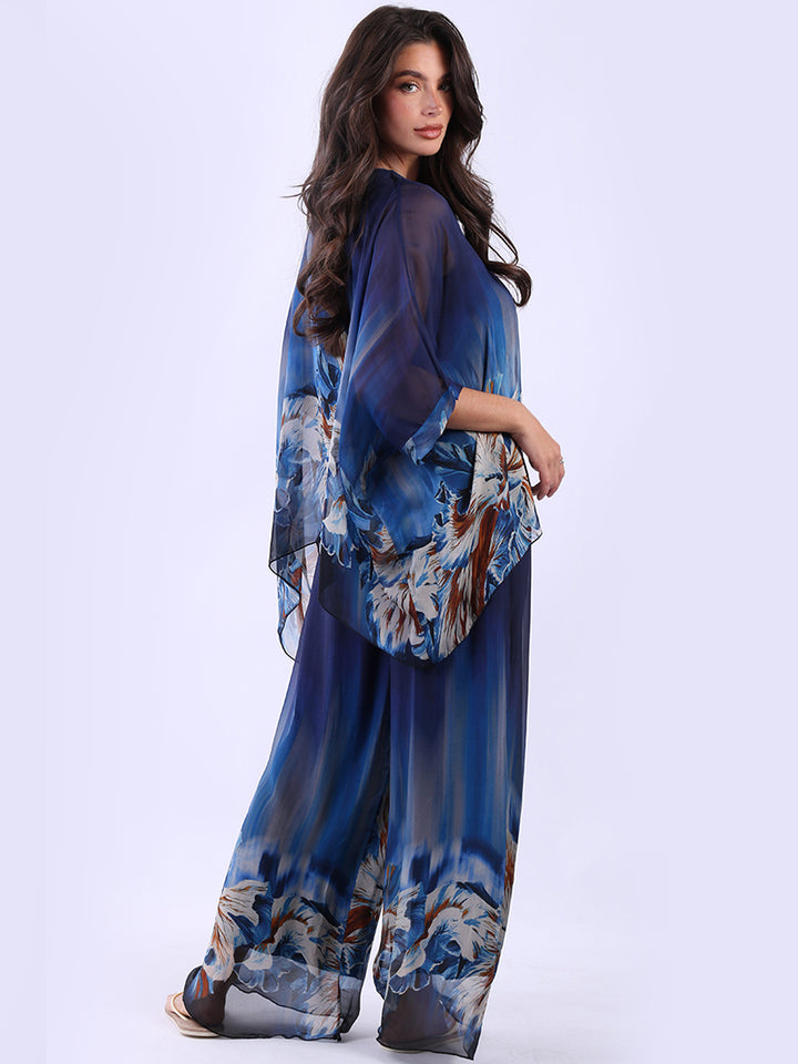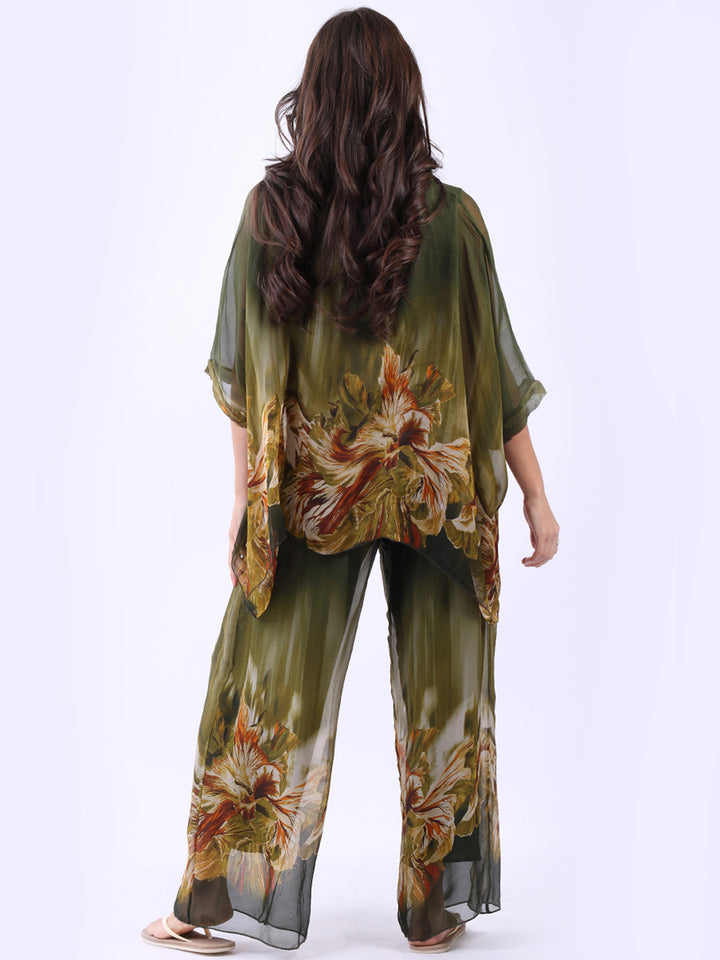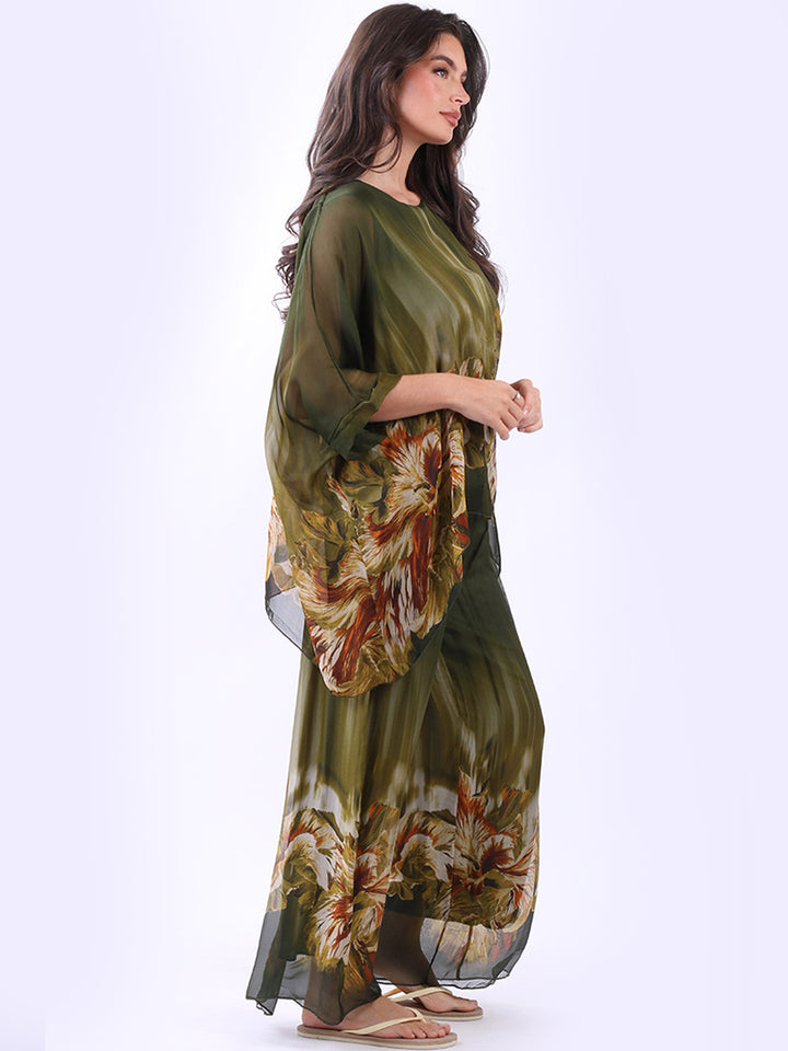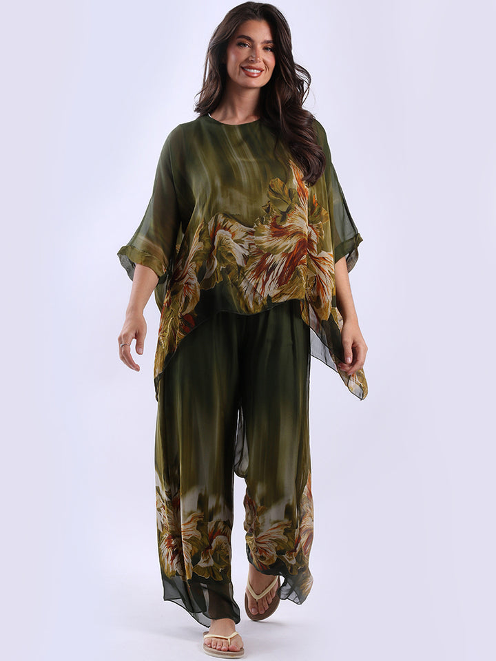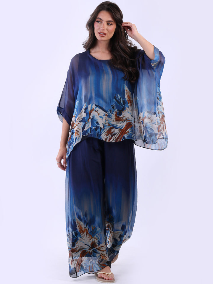 Redwholesale Fashion Boutique designs this 2 layered silk tunic to elevate women wearers wardrobe with effortless elegance. Made in Italy from a premium quality silk blend, this tunic-style top has a flattering bay neckline, relaxed batwing sleeves, and a delicate floral print that adds a touch of femininity. Mix and match this soft, flowy silhouette that drapes beautifully on all body types with wide leg trousers