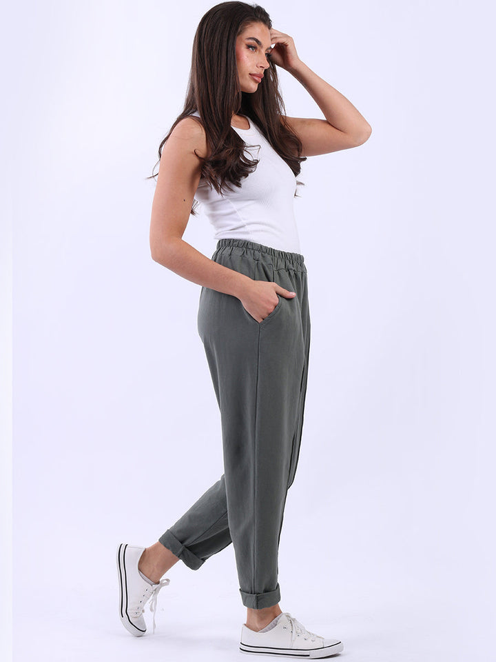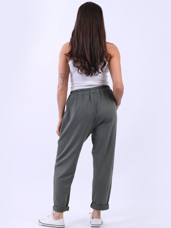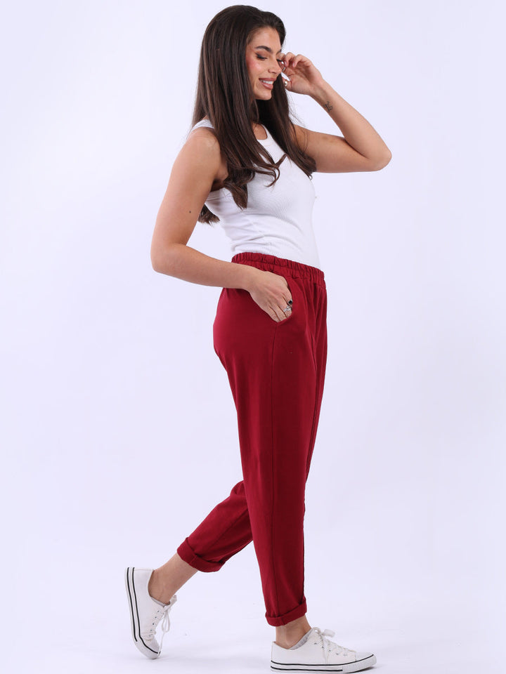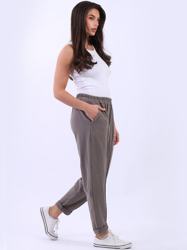 Opt for old-money aesthetics with these made-in-Italy regular-fit cotton joggers brought to women by Wholesale Fashion Store London. These pants feature a comfortable elastic waist and practical side pockets while keeping the overall design simple with a plain hue and rolled-up hem.