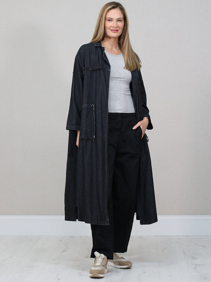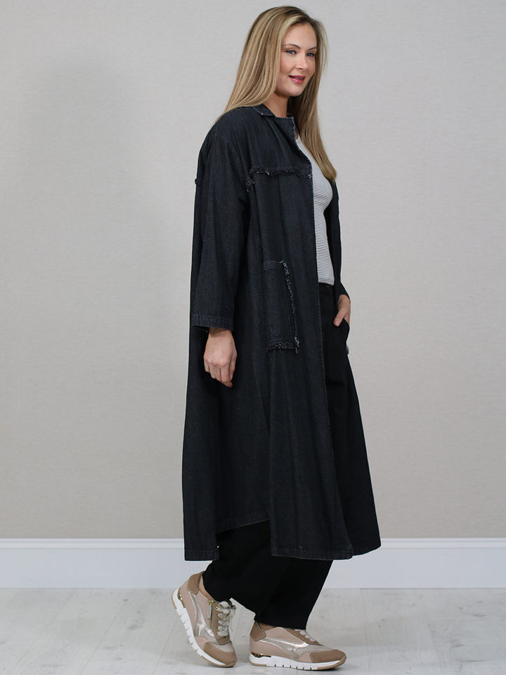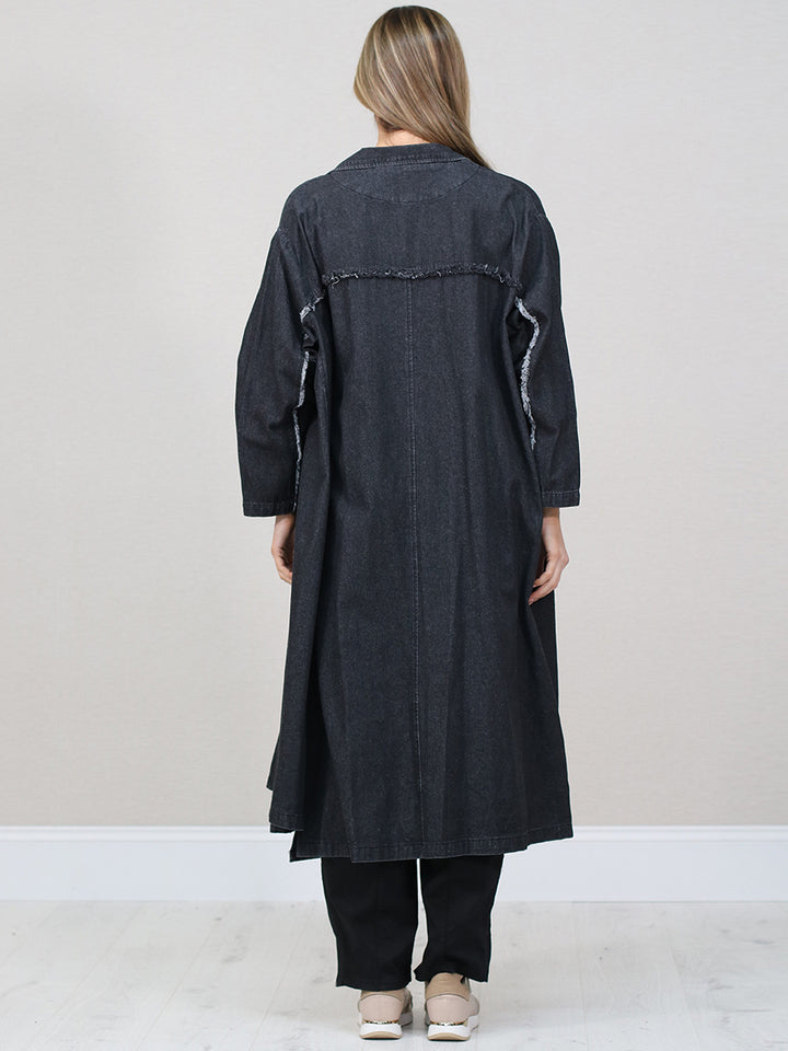 A versatile, longline, and oversized denim jacket offering a stylish yet casual look suitable for layering over various outfits for different seasons.
