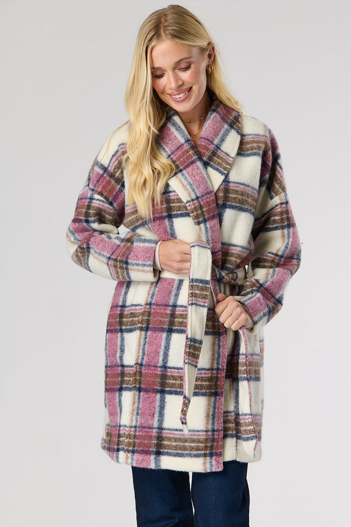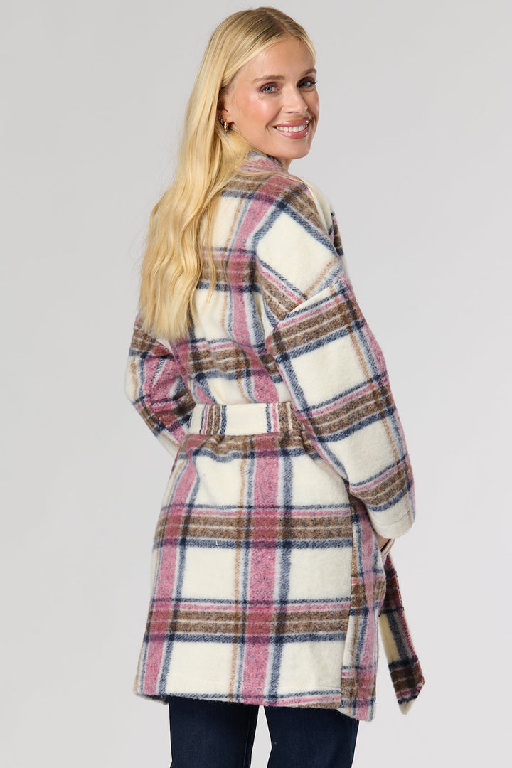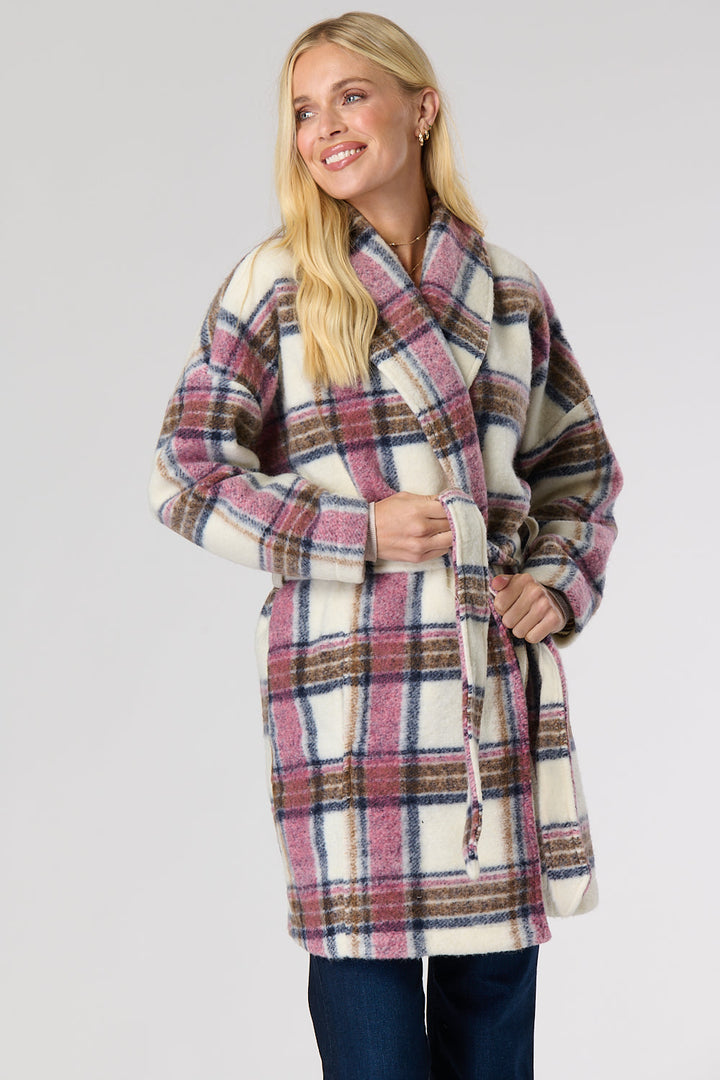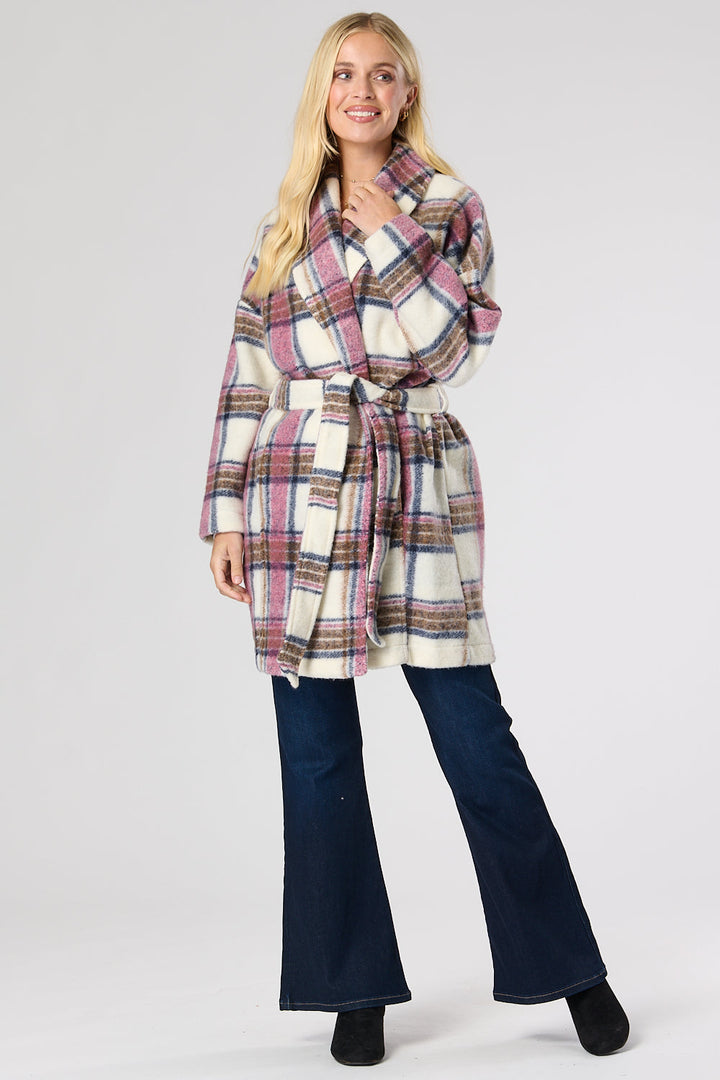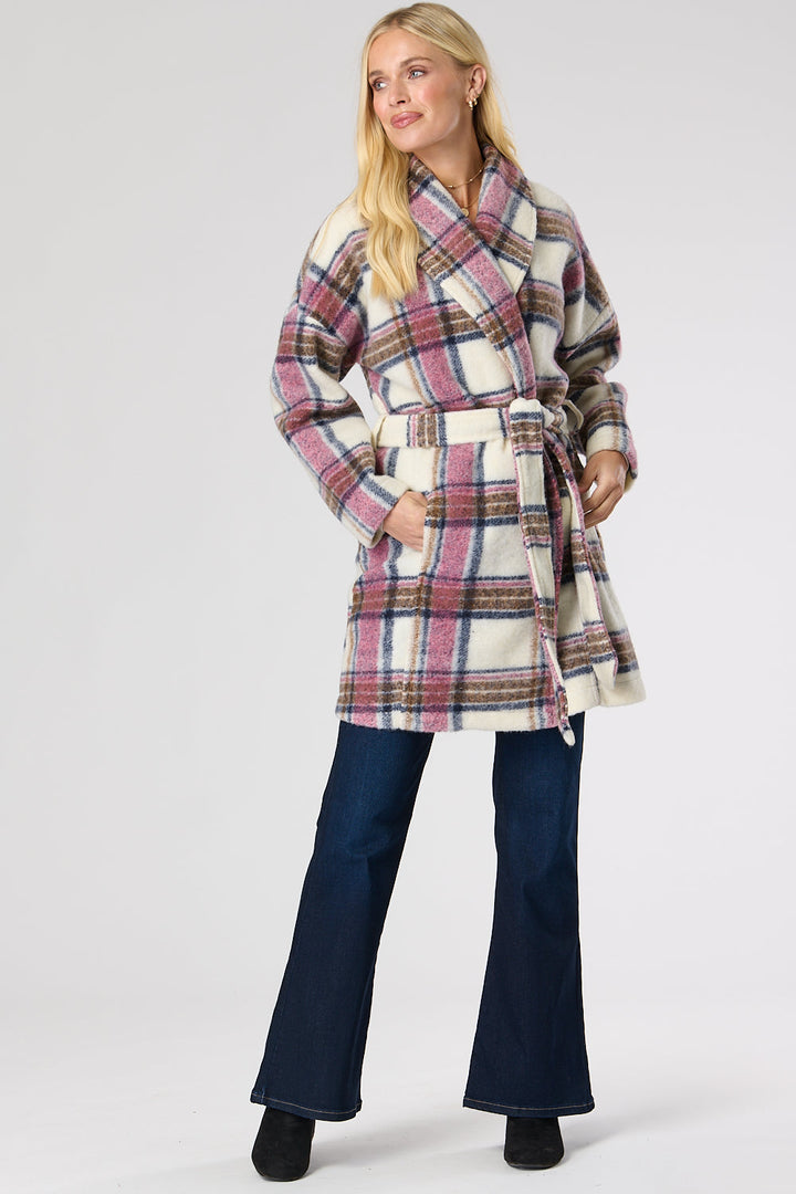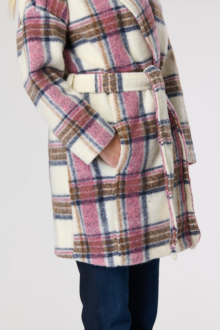 Check wool mix wrap over winter coat featuring stylish side pockets with a belt to provide a figure flattering look.