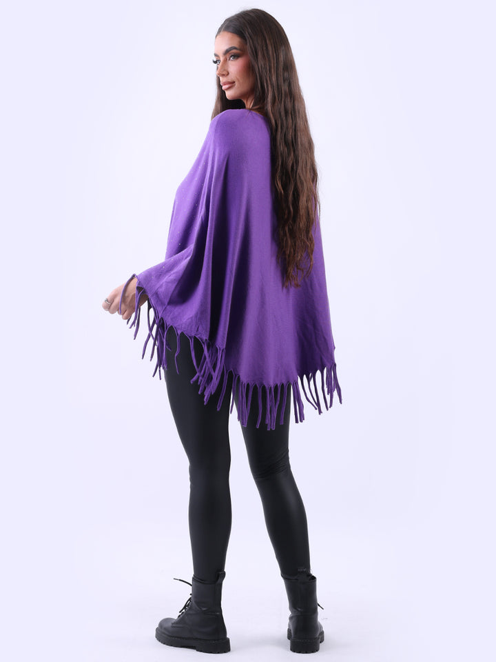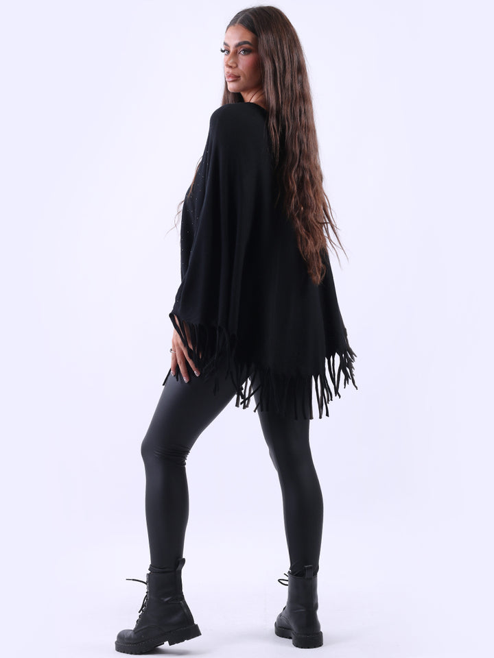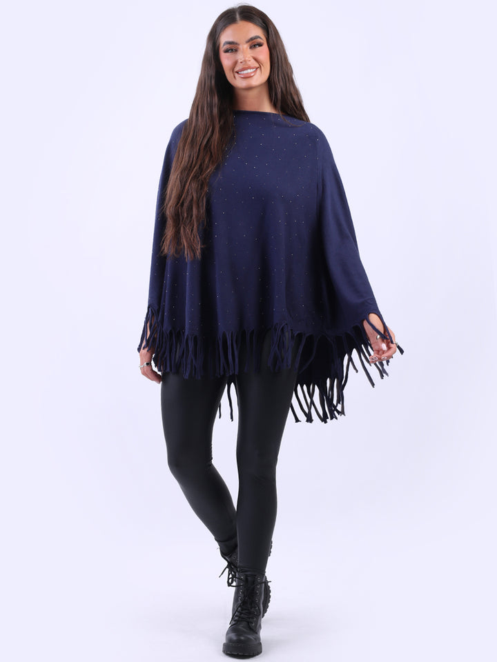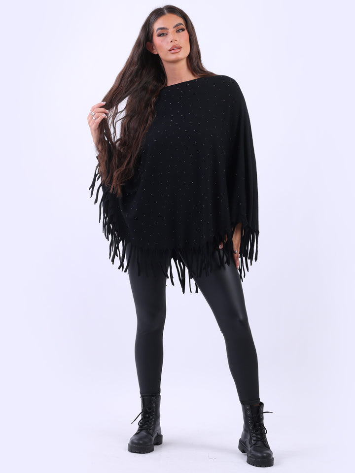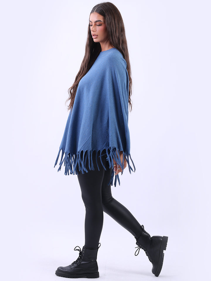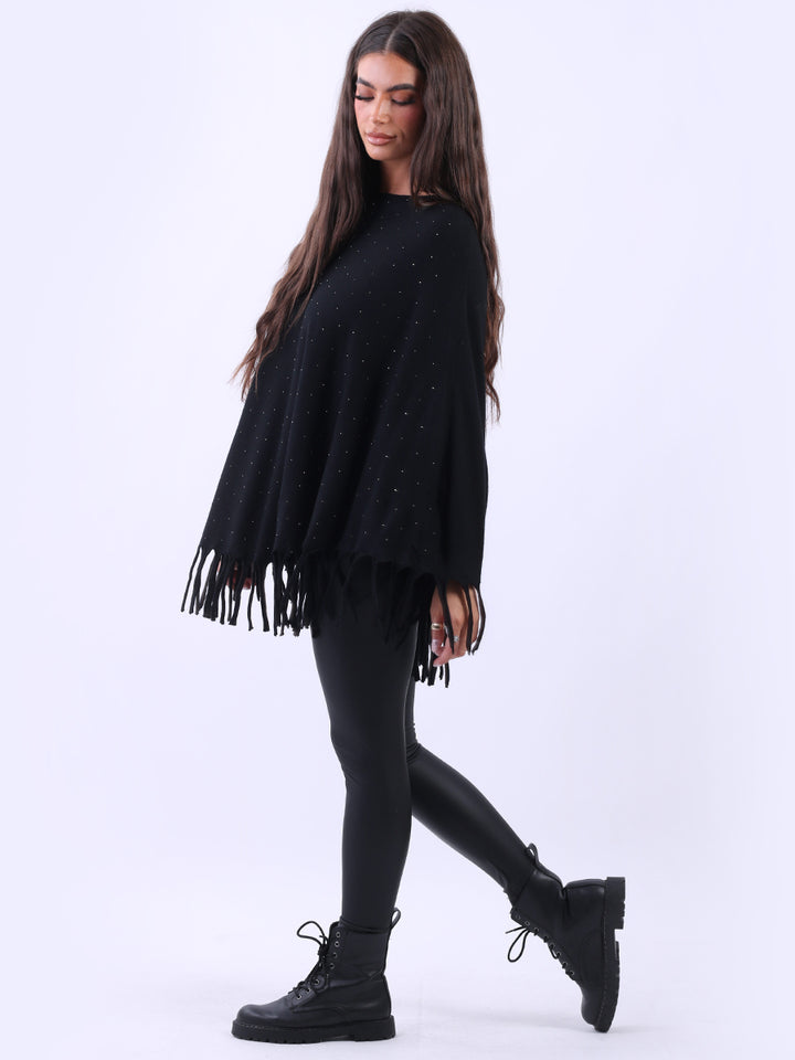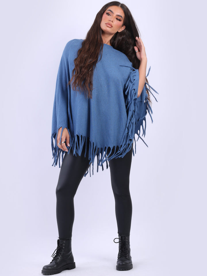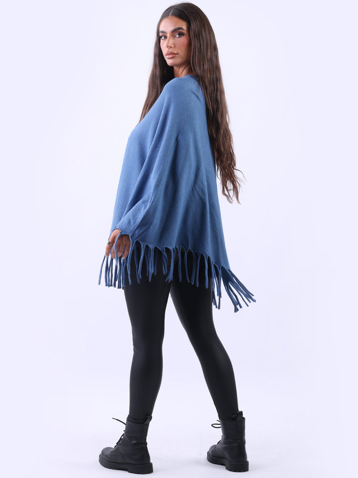 Chunky Fringed-Hem Glittery Women Knitted Poncho
