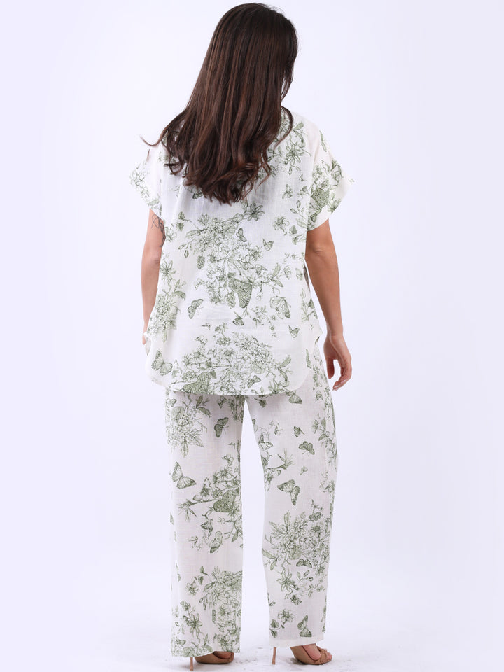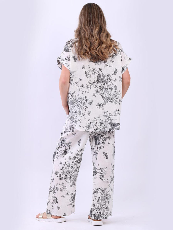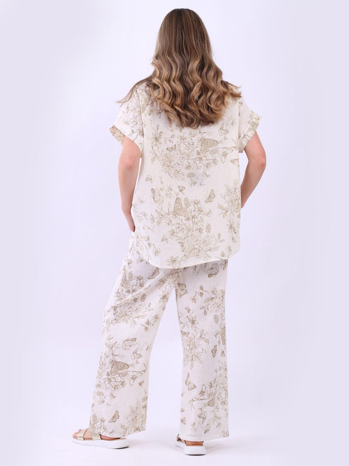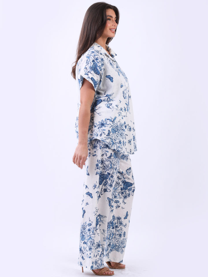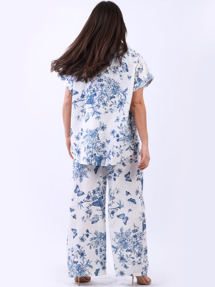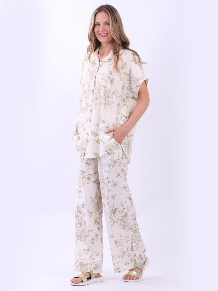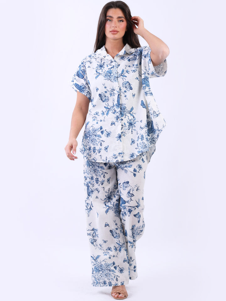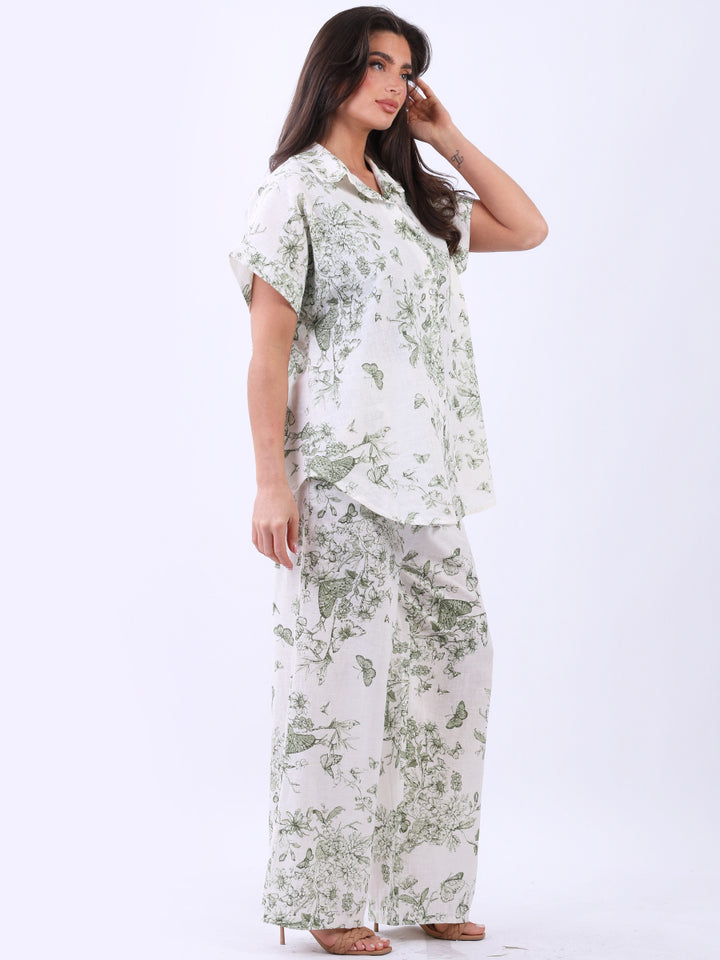 Delightful addition to a woman wardrobe this made in Italy pure and authentic linen shirt has all the features that are in high demand ladies love to have the comfort of breathable and skin friendly linen cotton duo yet not compromising on delightful and classy features like wide collar neckline, practical front button enclosure, short sleeves and baggy plus size finish the unique and artesian bloom and butterfly print add a touch of timeless classiness to the final look. It’s easy to personalize with wide leg pants and a duffel bag to work.