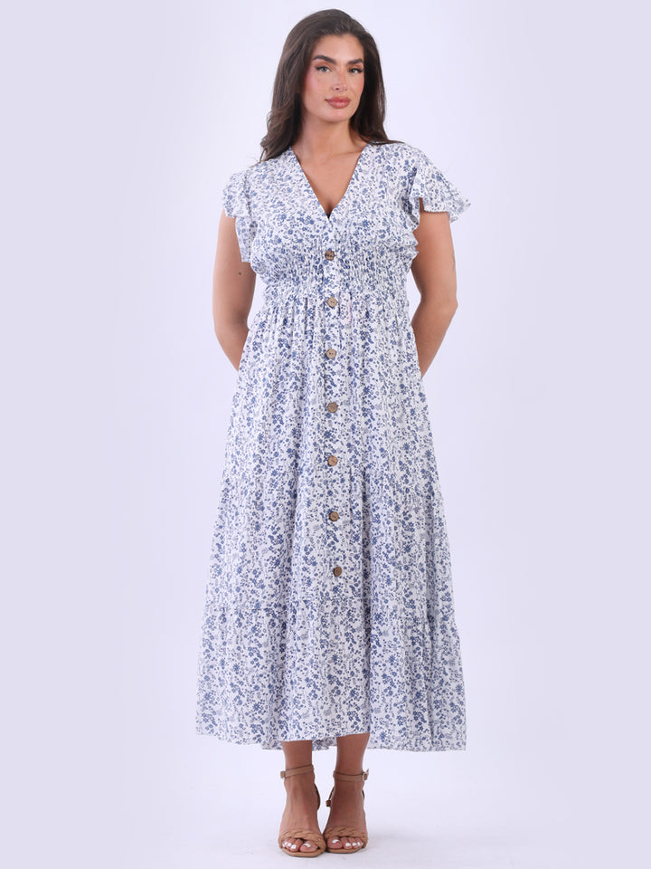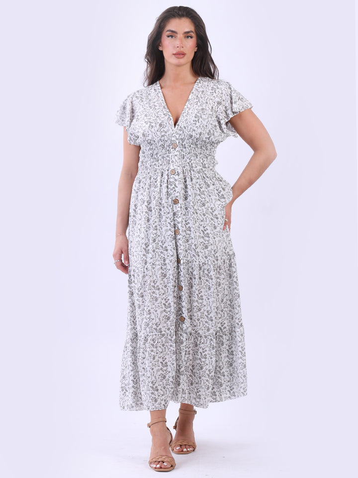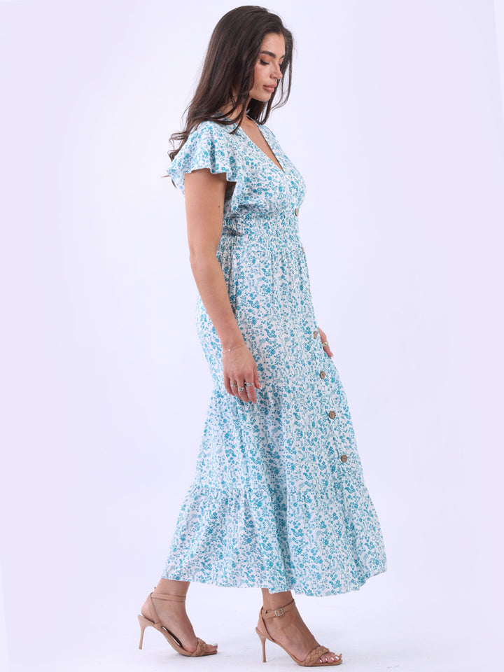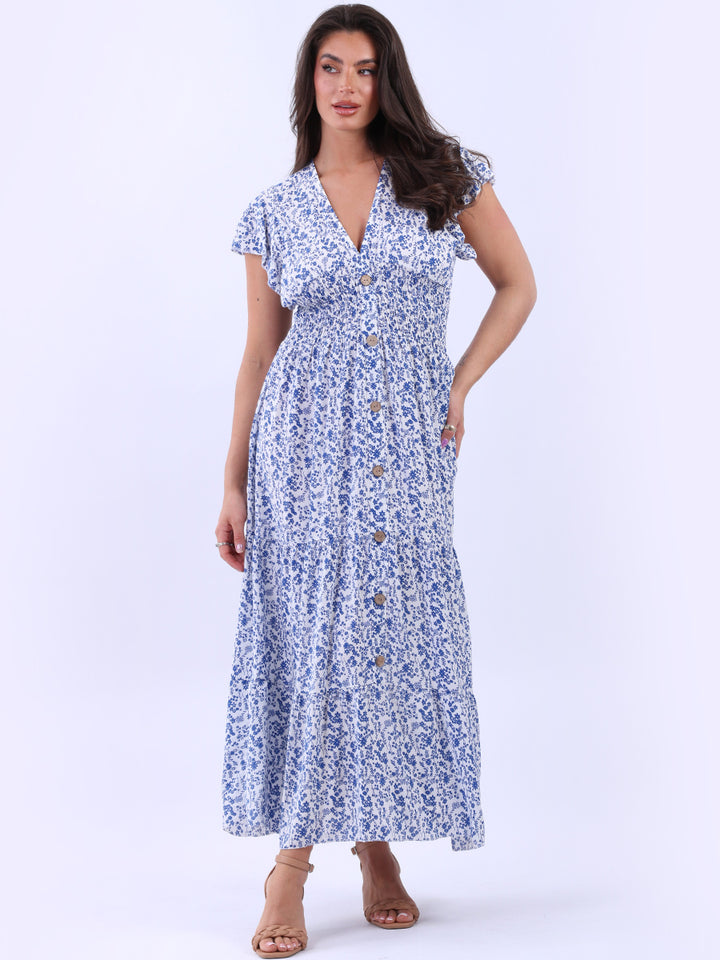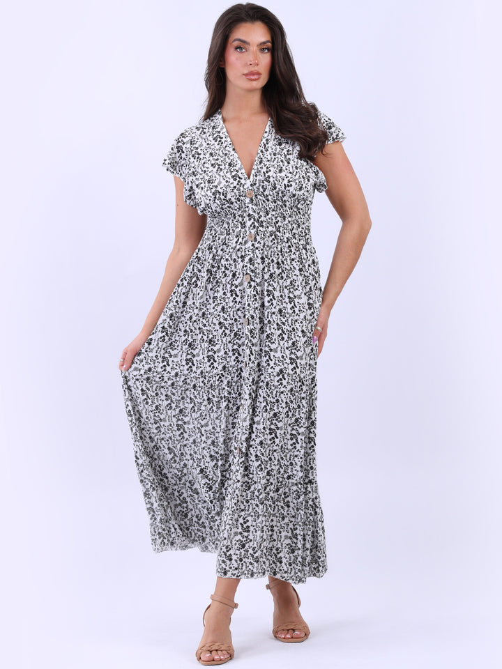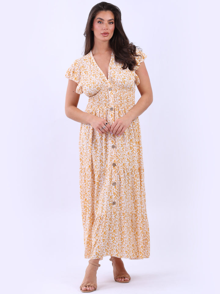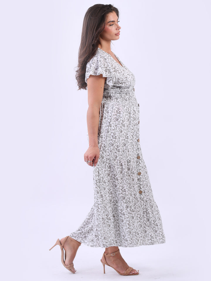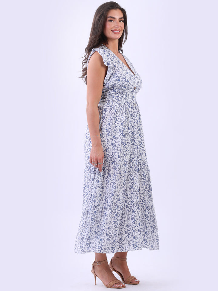 This made-in-Italy chick dress exudes grace and femininity with its floral print while the ruffle arms add a romantic yet playful touch. The allure of this V-neck is everything to make the dress eye-catching with front buttons enclosure adding depth to the dress and its lightweight soft fabric creates a flattering silhouette.