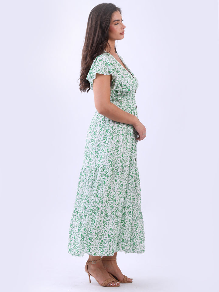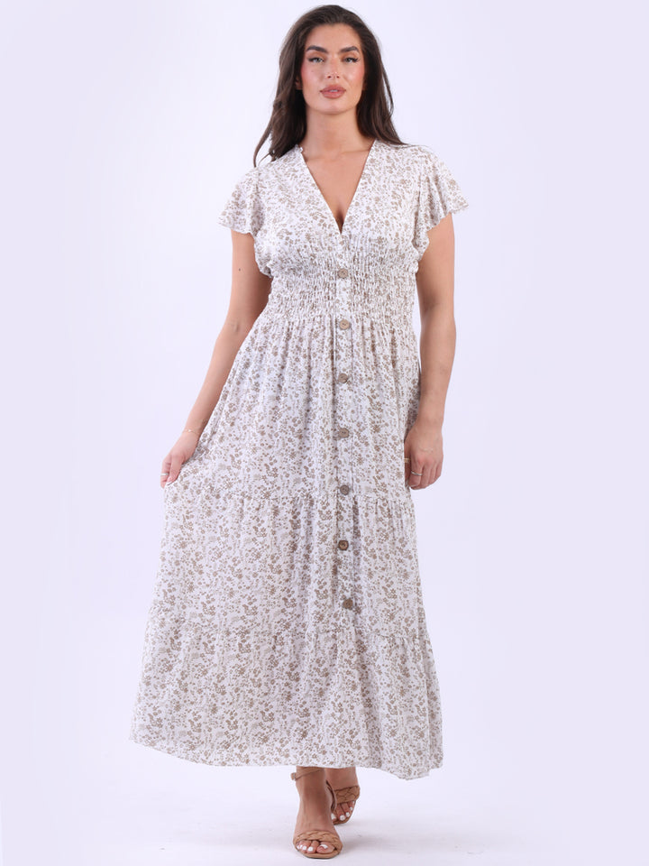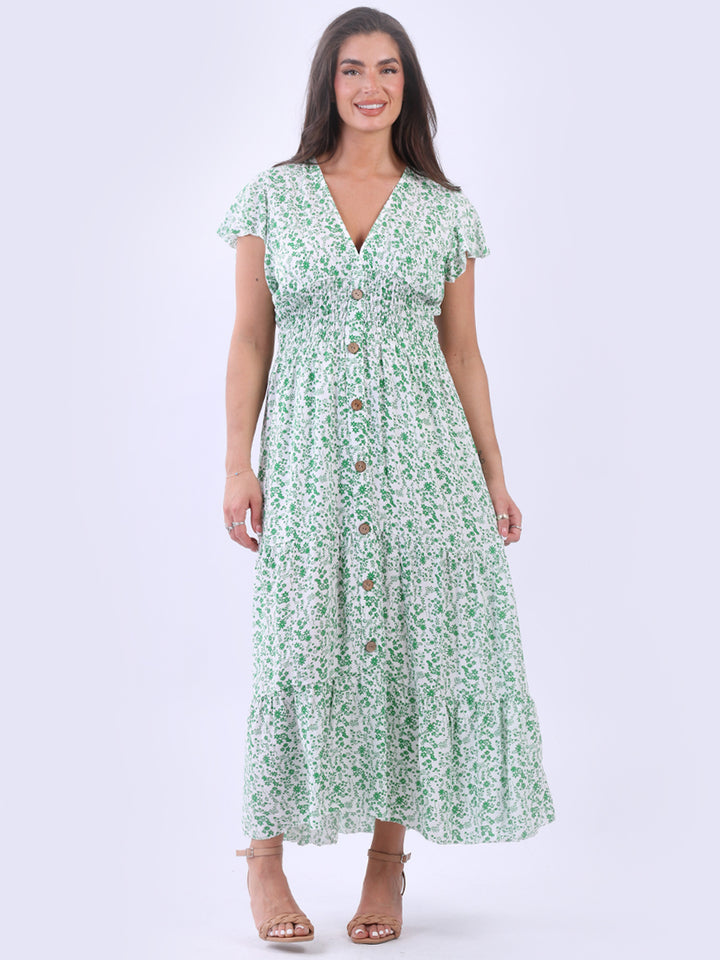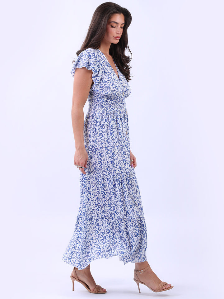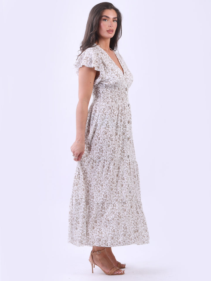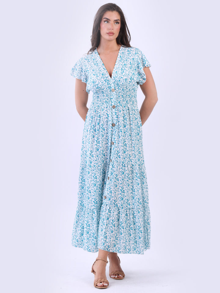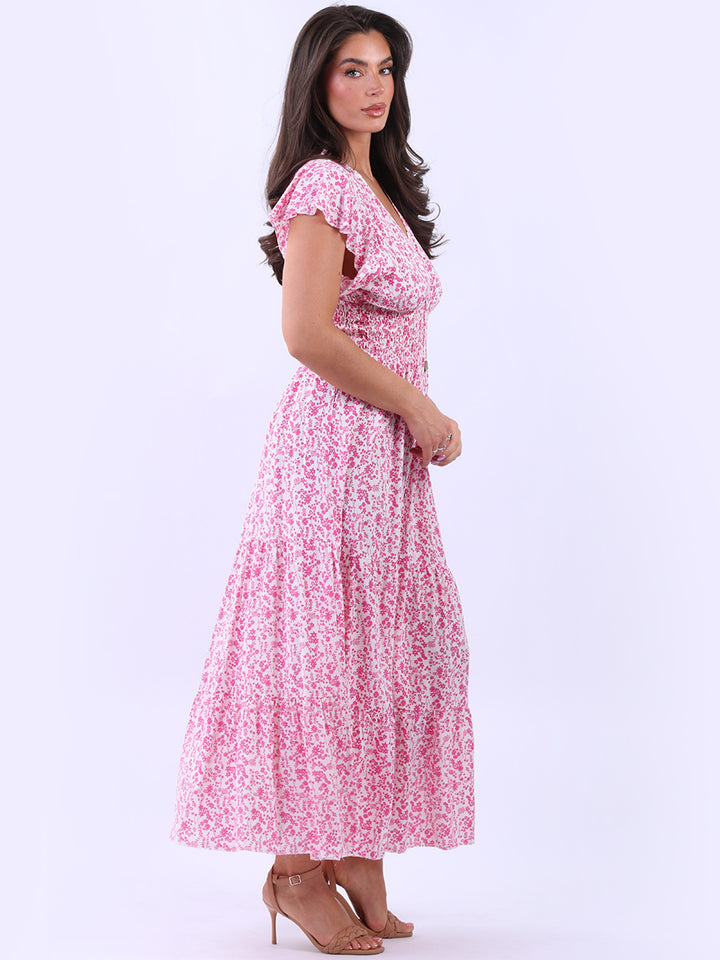 This made-in-Italy chick dress exudes grace and femininity with its floral print while the ruffle arms add a romantic yet playful touch. The allure of this V-neck is everything to make the dress eye-catching with front buttons enclosure adding depth to the dress and its lightweight soft fabric creates a flattering silhouette.