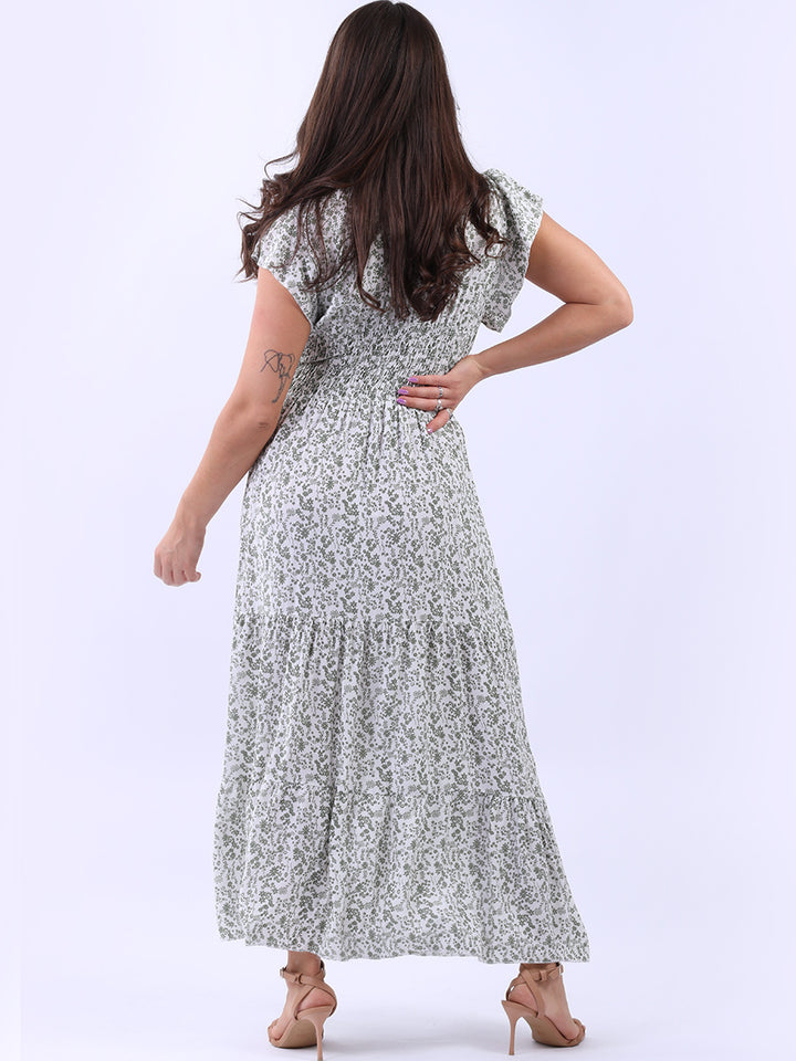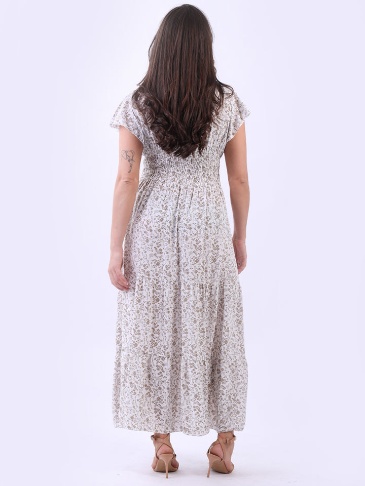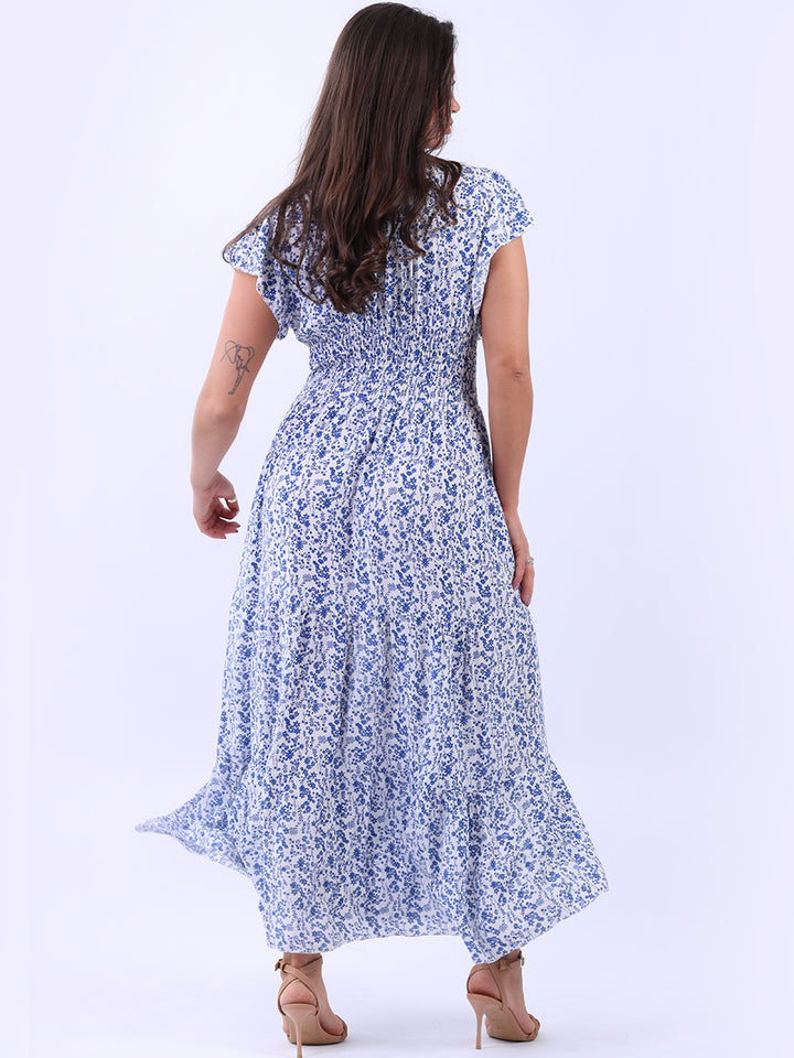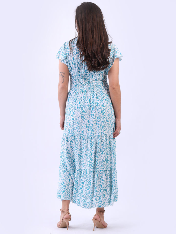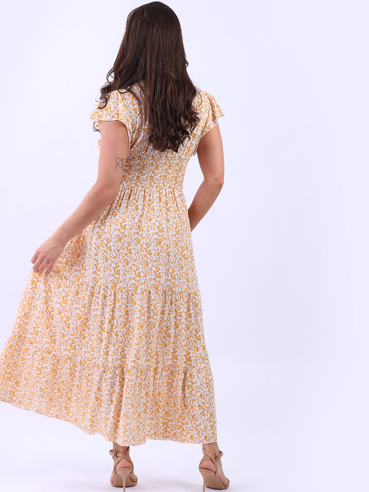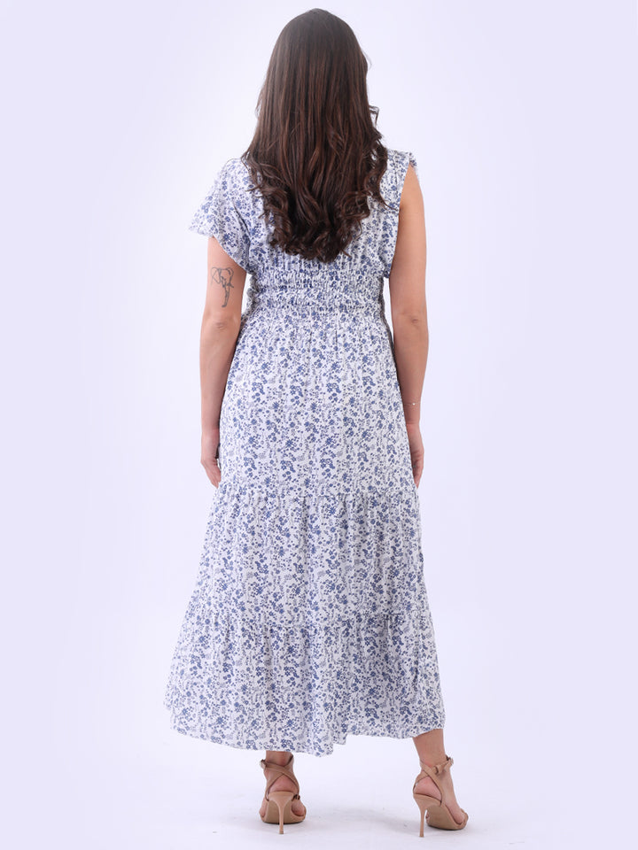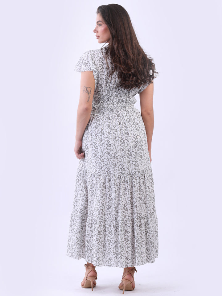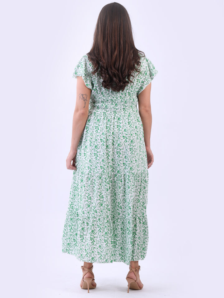 This made-in-Italy chick dress exudes grace and femininity with its floral print while the ruffle arms add a romantic yet playful touch. The allure of this V-neck is everything to make the dress eye-catching with front buttons enclosure adding depth to the dress and its lightweight soft fabric creates a flattering silhouette.