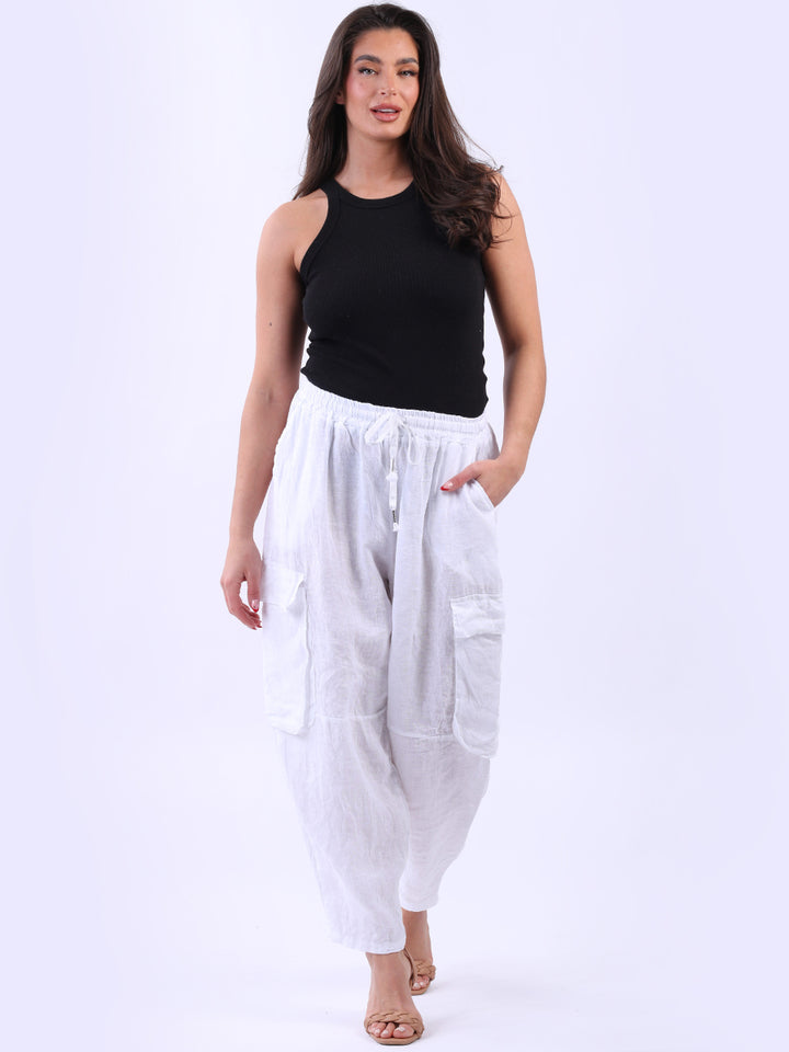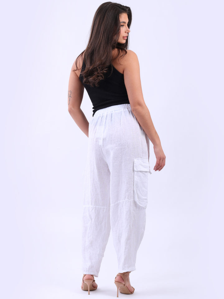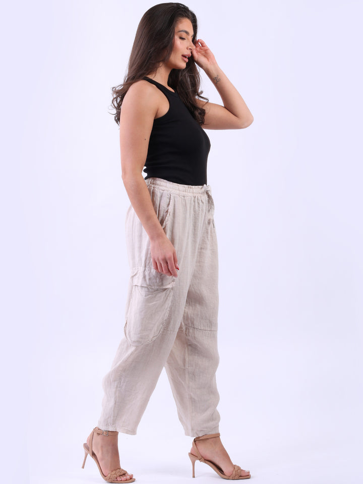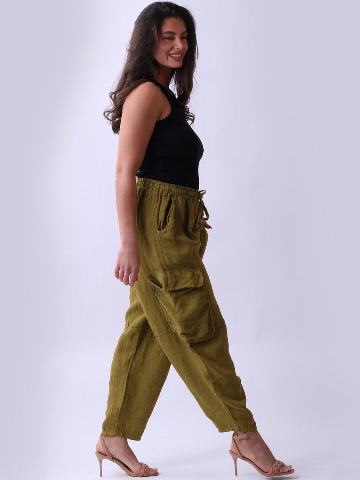 A showcase of perfect features, colors and fabric this is the trouser that is made in Italy with soft and cozy linen that is breathable and natural. Ideal for laid back days, running errands or going for casual walk. Drawstring adjustable waist, multi pockets for many function and needs of modern life, soft and lively colors and sleek finish. The trousers are easy to mix and match with type and dye tops and sneakers.