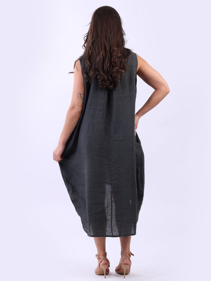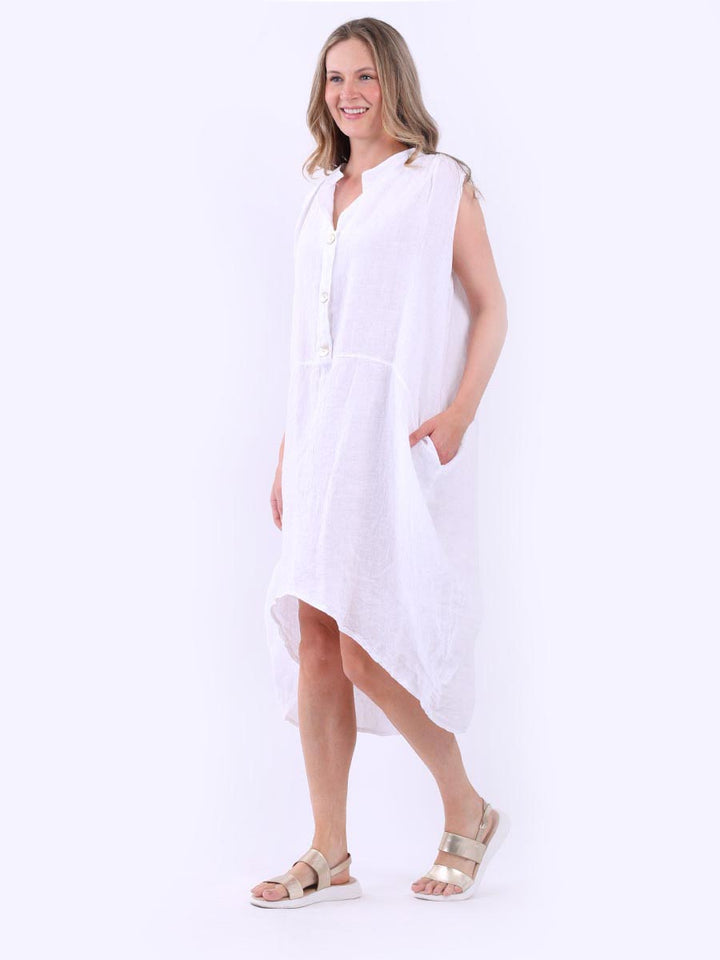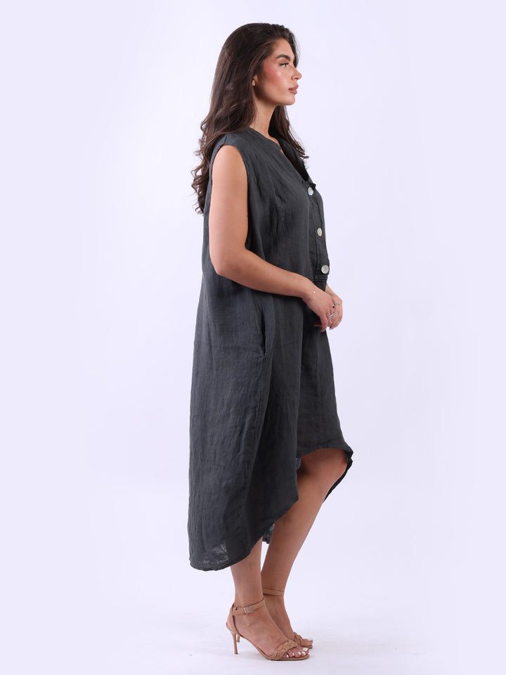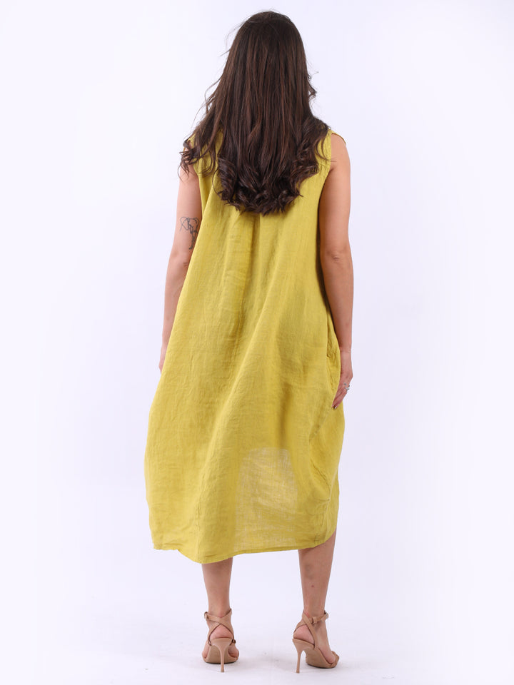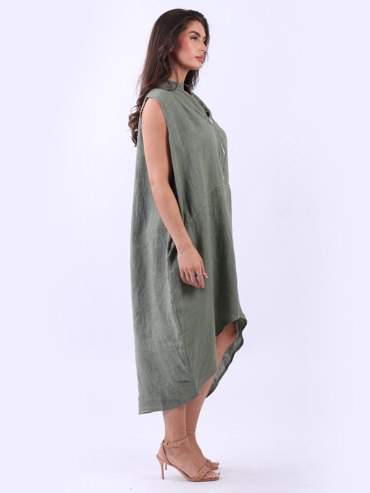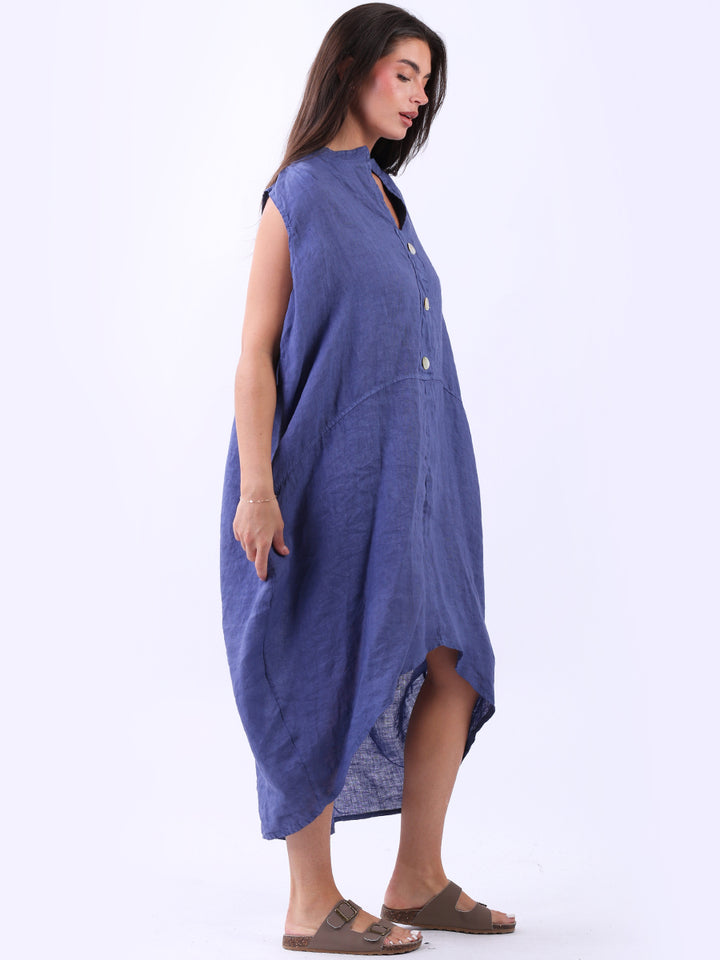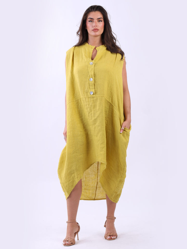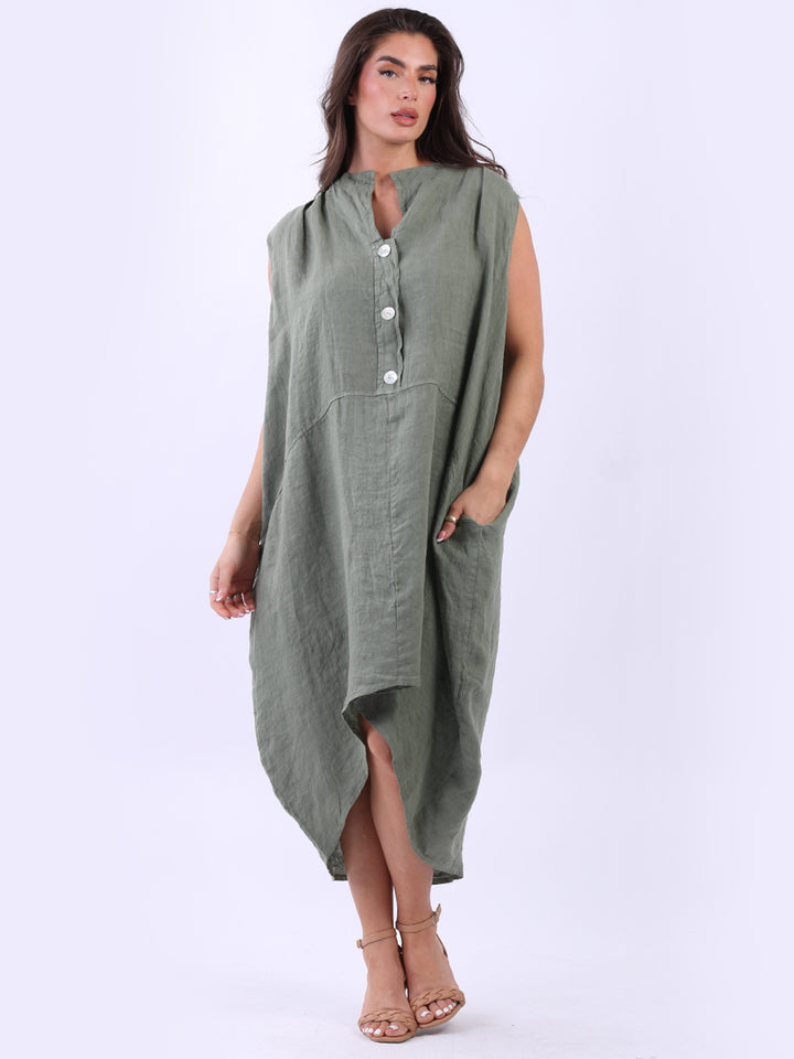 Embrace the classic Italian fashion with this elegant linen sleeveless plain dress, designed in a plus size lagenlook fit. It exudes a laid-back vibe with front button placket and its relaxed fit. Seamless side pockets add a functional touch to its sophisticated look. Style it with sneakers to slay the next outdoor adventure.