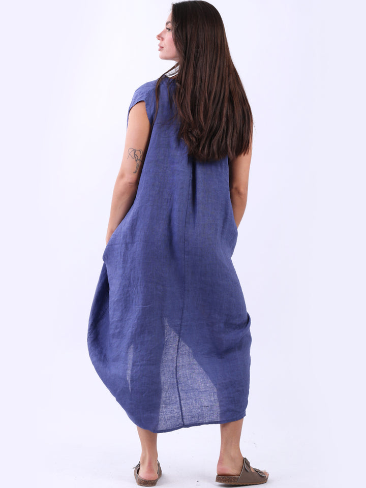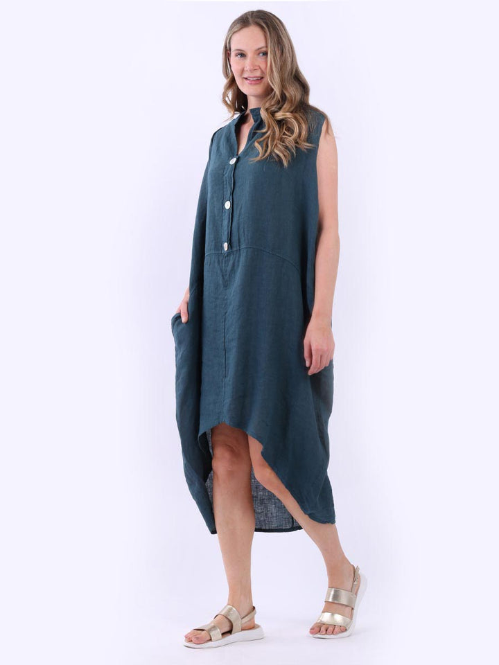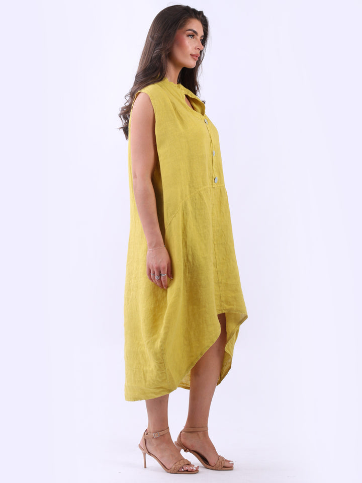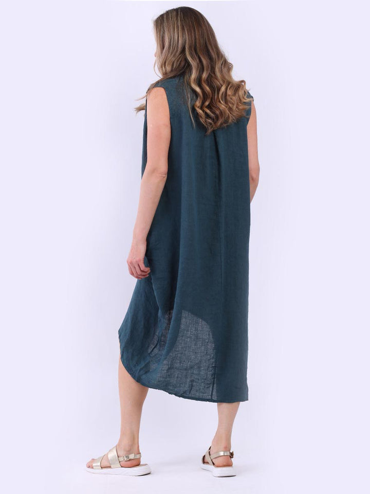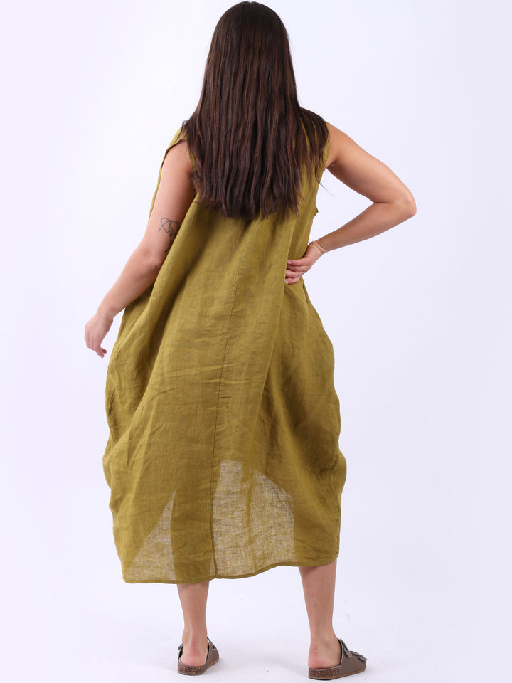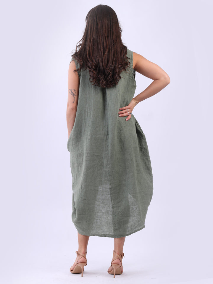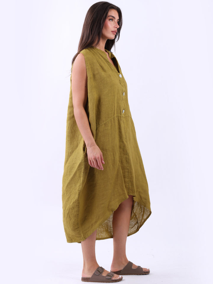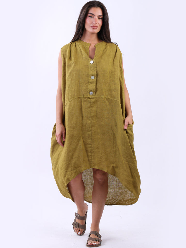 Embrace the classic Italian fashion with this elegant linen sleeveless plain dress, designed in a plus size lagenlook fit. It exudes a laid-back vibe with front button placket and its relaxed fit. Seamless side pockets add a functional touch to its sophisticated look. Style it with sneakers to slay the next outdoor adventure.