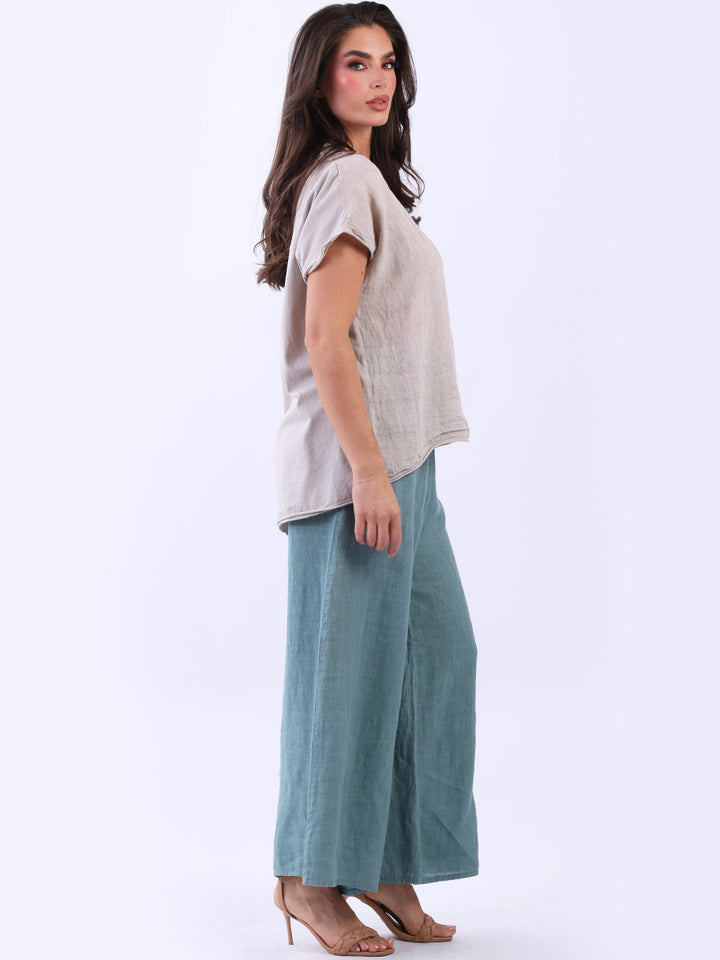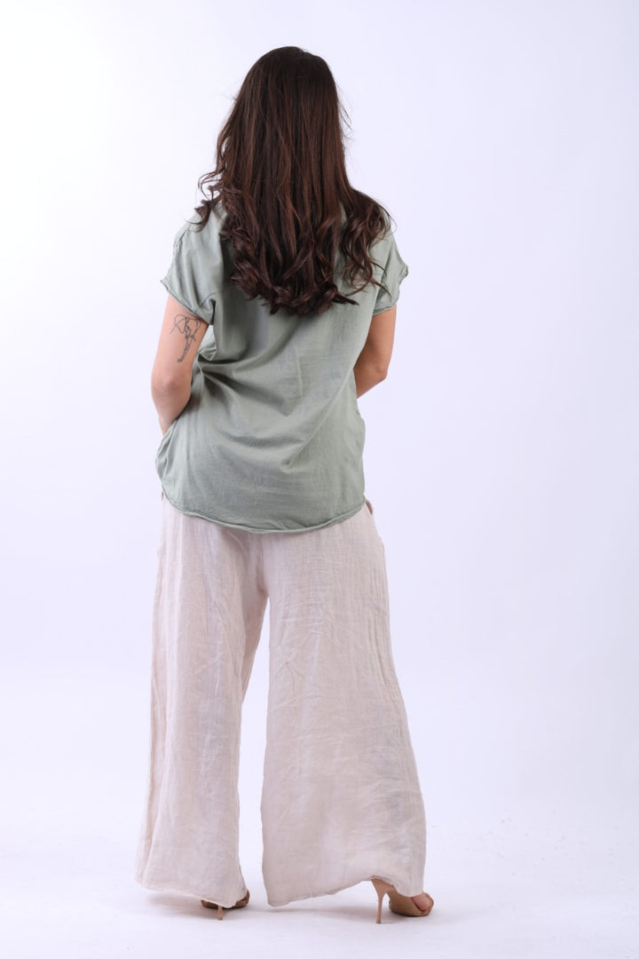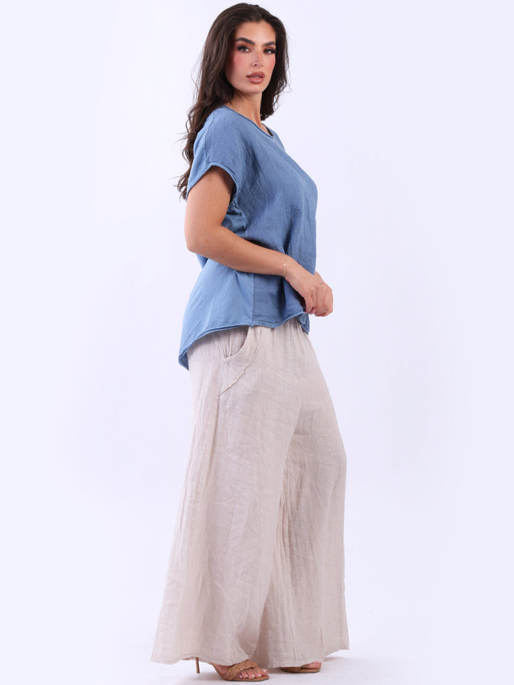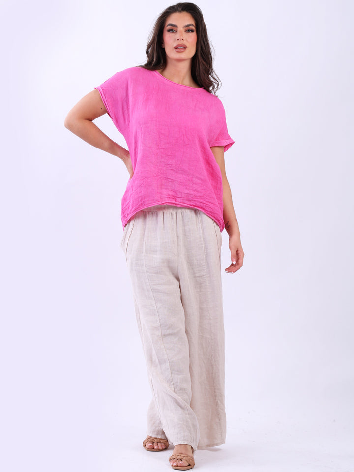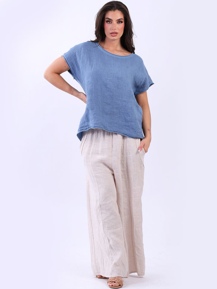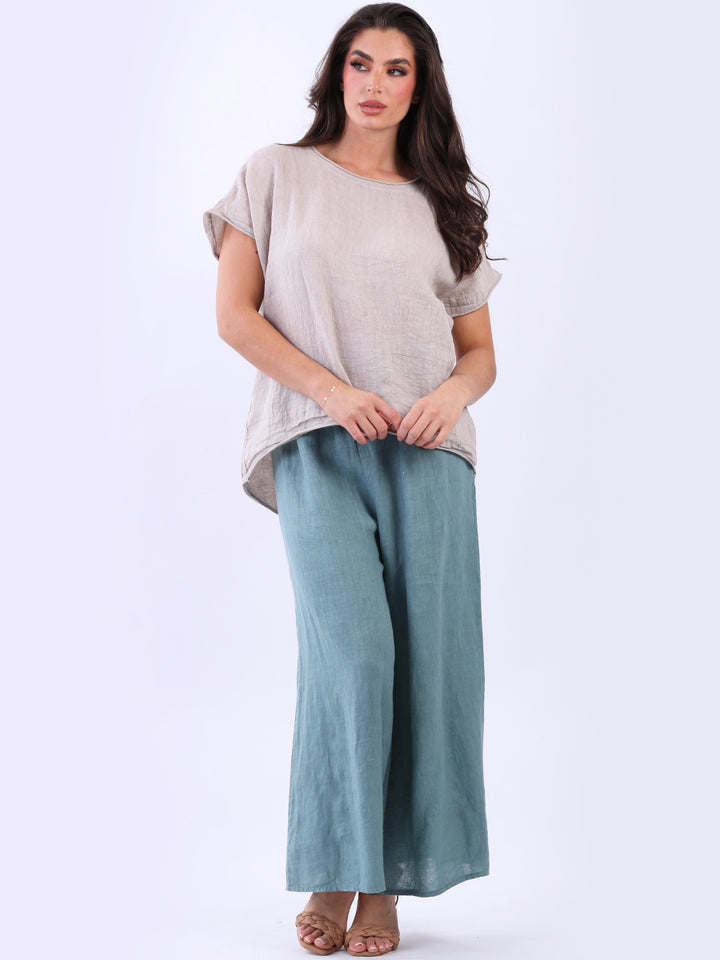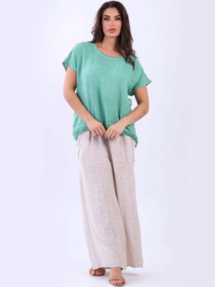 This classic Italian linen cotton duo top by Redwholesale is a must have for warm sunny days to maintain casual attire. With timelessly simple features like short sleeves, round neckline, and lagenlook fit, this top with dipped hem boasts sophistication and subtle allure. Pair it with wide leg pants and high heels.