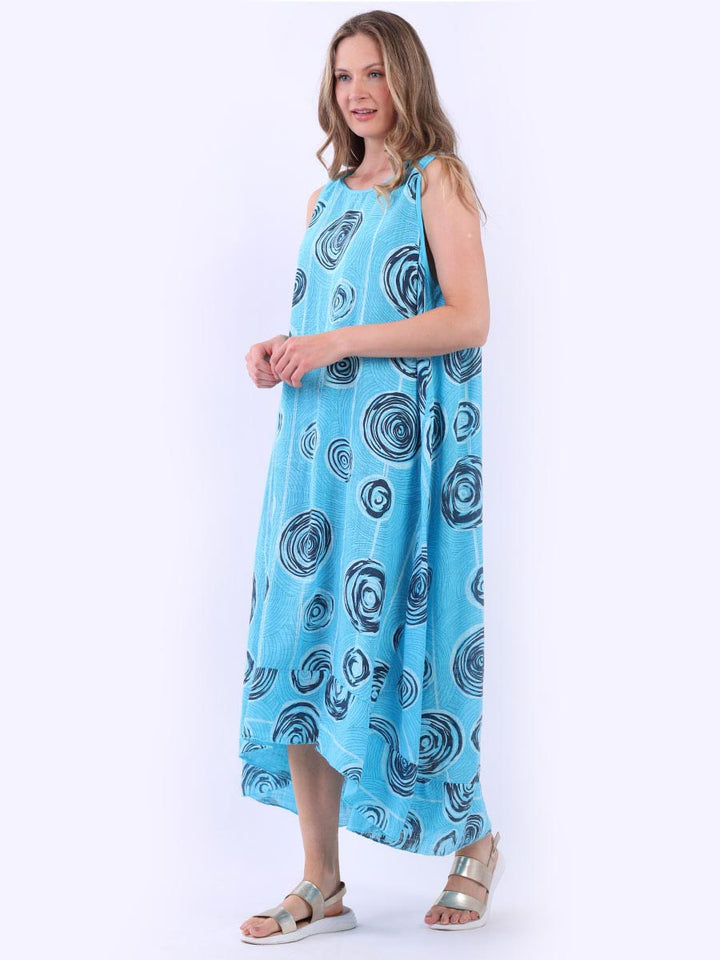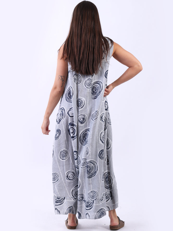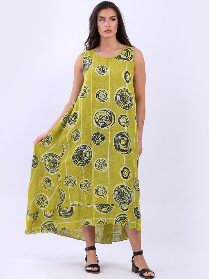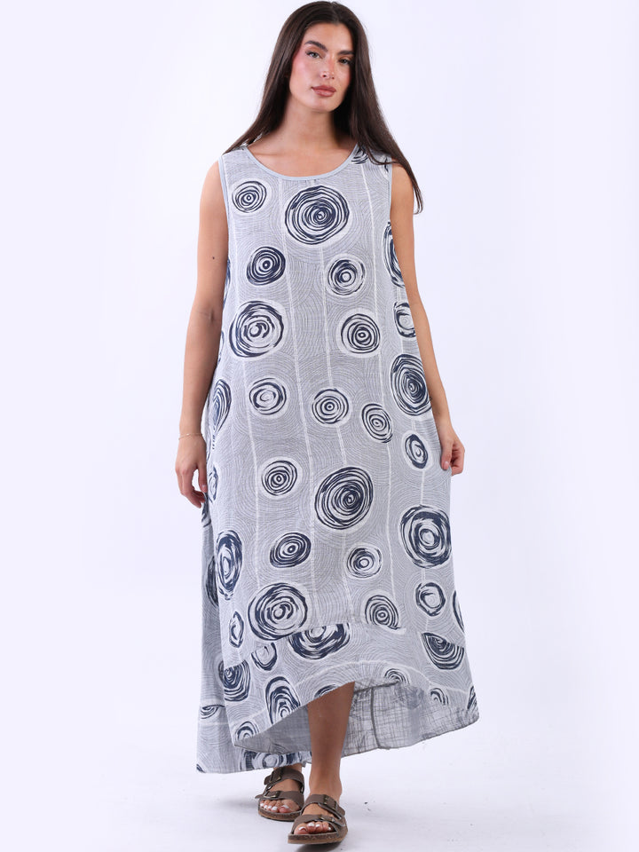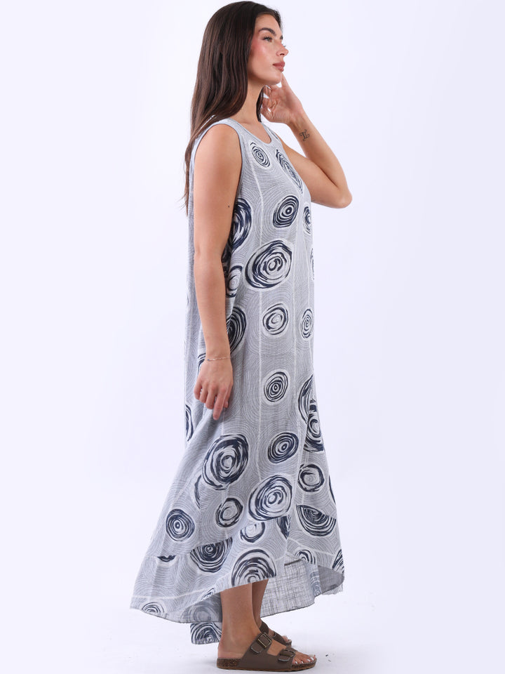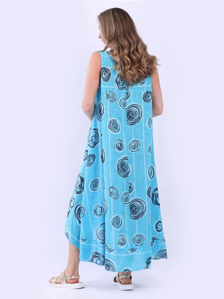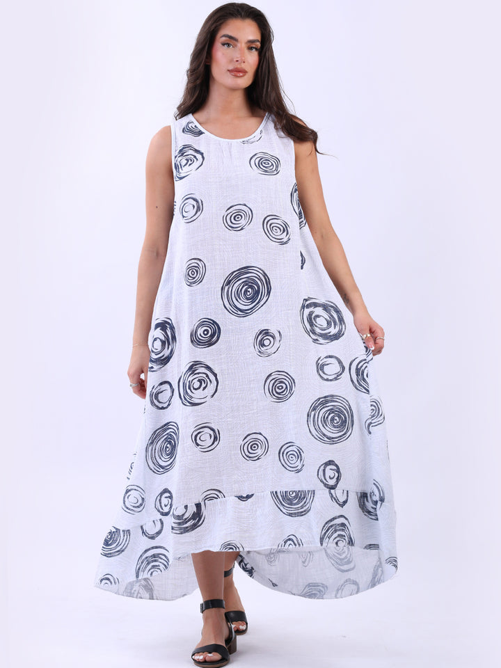 What is better than a sleeveless spiral printed cotton dress to cool down on a warm sunny day? This oversized Italian dress is unique in print and versatile in design, perfect to end a day in style. The hi-lo hem adds a dramatic touch to its flowy silhouette, completing its casual look. Add a statement to shape the loose fit for a chic, sophisticated look, or go with flat sandals and a straw hat for a perfect beach party outfit.