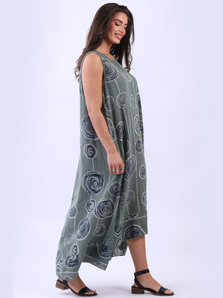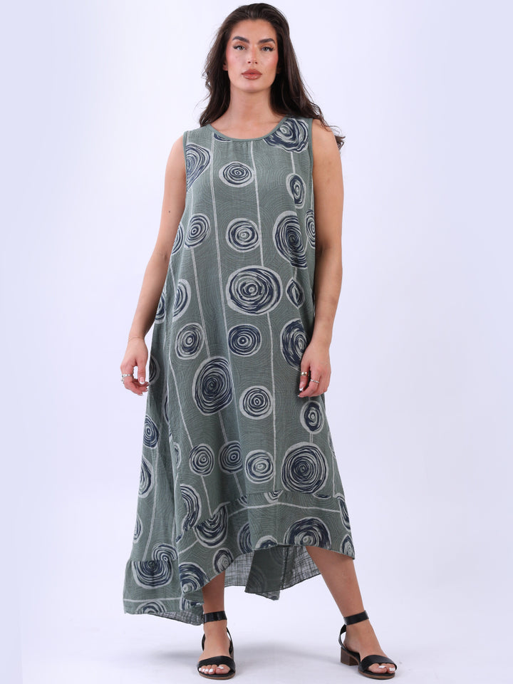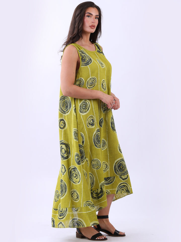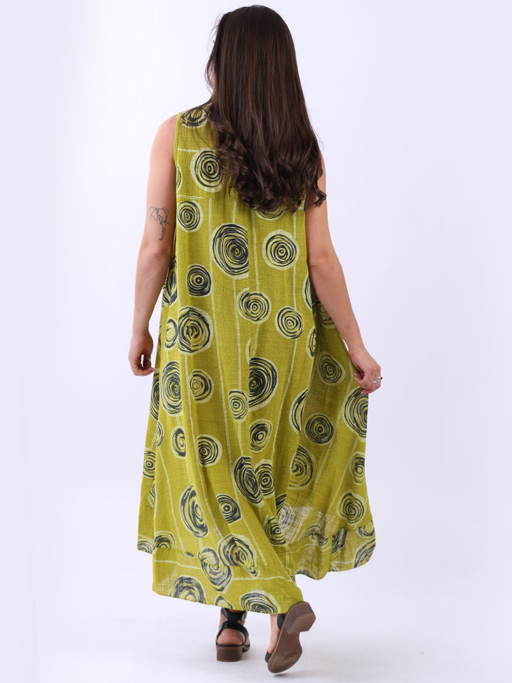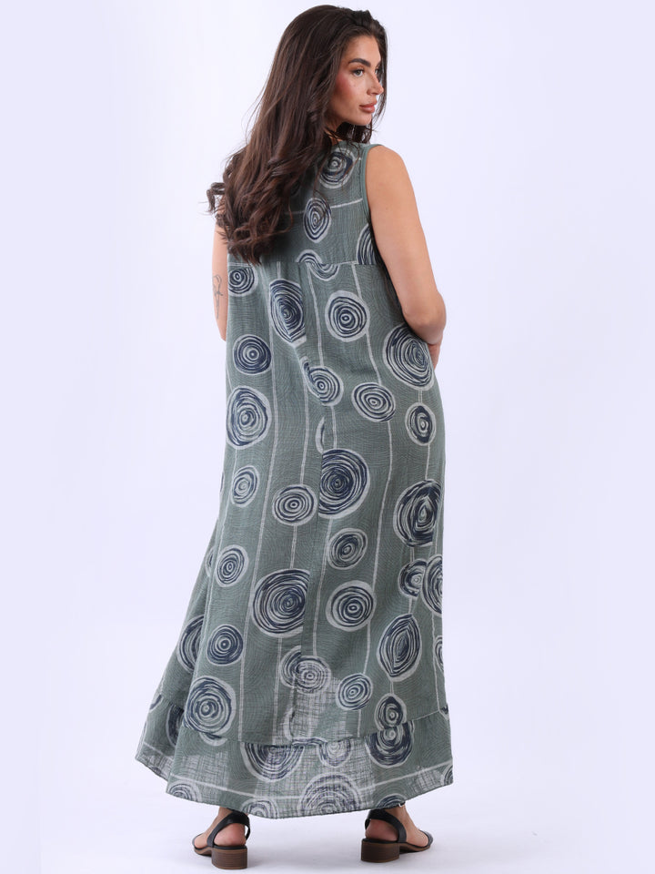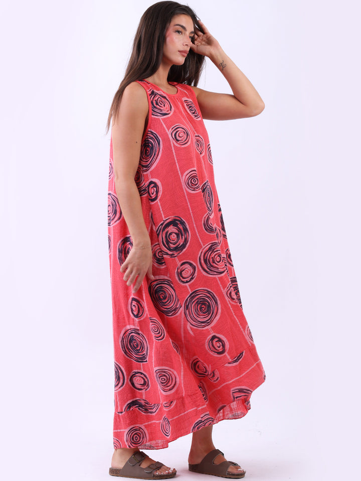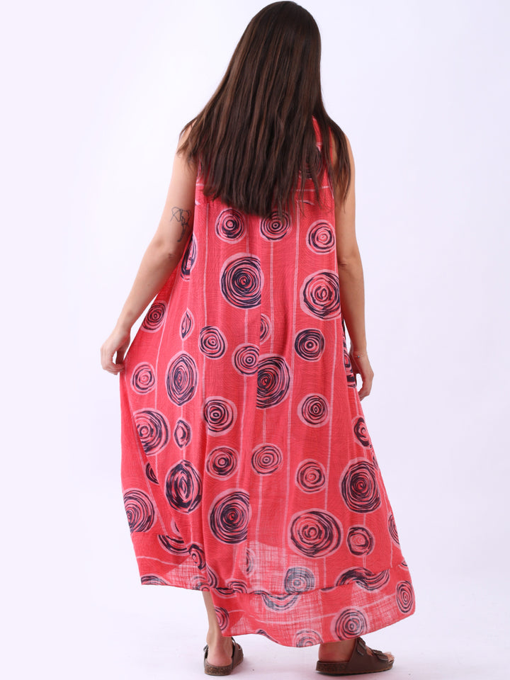 What is better than a sleeveless spiral printed cotton dress to cool down on a warm sunny day? This oversized Italian dress is unique in print and versatile in design, perfect to end a day in style. The hi-lo hem adds a dramatic touch to its flowy silhouette, completing its casual look. Add a statement to shape the loose fit for a chic, sophisticated look, or go with flat sandals and a straw hat for a perfect beach party outfit.