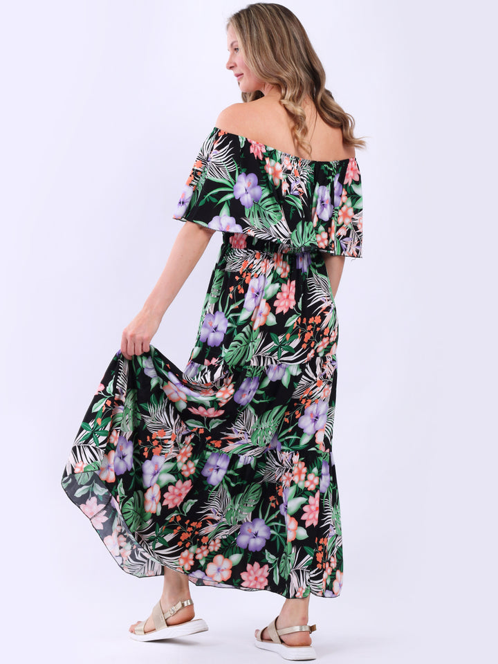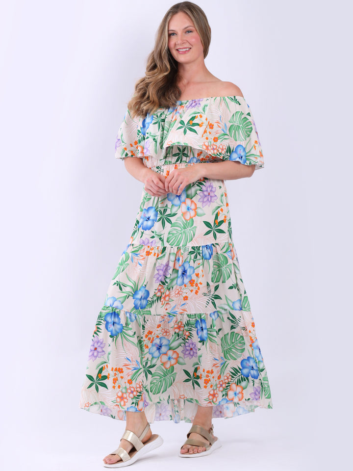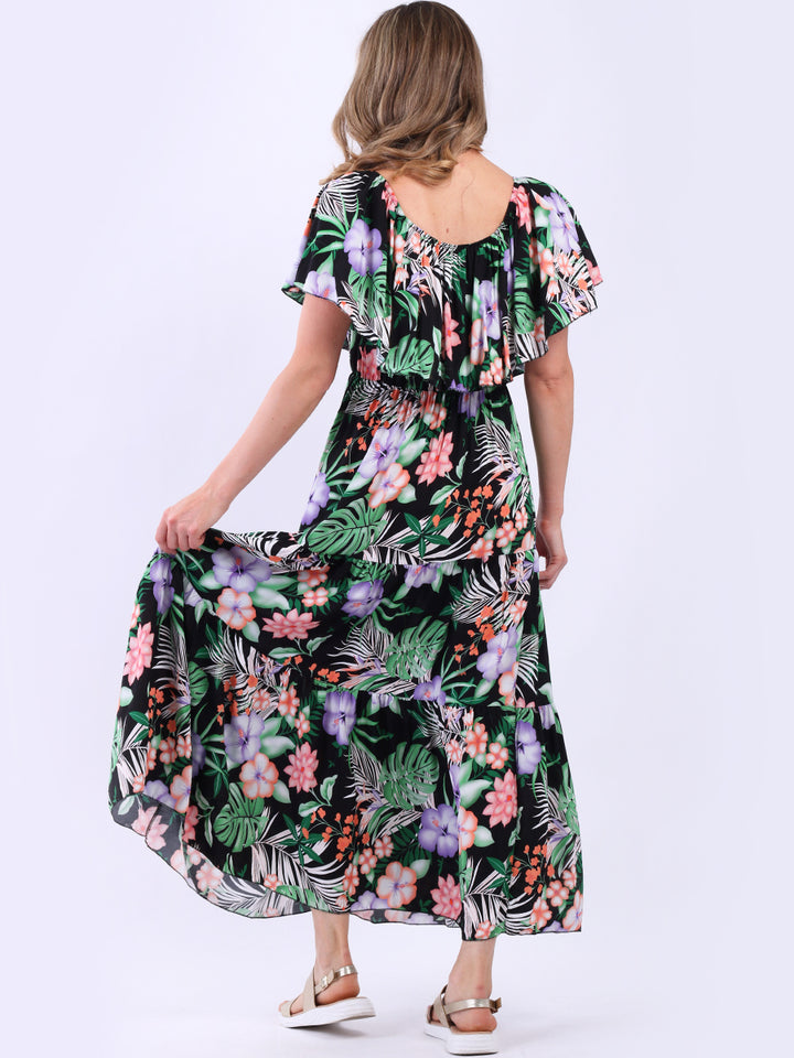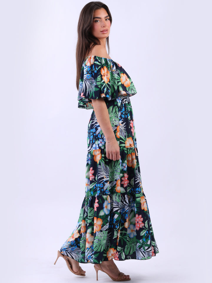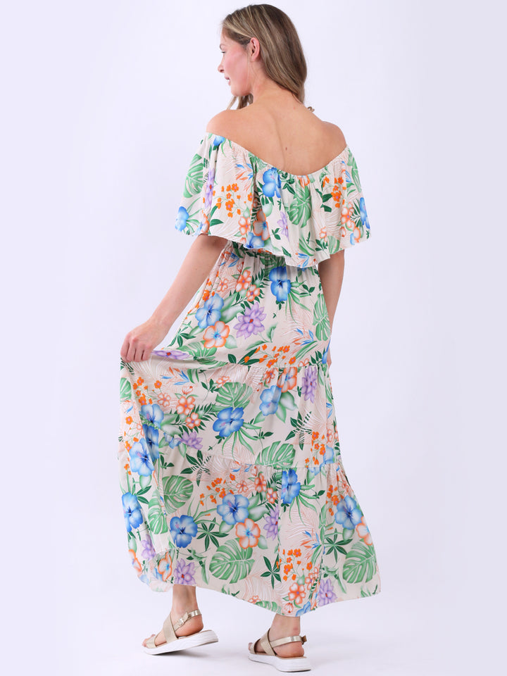 The Redwholesale is Introducing the epitome of summer style with this enchanting tropical printed maxi dress, featuring ruffle trim bardot neckline, exuding grace and femininity. This made in Italy dress includes an elastic ruched waist to provide a perfect fitting with a wide tiered ruffle hem to suit all women wearers.