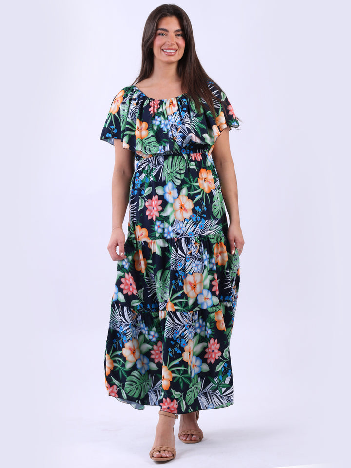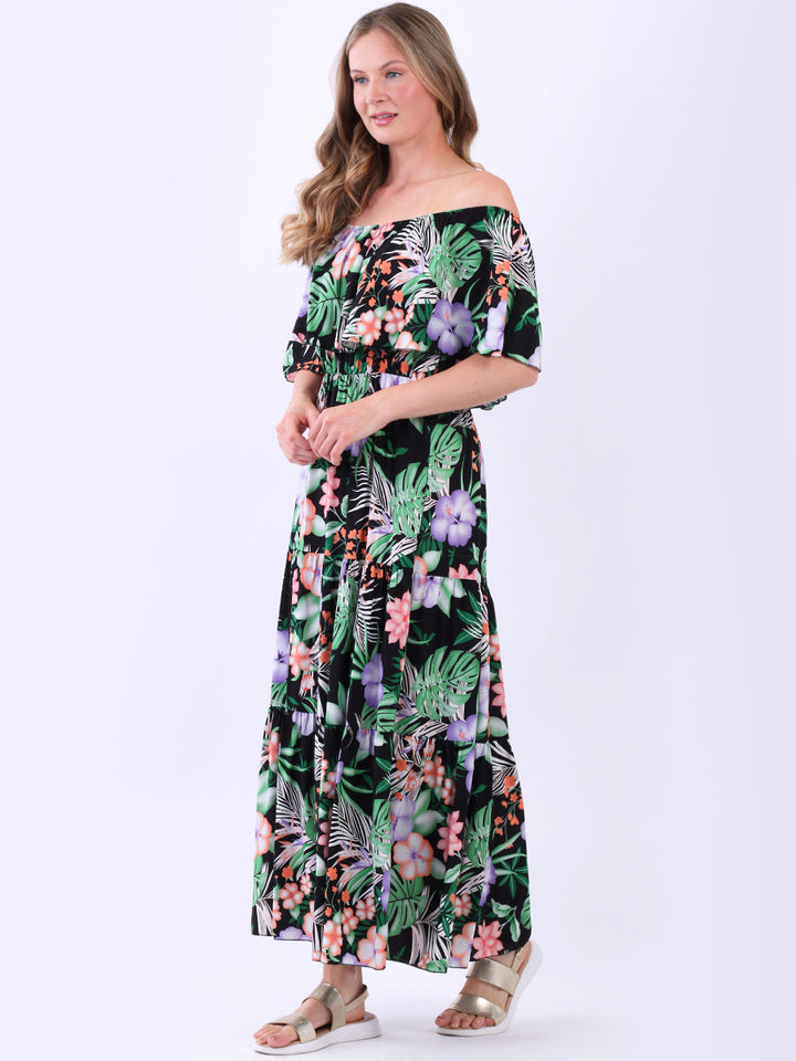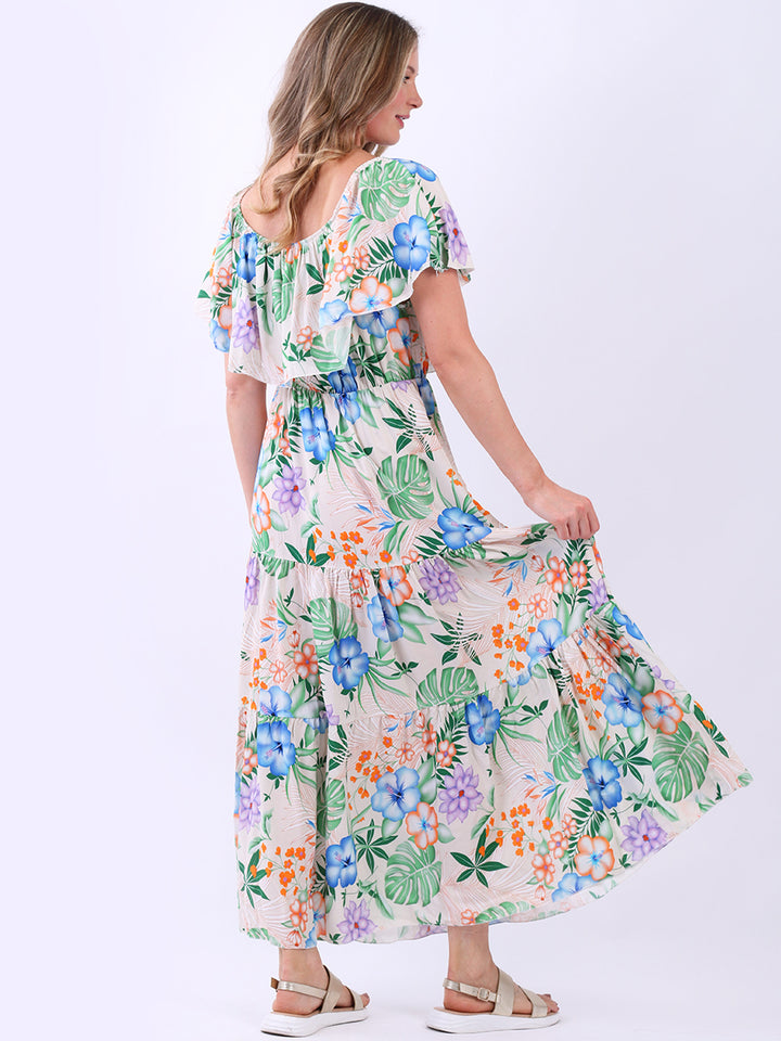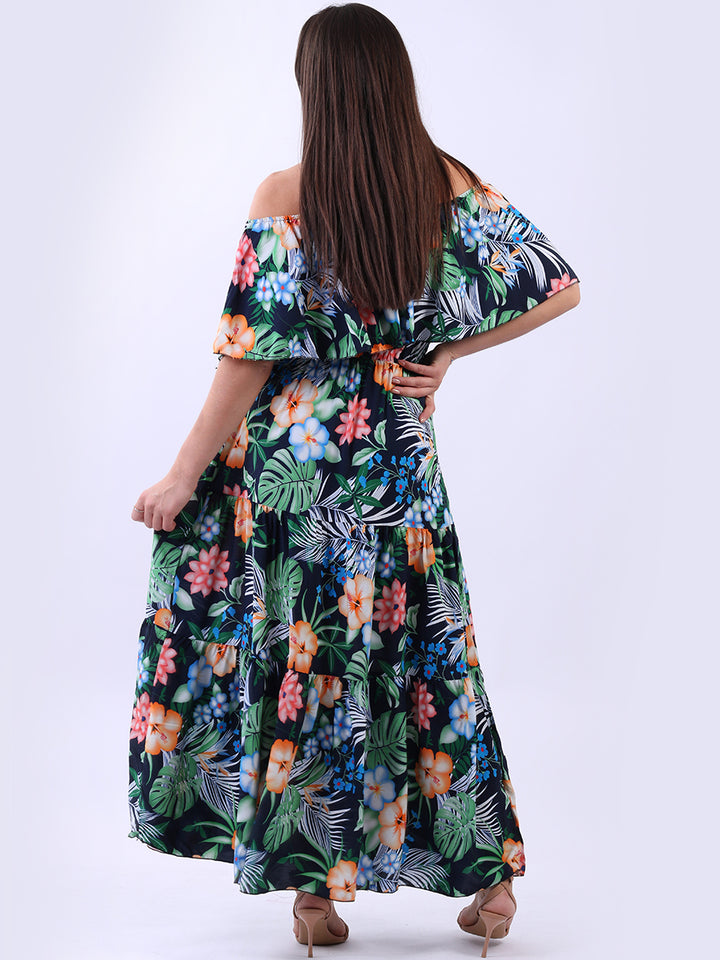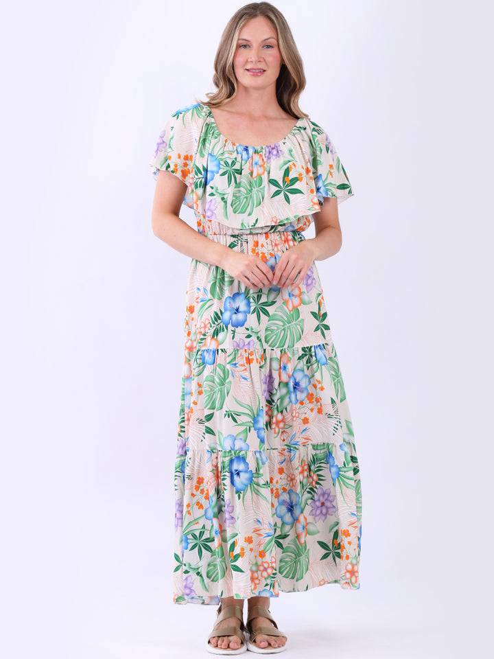 The Redwholesale is Introducing the epitome of summer style with this enchanting tropical printed maxi dress, featuring ruffle trim bardot neckline, exuding grace and femininity. This made in Italy dress includes an elastic ruched waist to provide a perfect fitting with a wide tiered ruffle hem to suit all women wearers.