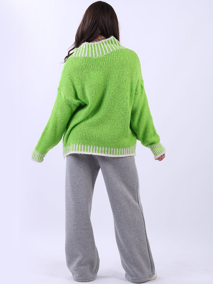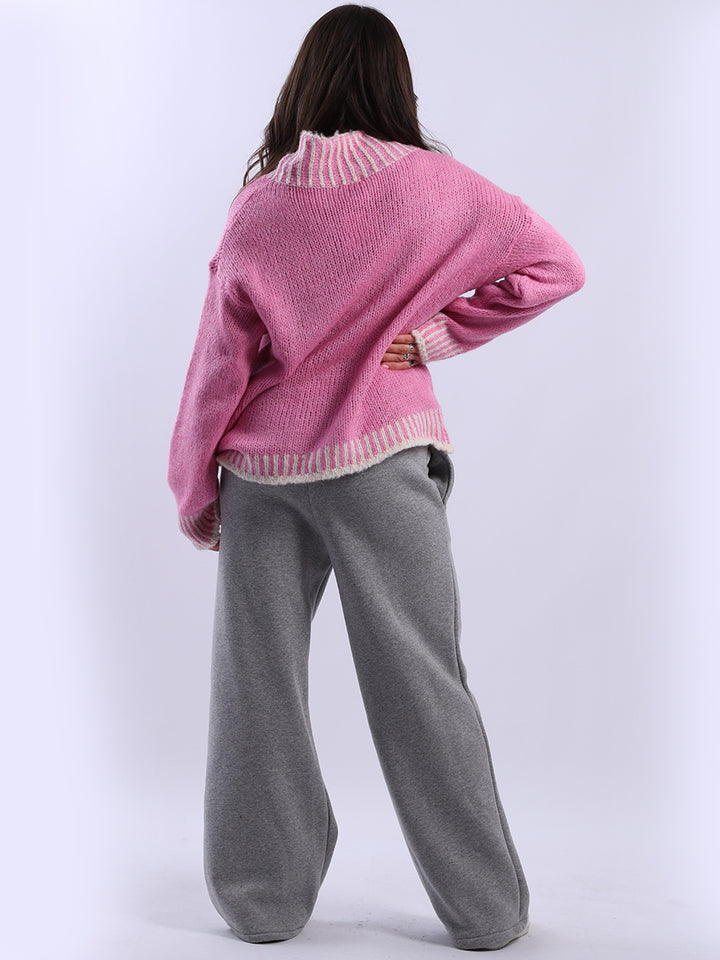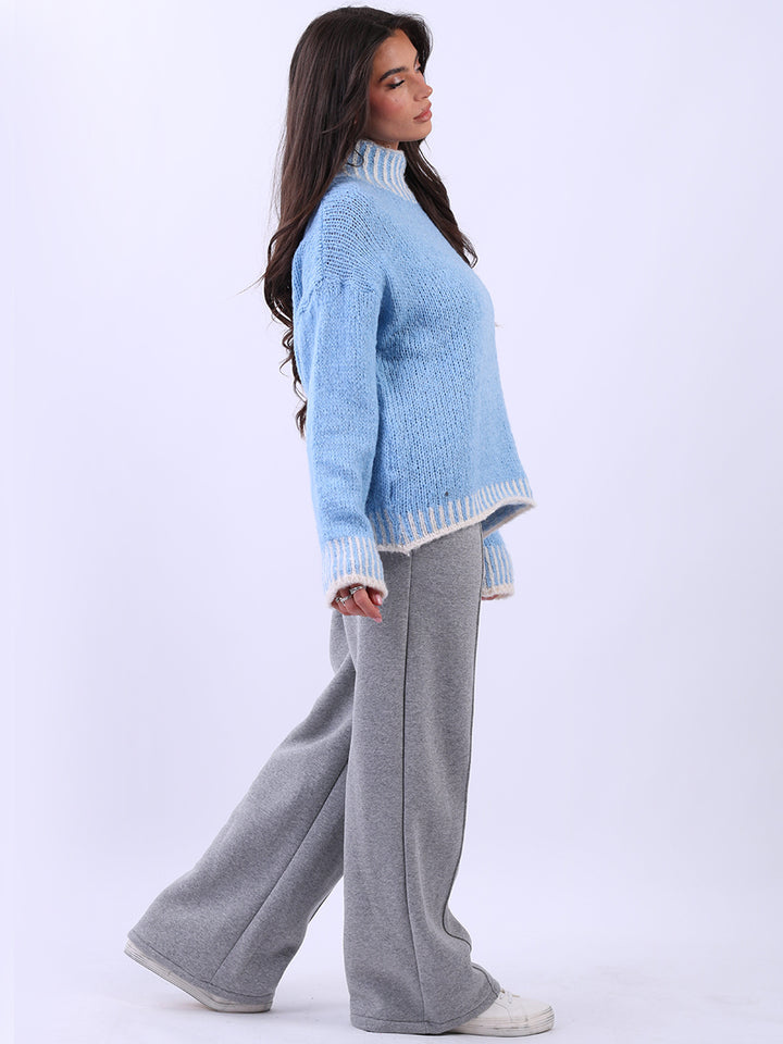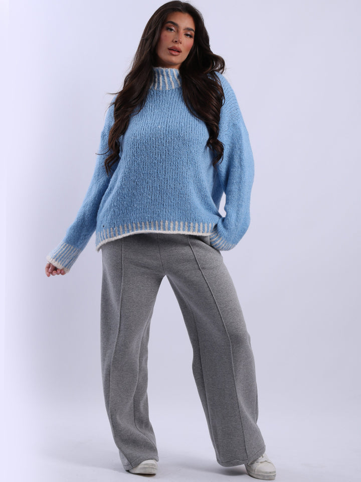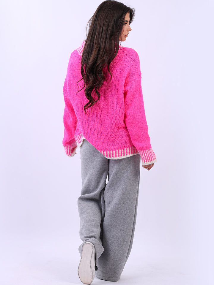 Trendy clothes can elevate the women’s fashion by its sparking colors, exclusive features and fine quality fabric. This jumper for women is made in Italy having contrast stitch trim style, funnel neck and long baggy sleeves with drop shoulders. This woolen knit jumper is perfect Italian moda for all the ladies to wear in Italy.
