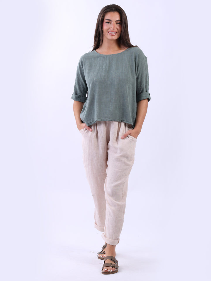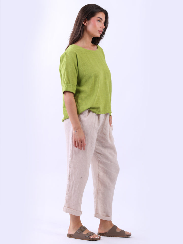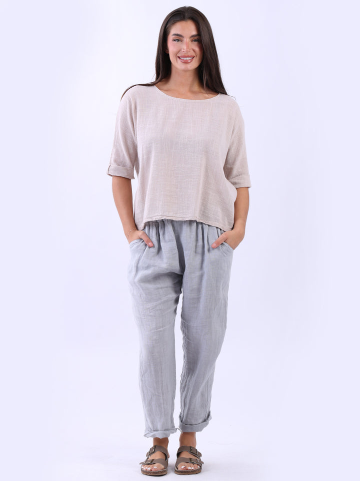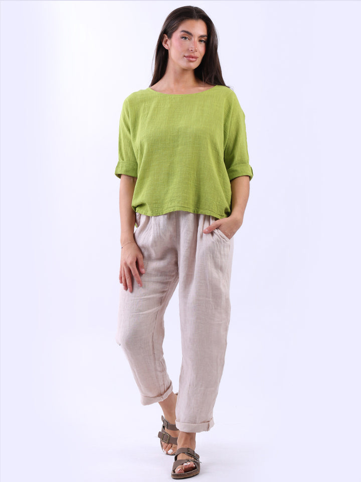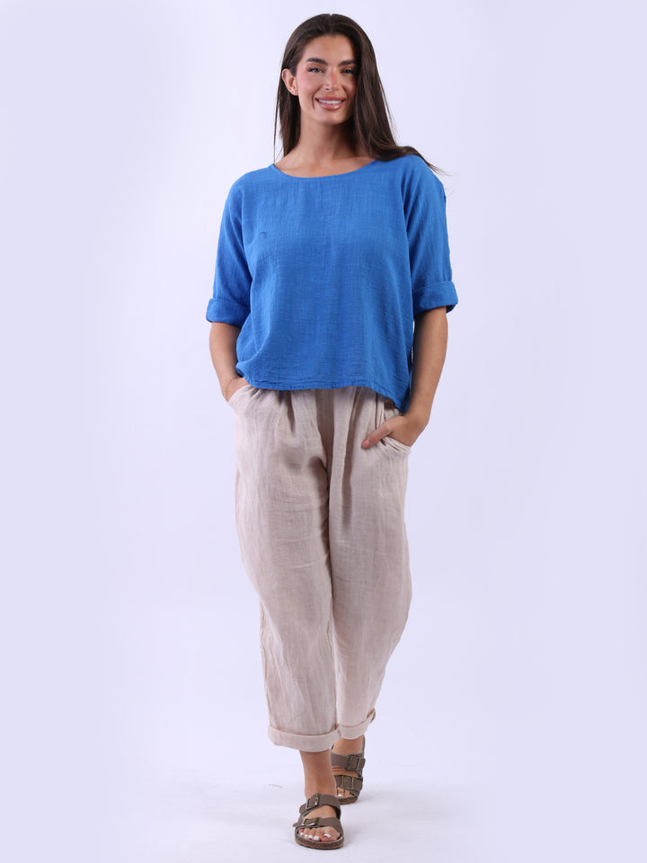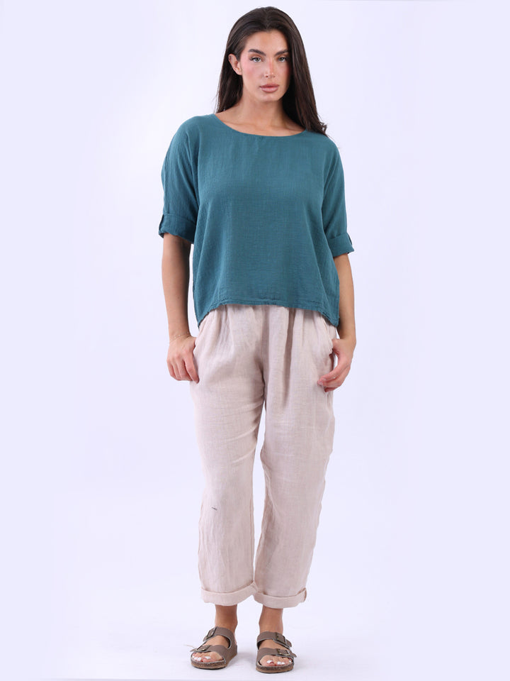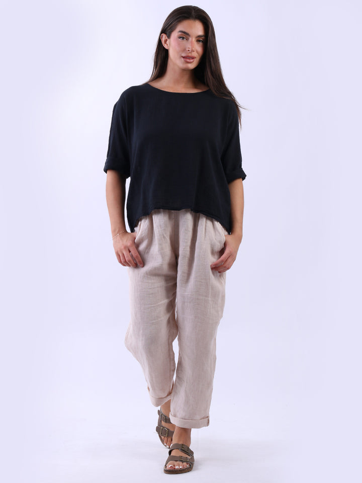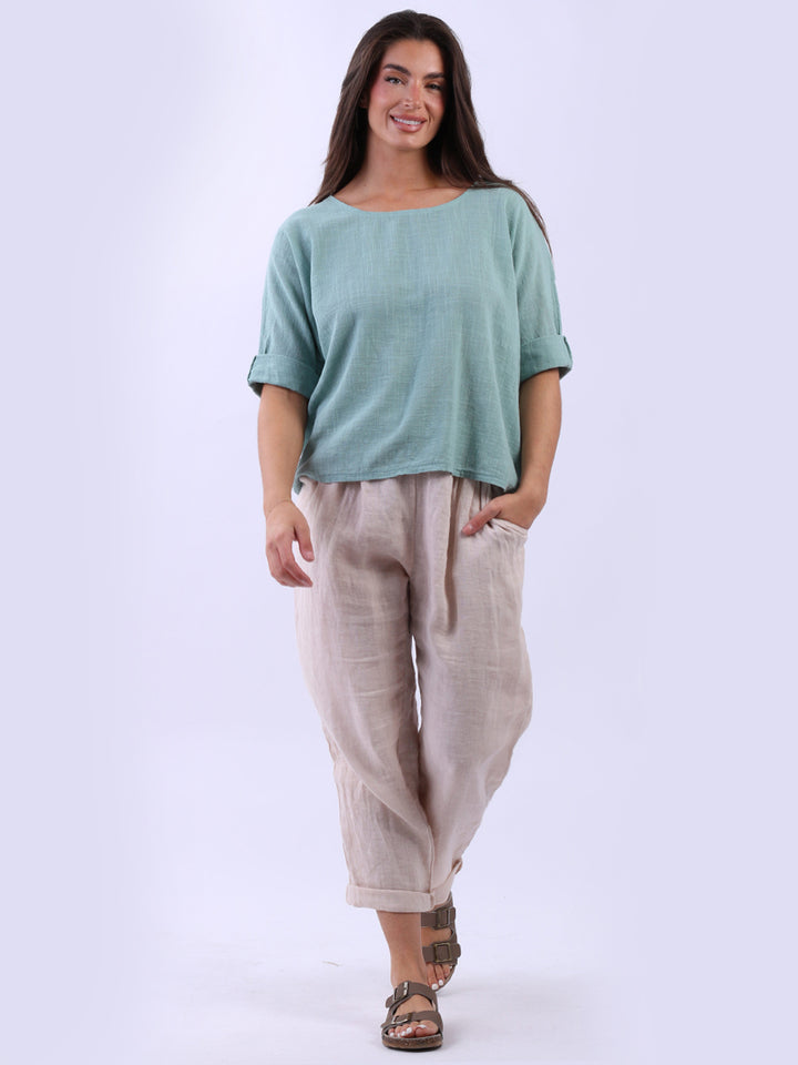Add a classic and sleek touch of solid colors to the summer wardrobe with this plain boxy crop top. It is breathable and relaxing, thanks to its ultra-soft cotton fabric. The rolled-up sleeves add a carefree vibe, maintaining its laidback look. This sophisticated crop top is now in wearer reach for an effortless stylish look this season and beyond.