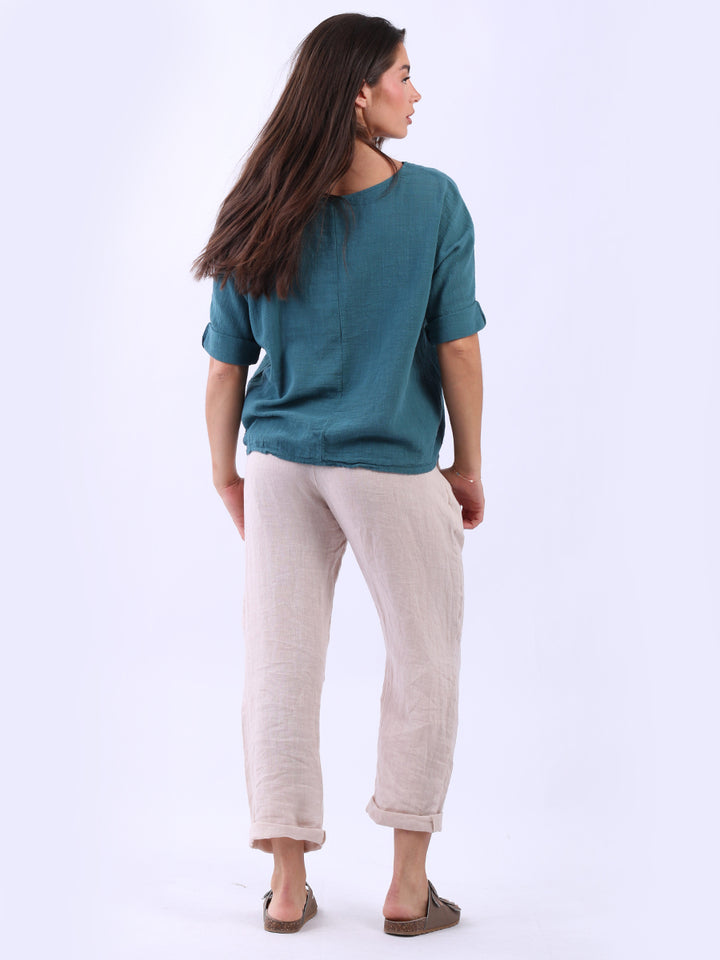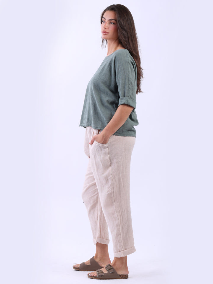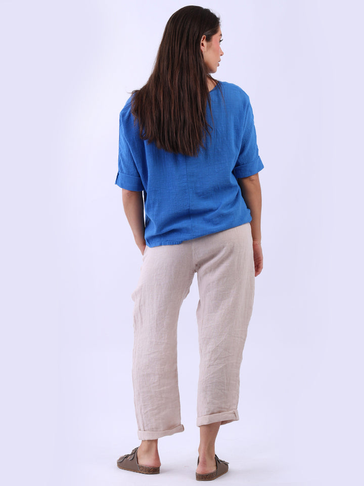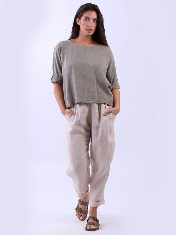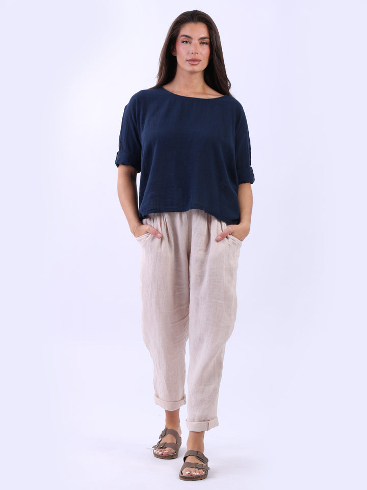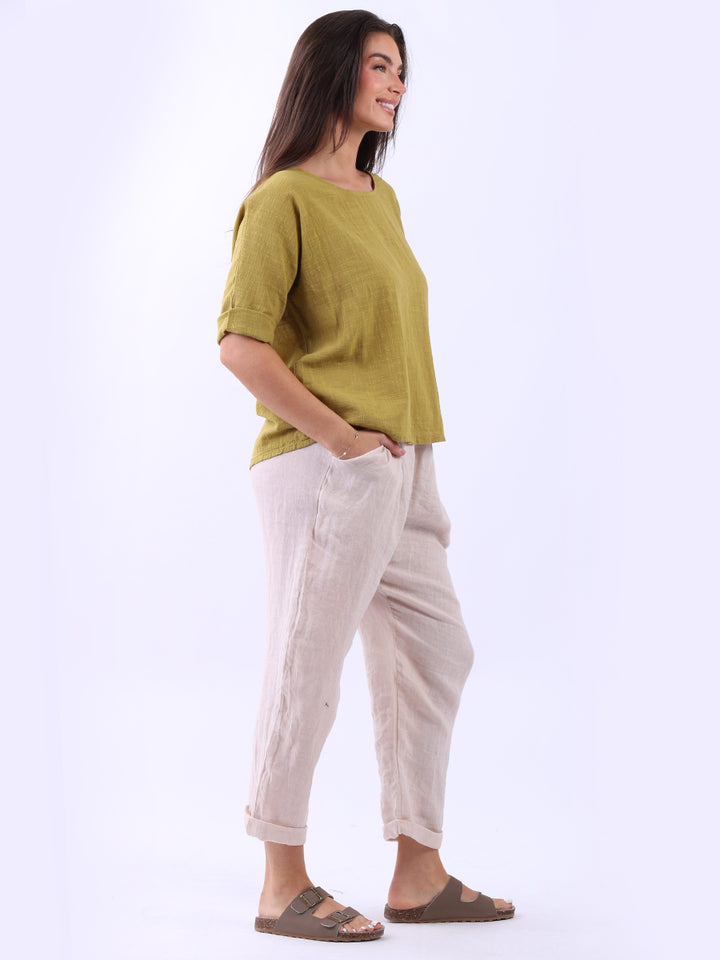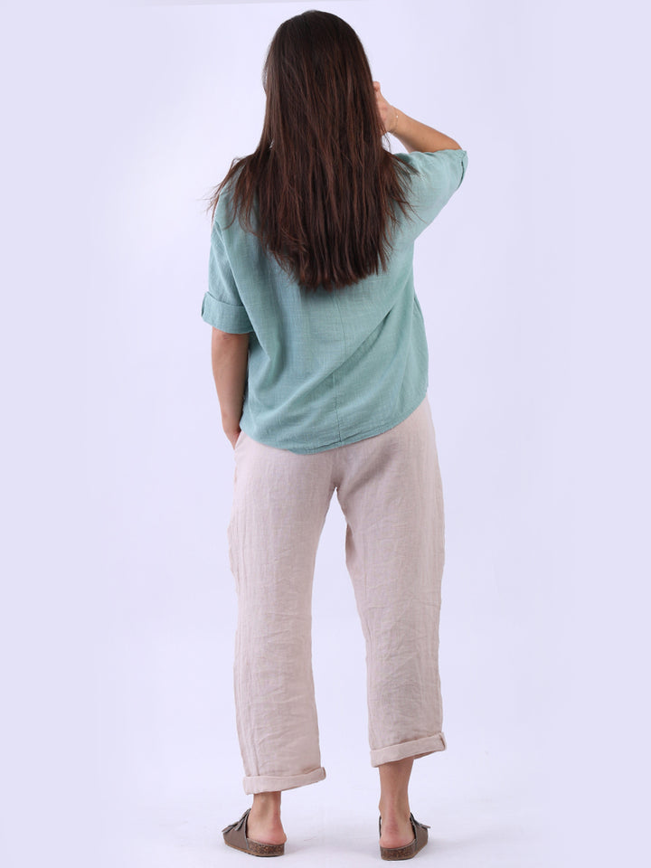 Add a classic and sleek touch of solid colors to the summer wardrobe with this plain boxy crop top. It is breathable and relaxing, thanks to its ultra-soft cotton fabric. The rolled-up sleeves add a carefree vibe, maintaining its laidback look. This sophisticated crop top is now in wearer reach for an effortless stylish look this season and beyond.