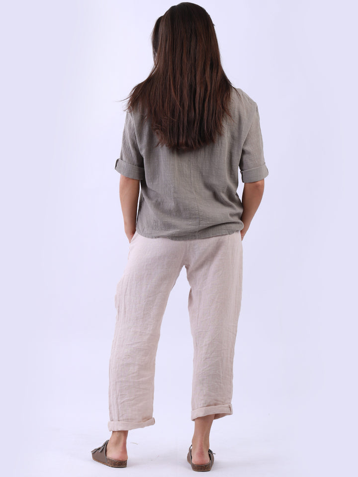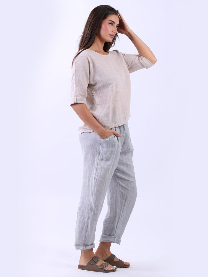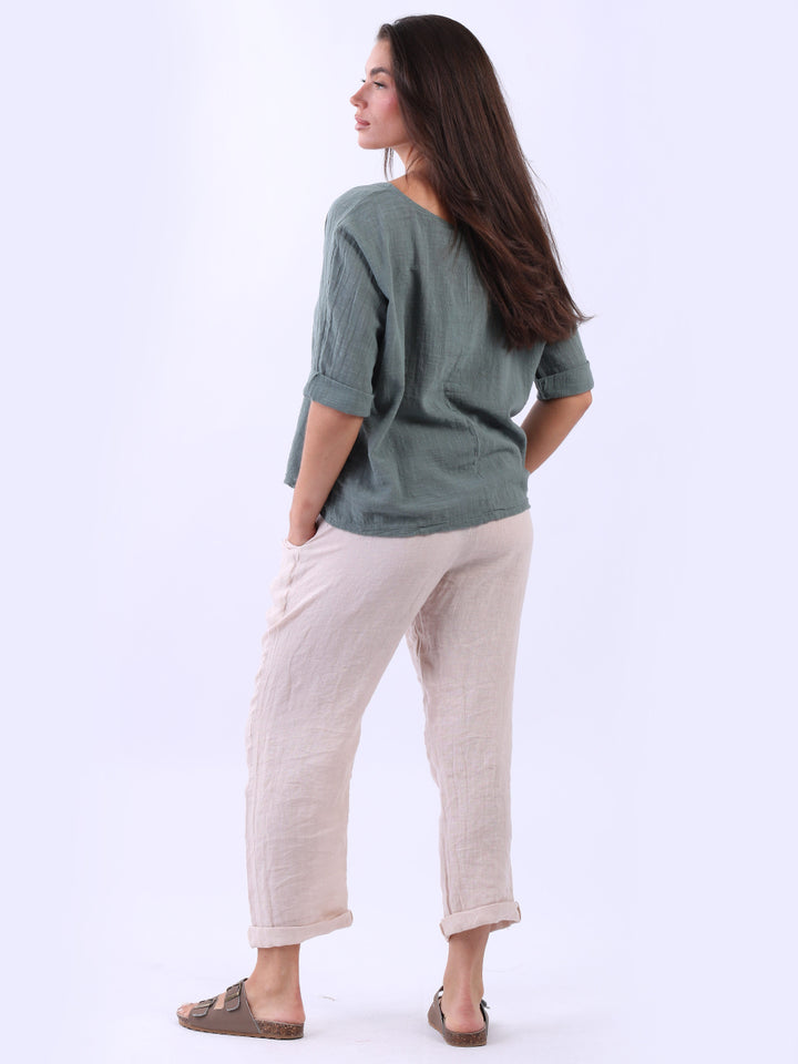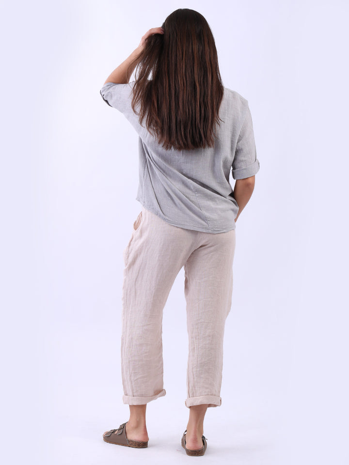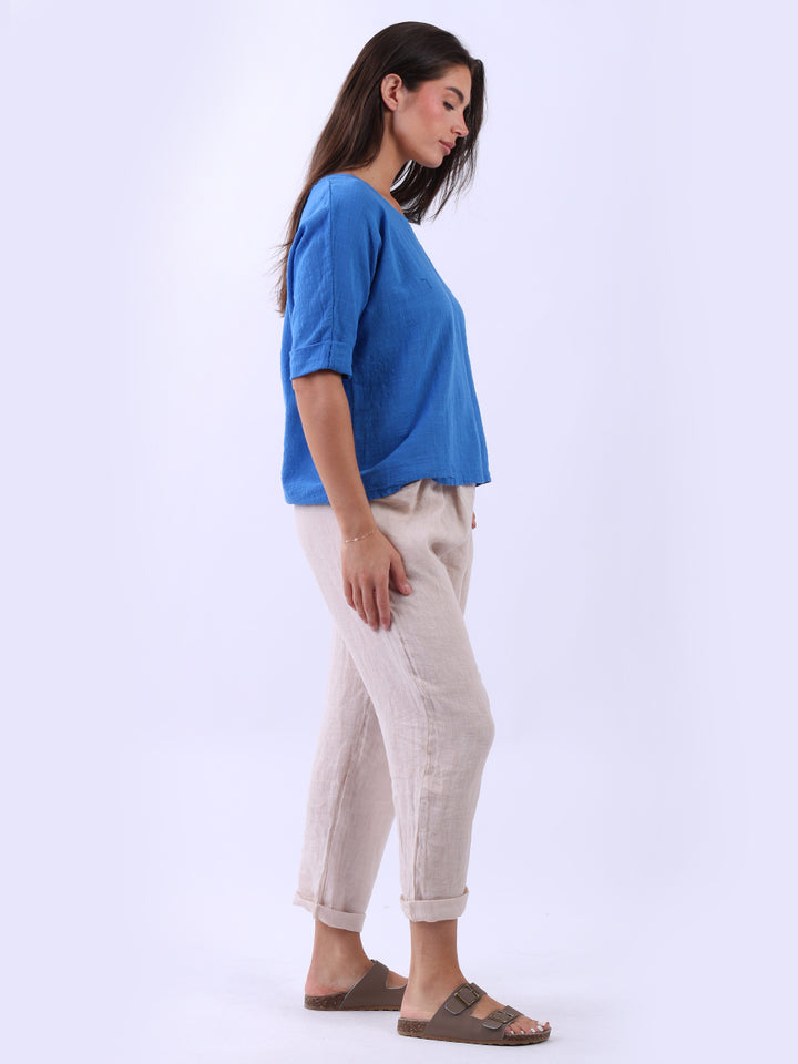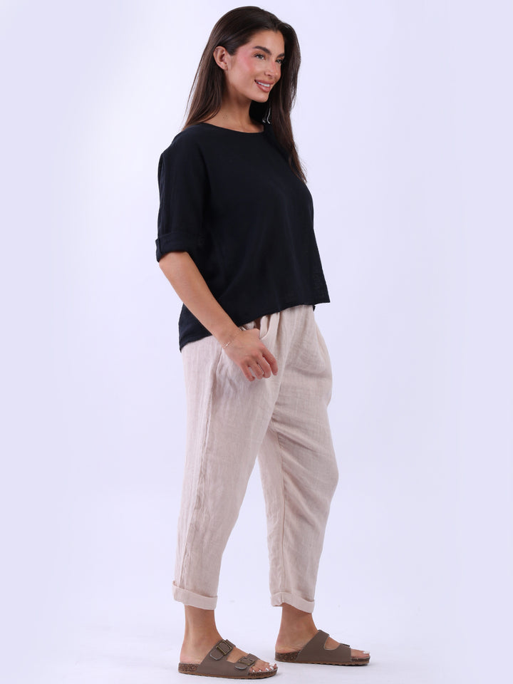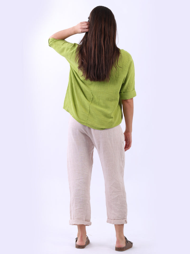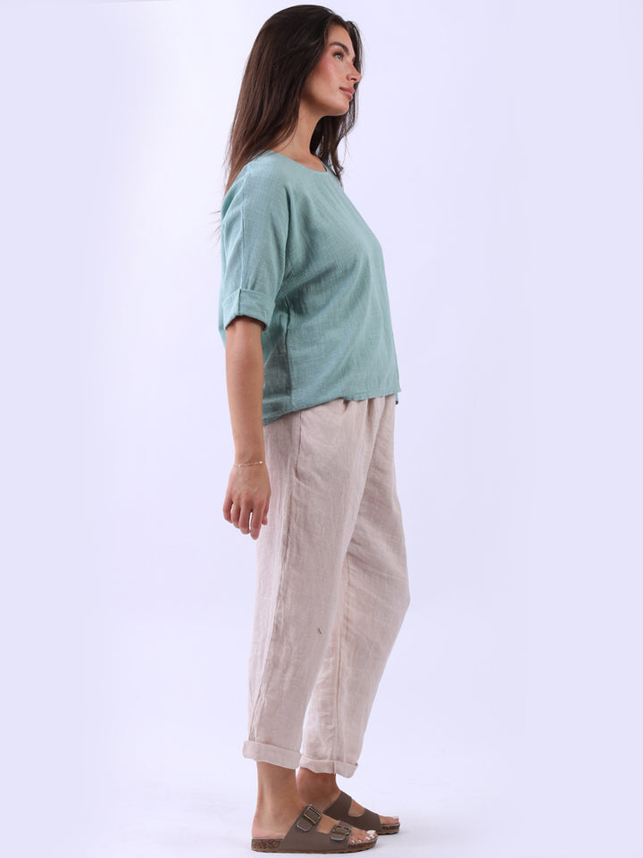 Add a classic and sleek touch of solid colors to the summer wardrobe with this plain boxy crop top. It is breathable and relaxing, thanks to its ultra-soft cotton fabric. The rolled-up sleeves add a carefree vibe, maintaining its laidback look. This sophisticated crop top is now in wearer reach for an effortless stylish look this season and beyond.