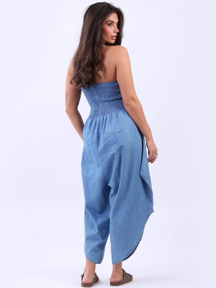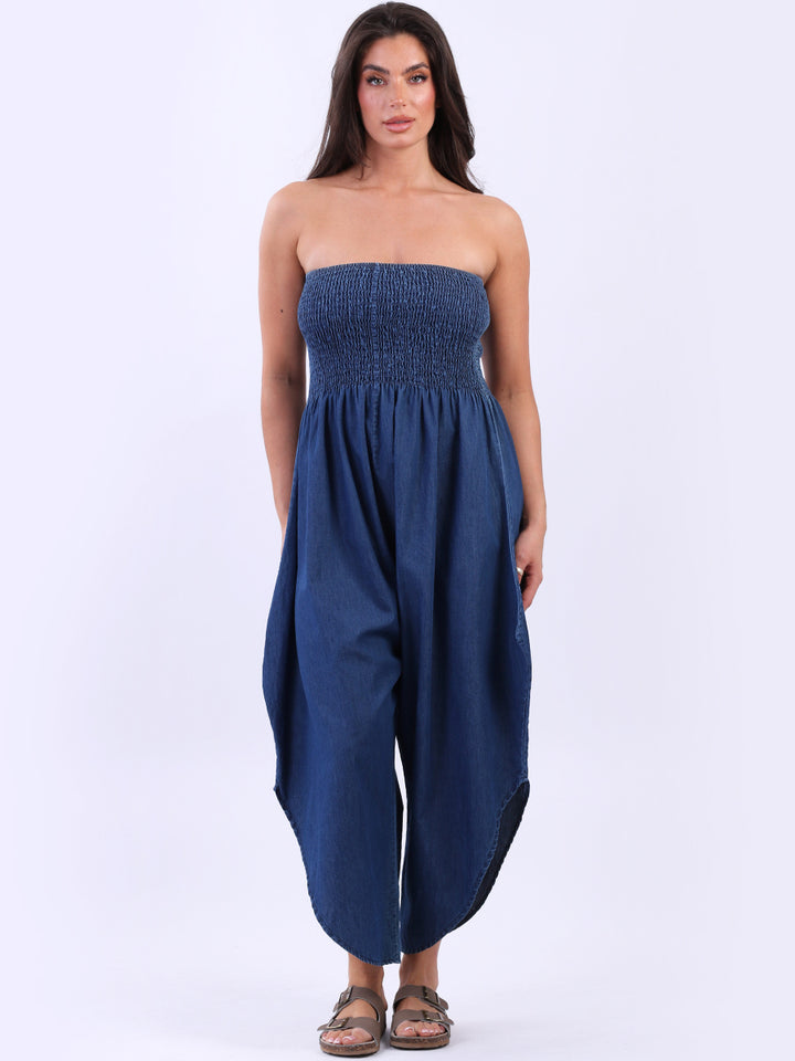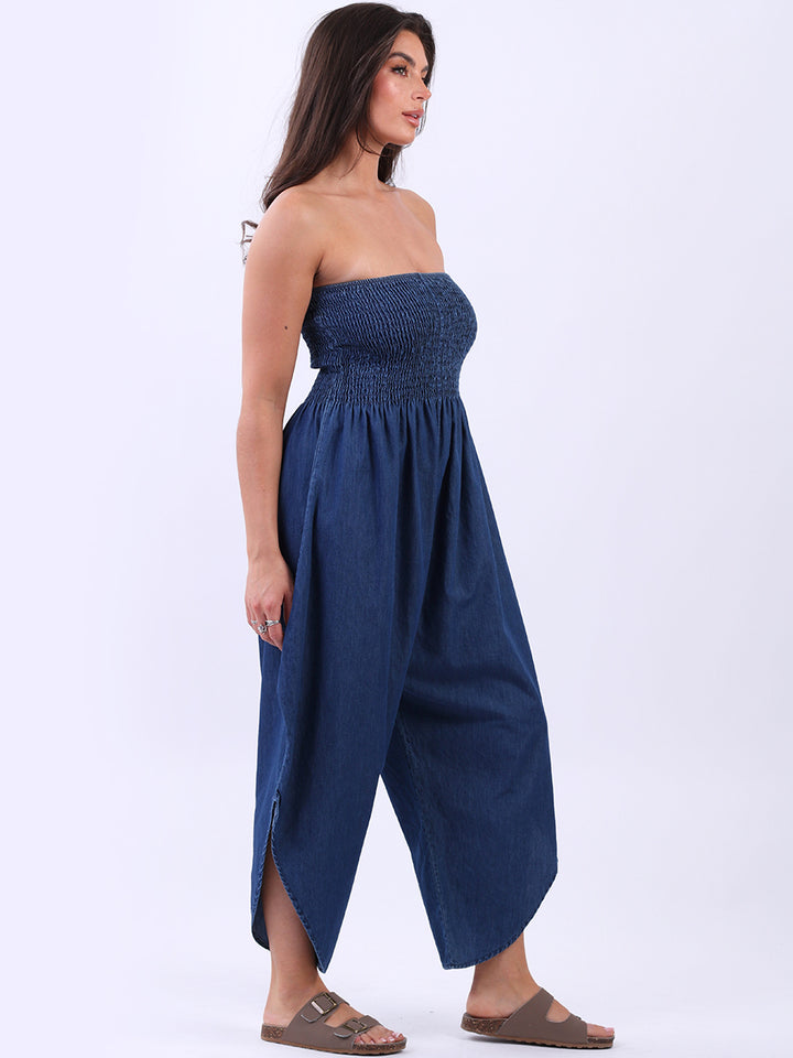 Step into elegance with these creative and sleek denim tube jumpsuits, made in Italy and crafted from pure cotton for a breathable and soft touch. Featuring a smocked yoke for a trendy yet unique look and a tulip bottom hem that enhances flattering movement with a wide-leg silhouette. Dress it with high heels to get charm in gatherings.