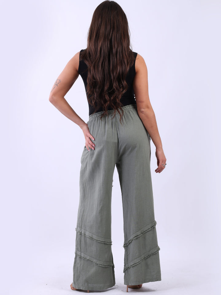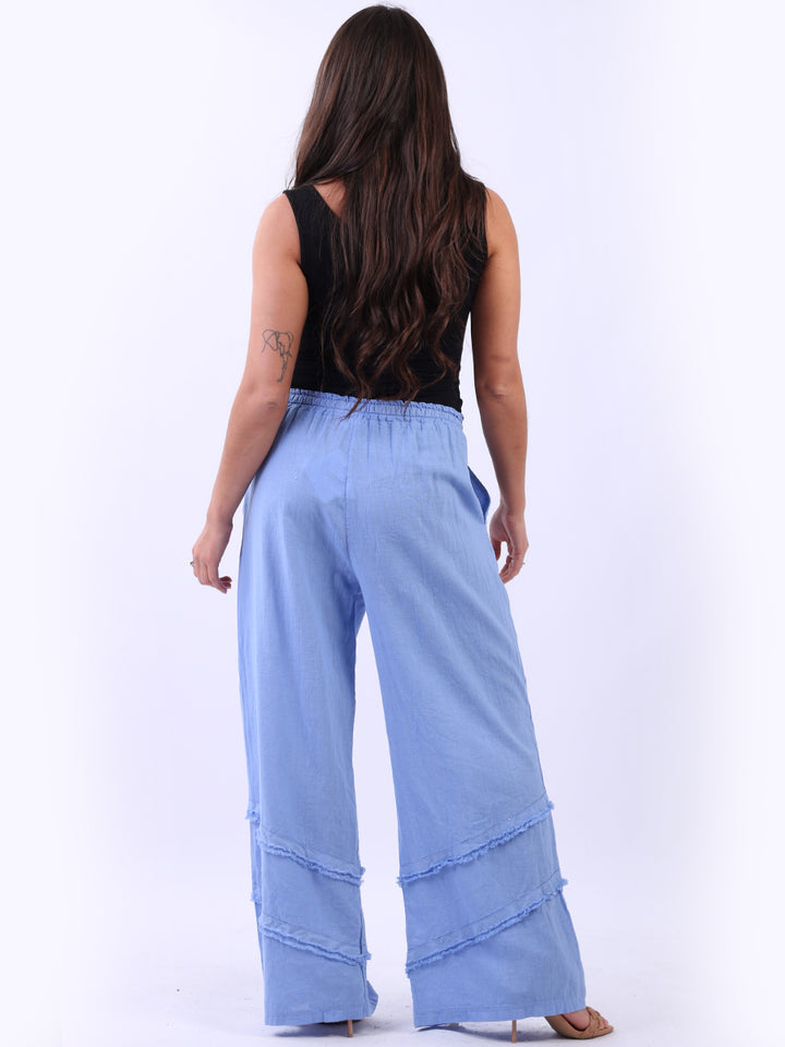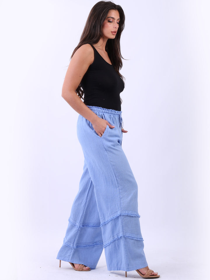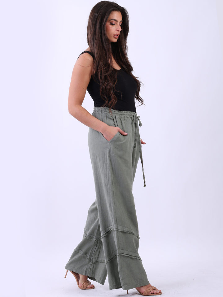 Comfort and style goes hand in hand in this extremely popular women wearer’s palazzo trousers. Made in Italy with soft and graceful linen fabric that is most suited for all year round cloth choices. Adjustable waistline with drawstring, flared finish with raw edge patches around the hem that add character to the final look. Mix and match these trousers crop tops and cardigans.