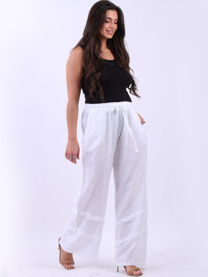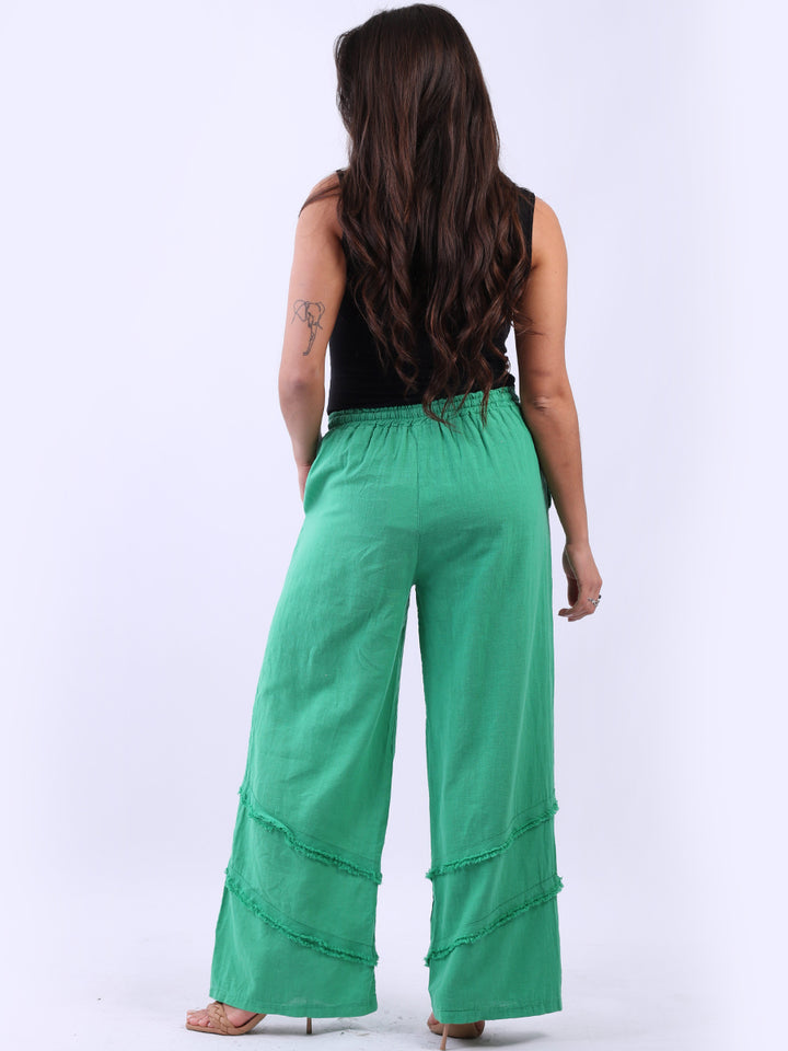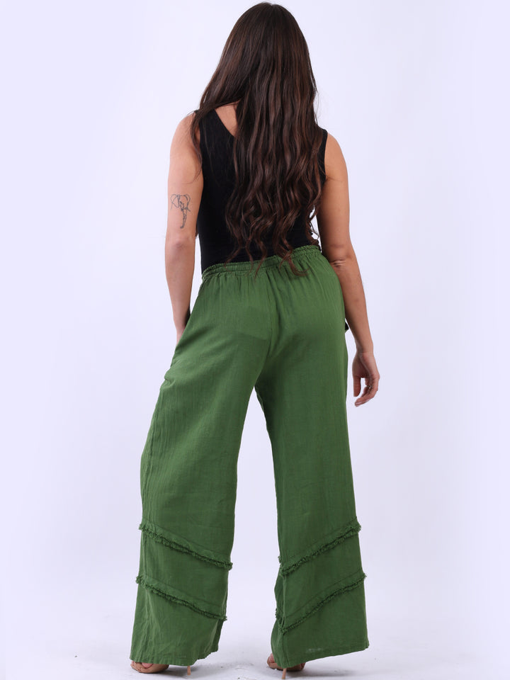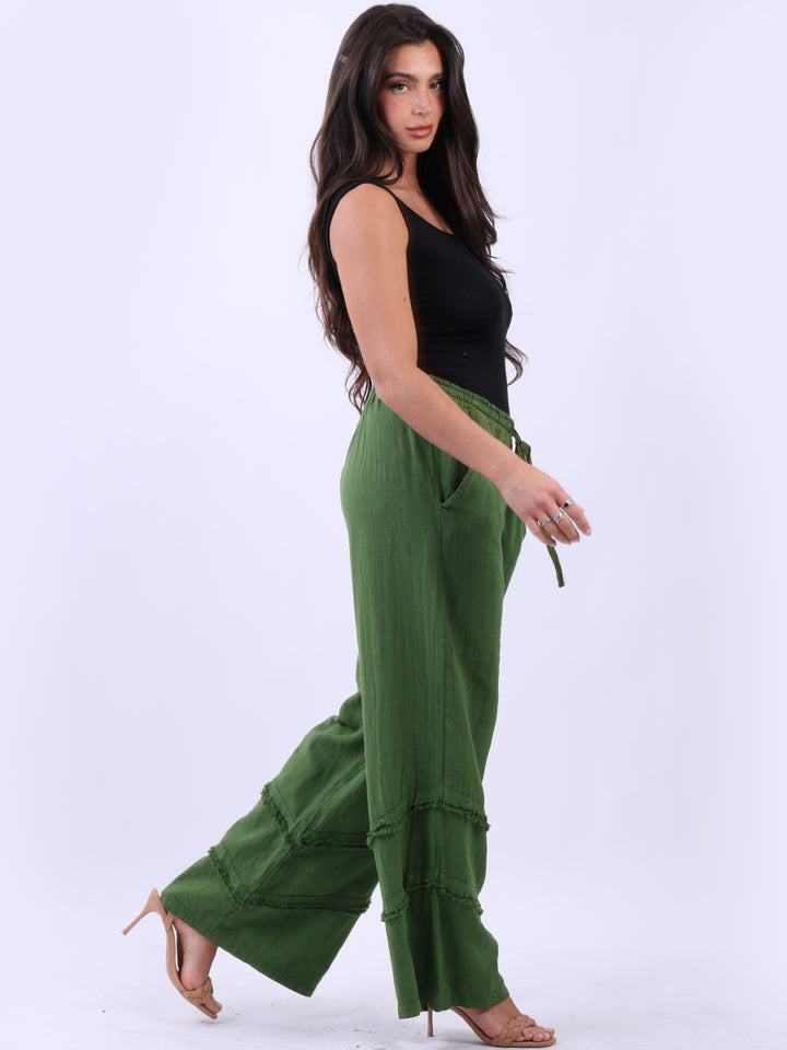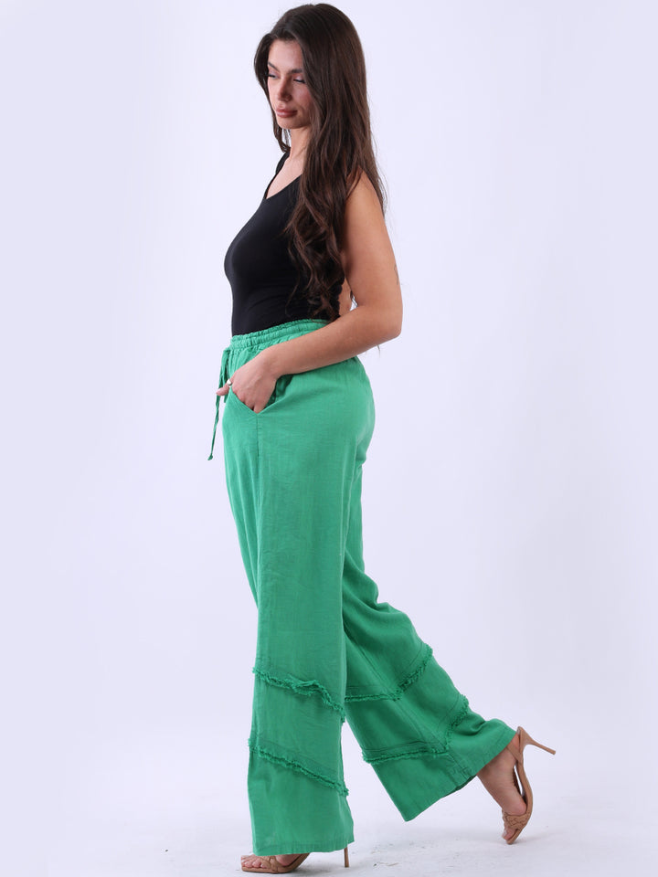 Comfort and style goes hand in hand in this extremely popular women wearer’s palazzo trousers. Made in Italy with soft and graceful linen fabric that is most suited for all year round cloth choices. Adjustable waistline with drawstring, flared finish with raw edge patches around the hem that add character to the final look. Mix and match these trousers crop tops and cardigans.