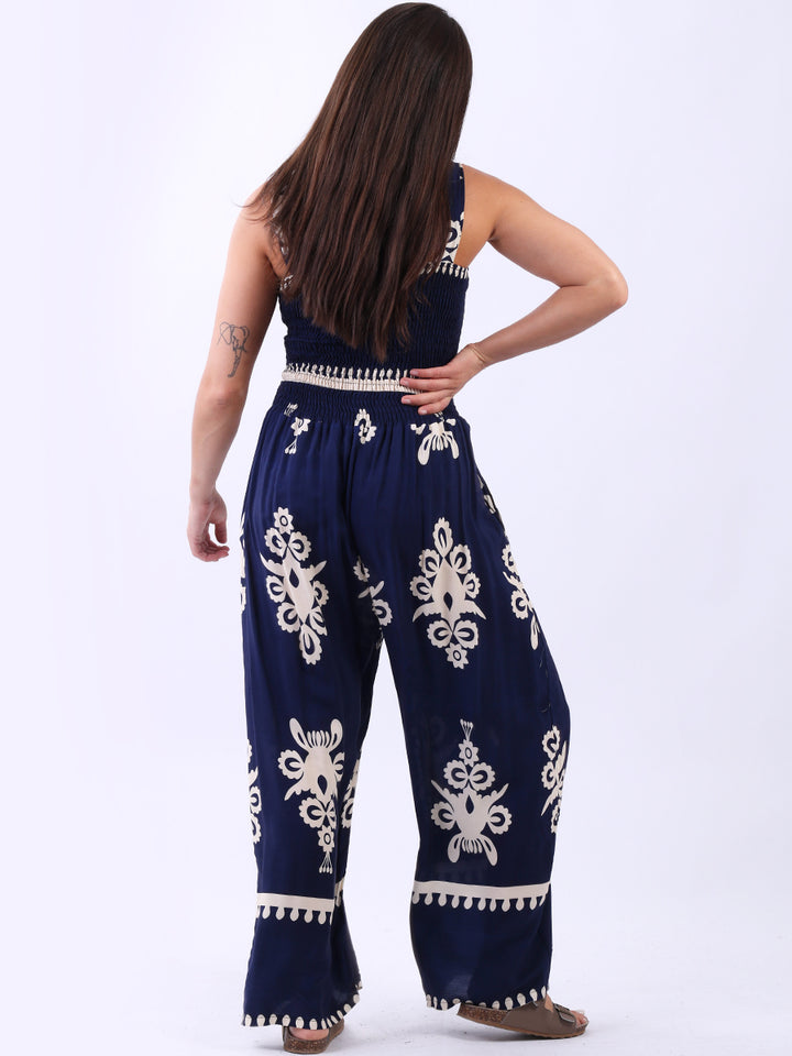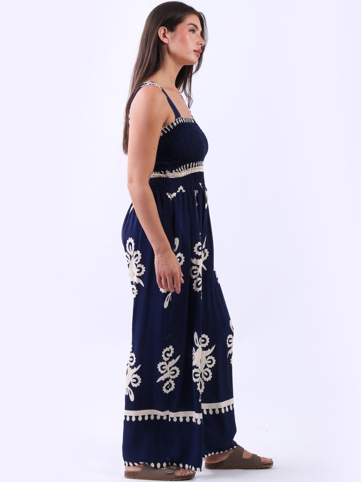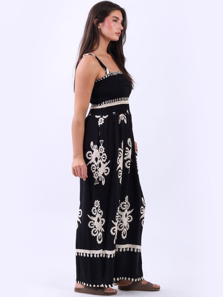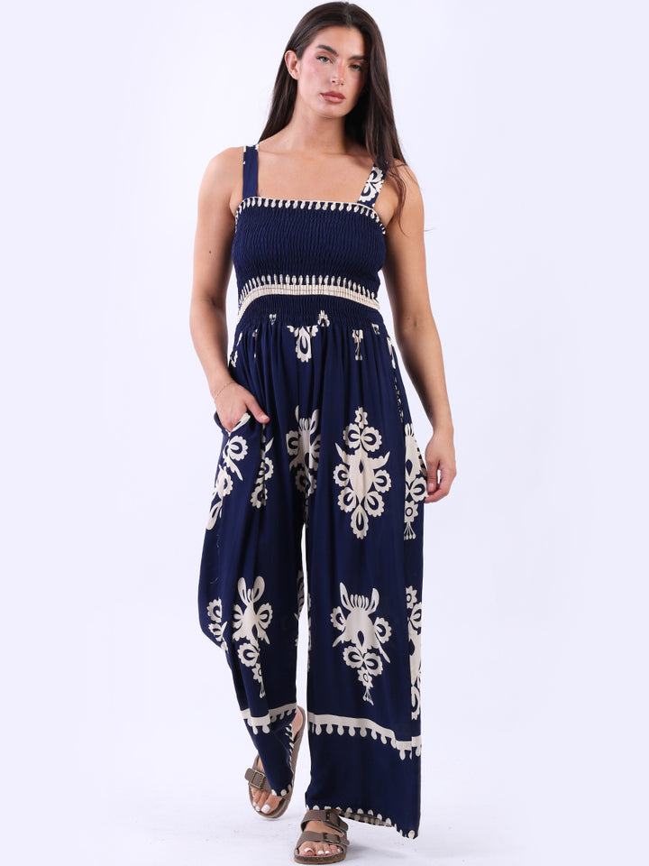 This striking smocked yoke jumpsuit perfectly embodies the Italian Moda, making it ideal for fashion forward ladies. With intricate digital print, this casual jumpsuit radiates a youthful vibe. Shoulder straps and wide leg design add more to its comfort and charm, making it a stand-out piece for any wardrobe.
