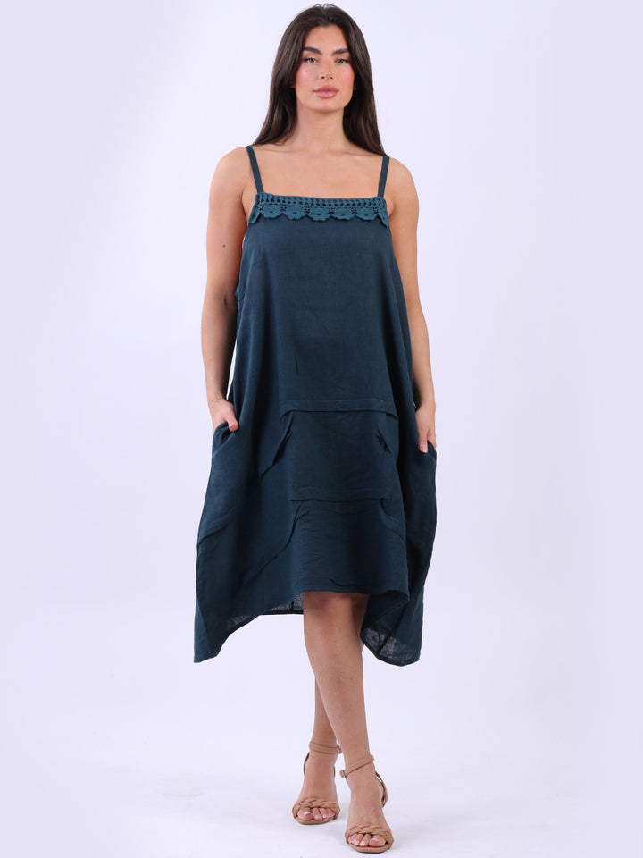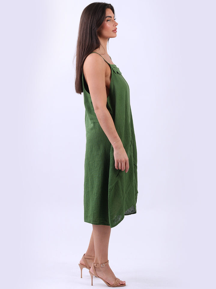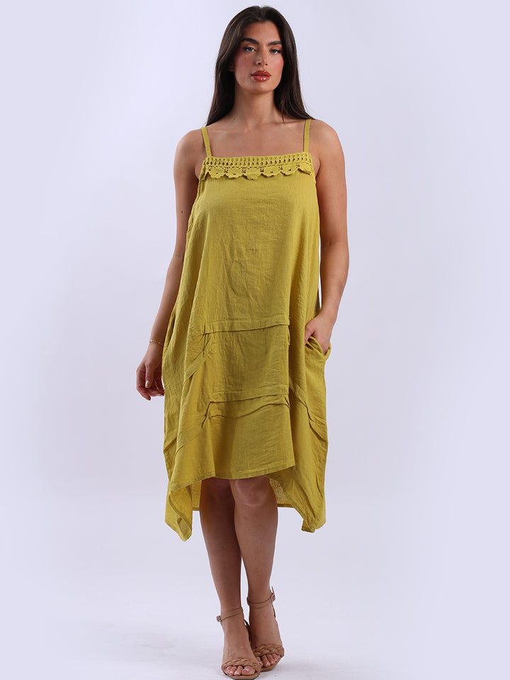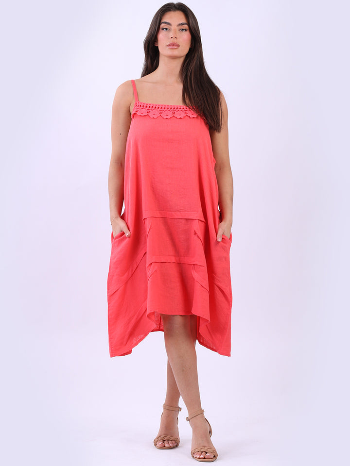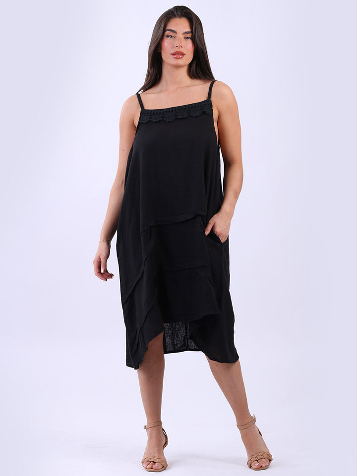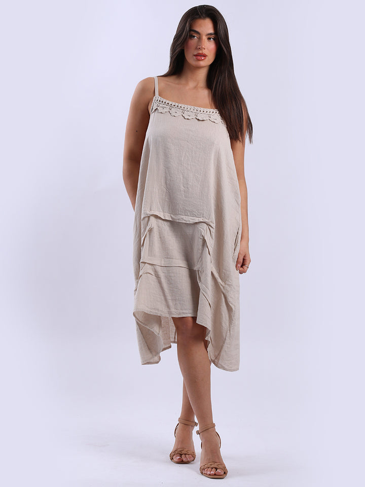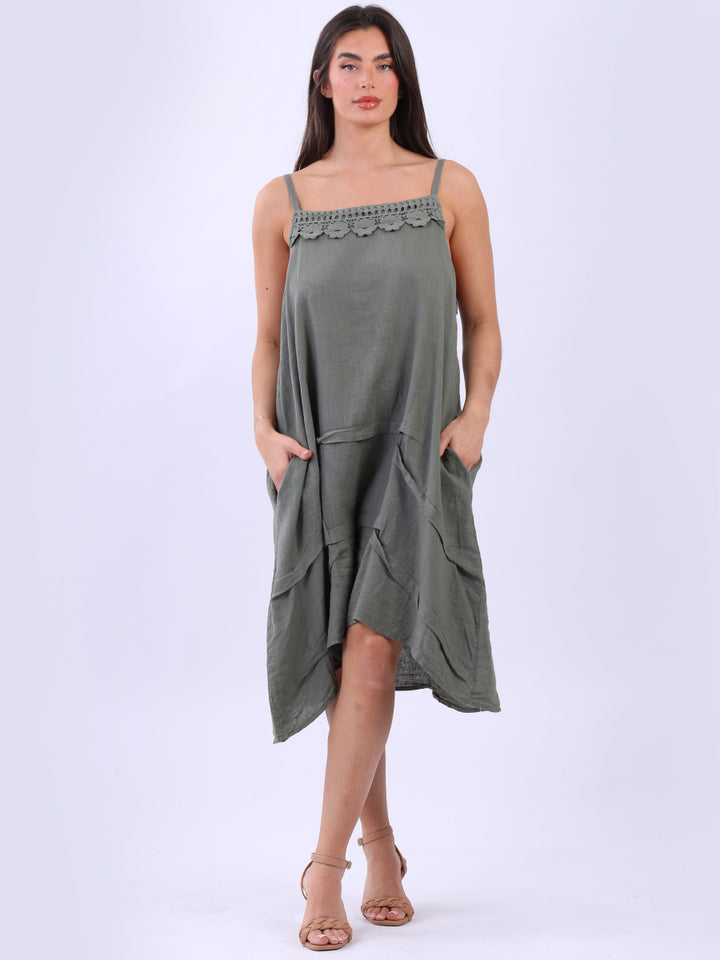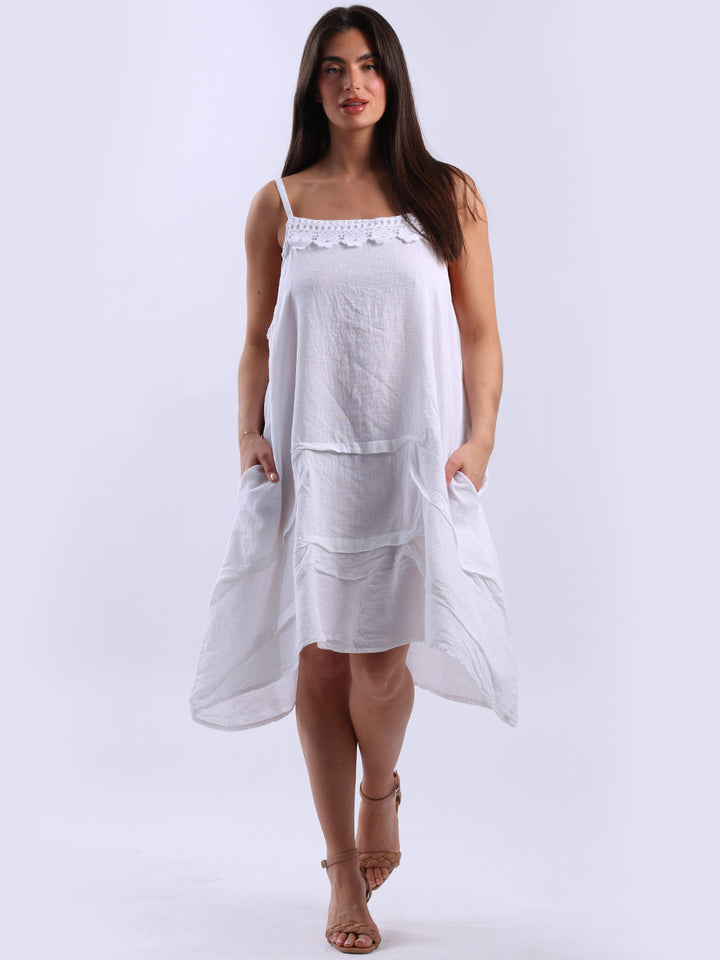 Curious about what to wear in Italy? This plain sleeveless dress with a crochet lace detailed neckline is a perfect choice. Women wearers can embrace the elegance and comfort of this lightweight loose fit dress that is made in Italy from blended fabric ideal for the summer season.
