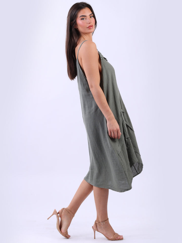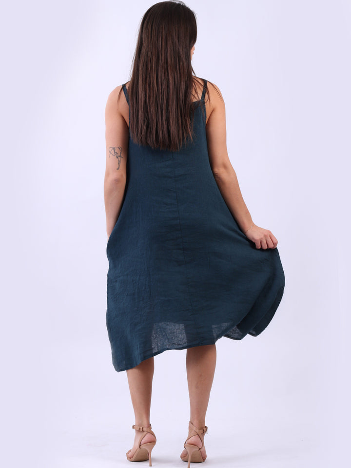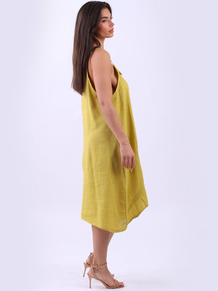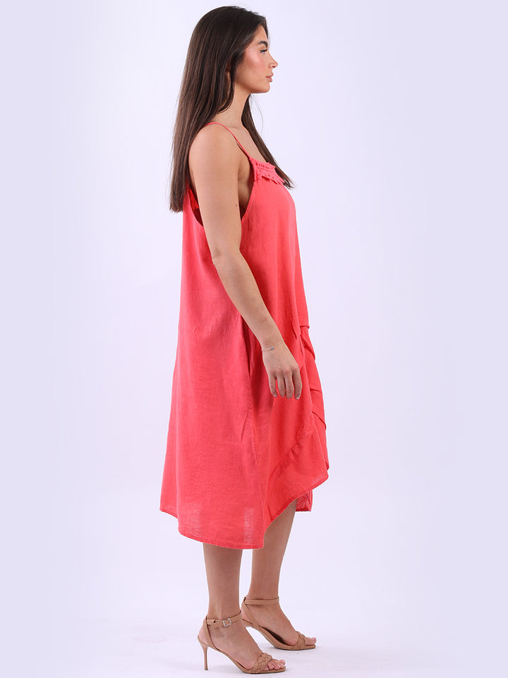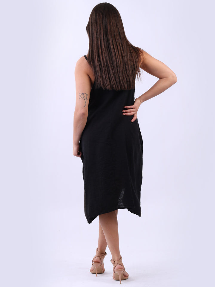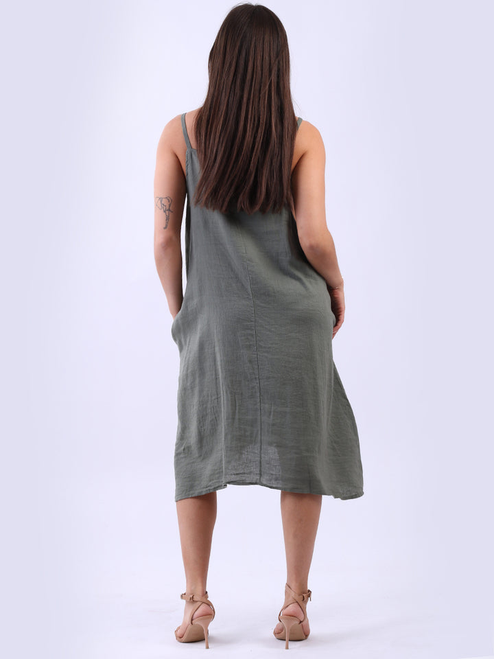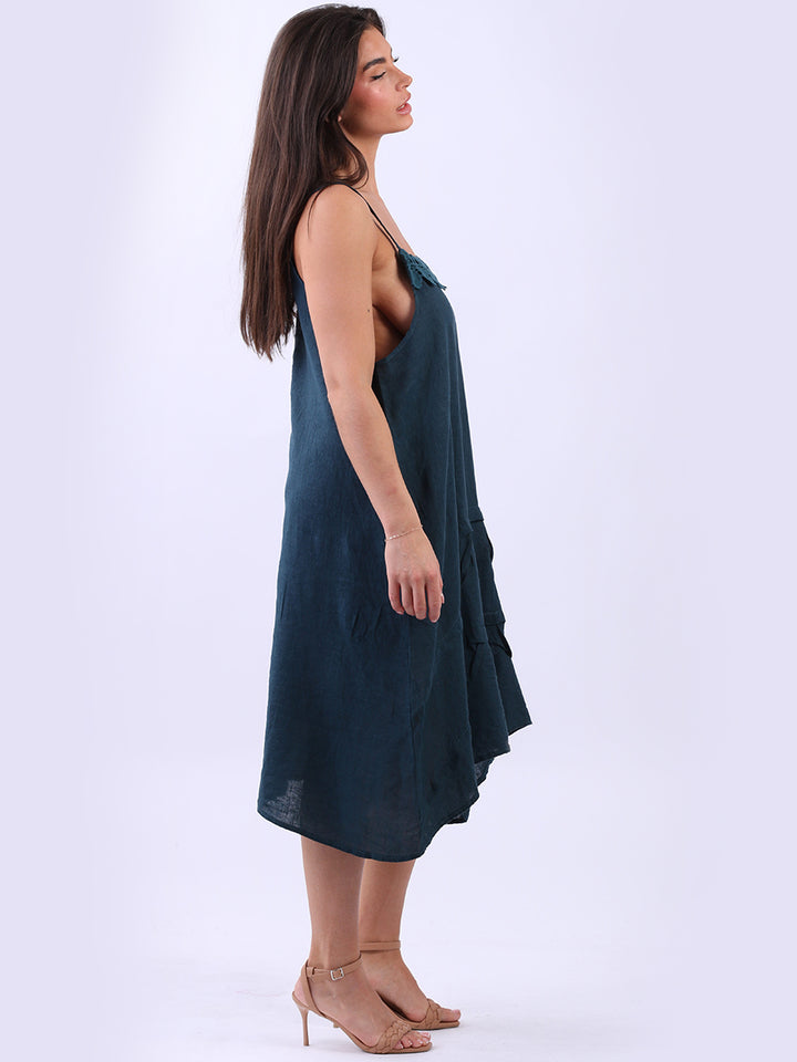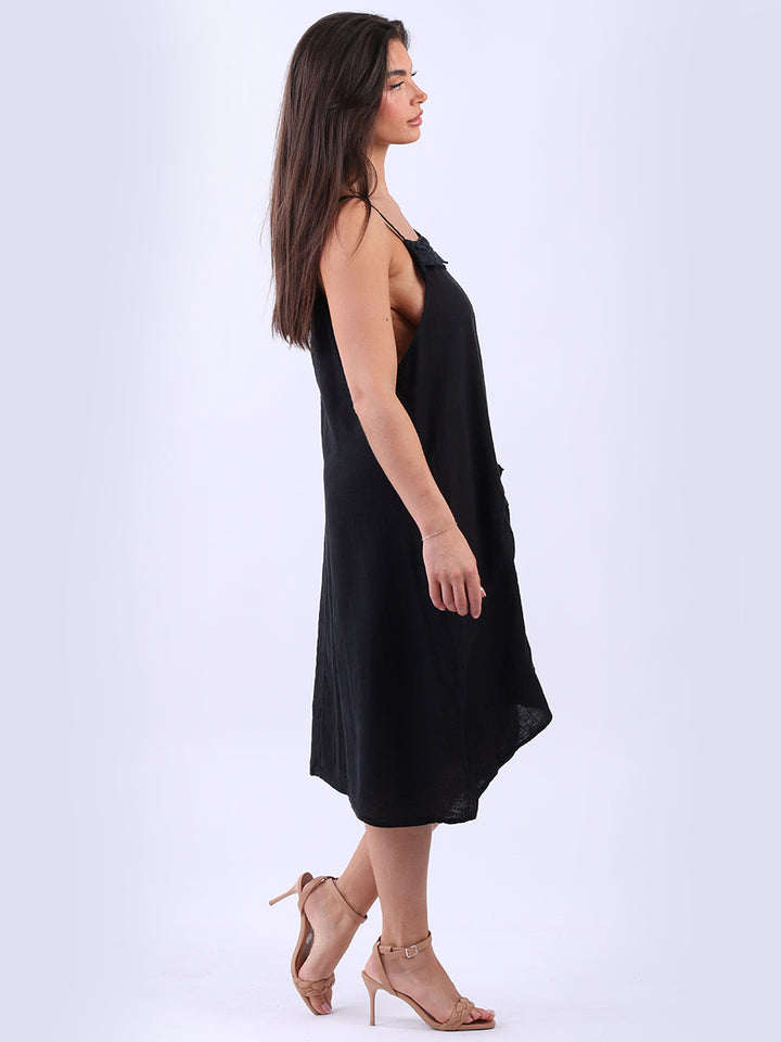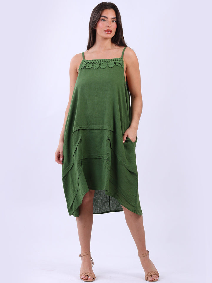 Curious about what to wear in Italy? This plain sleeveless dress with a crochet lace detailed neckline is a perfect choice. Women wearers can embrace the elegance and comfort of this lightweight loose fit dress that is made in Italy from blended fabric ideal for the summer season.