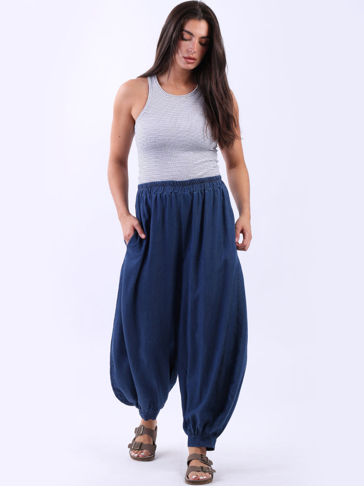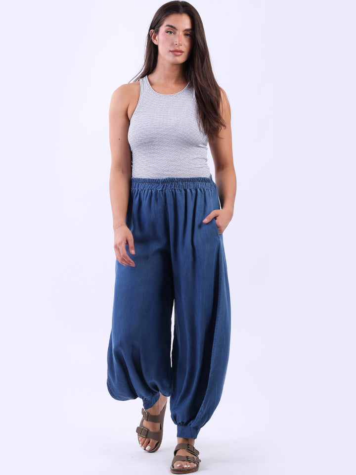 Step into the world of Italian moda with these ladies plain denim trousers by Redwholesale Clothing Store Manchester. Creating a relaxing laid-back look, these trousers feature a comfortable elastic waist and functional side pockets. Timelessly trendy balloon hem, creates a voluminous silhouette, exuding a billowing effect with every move.