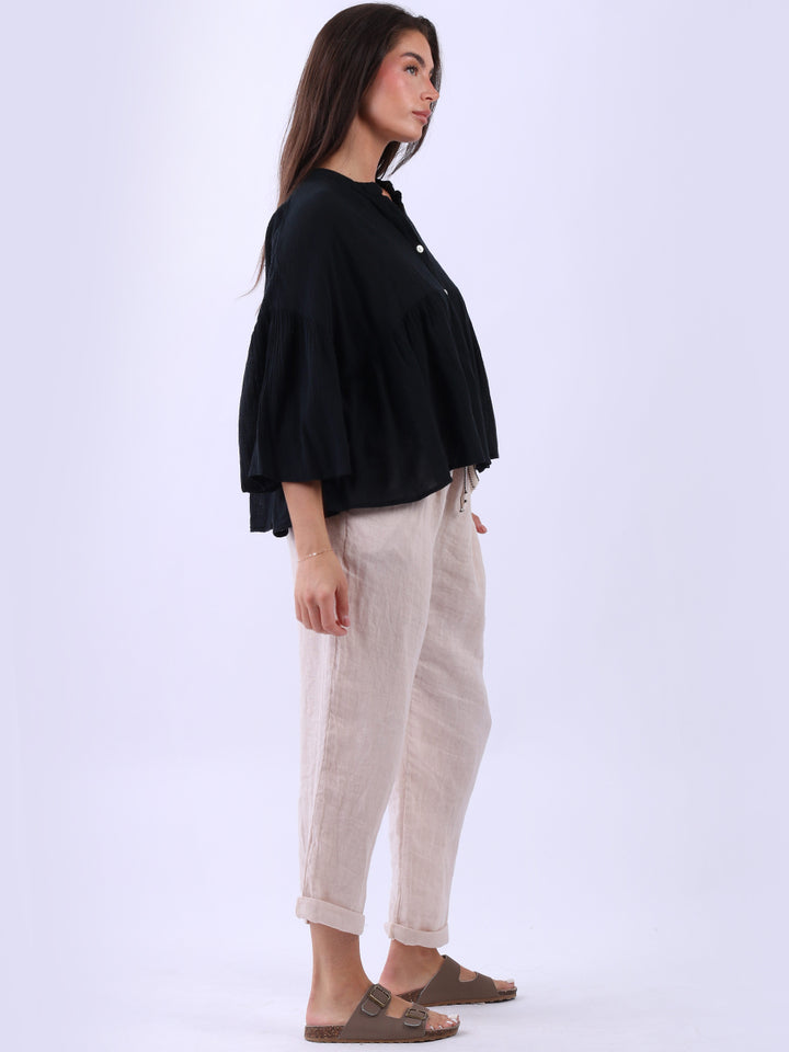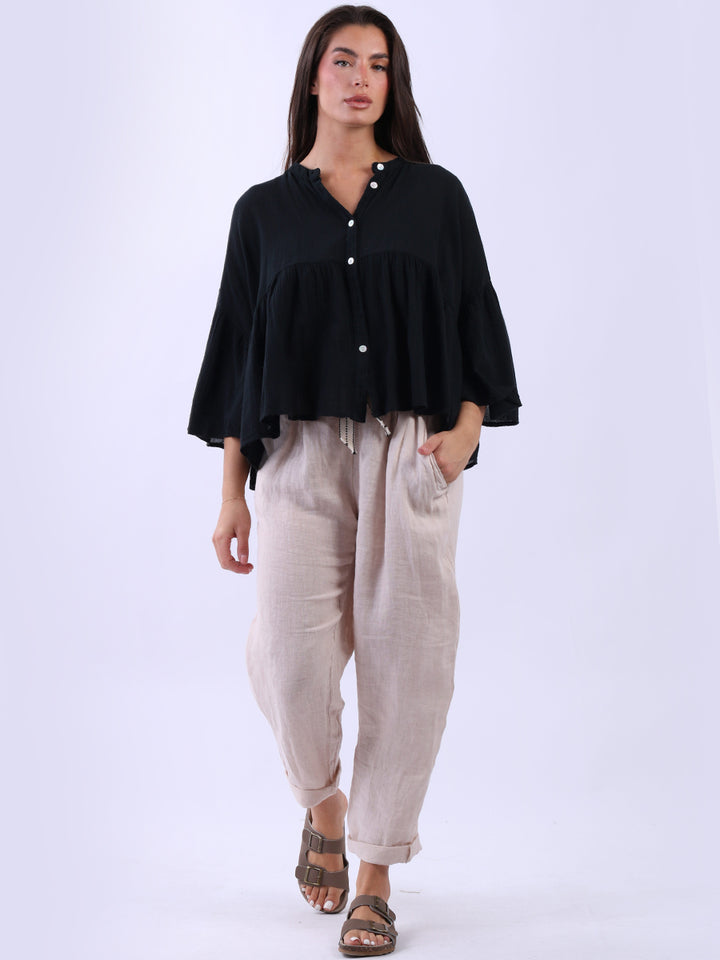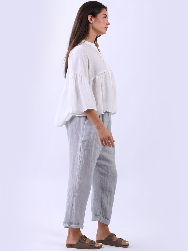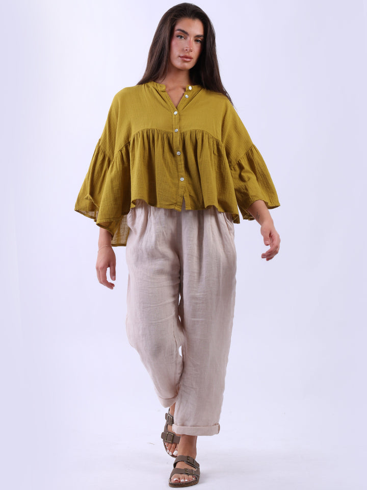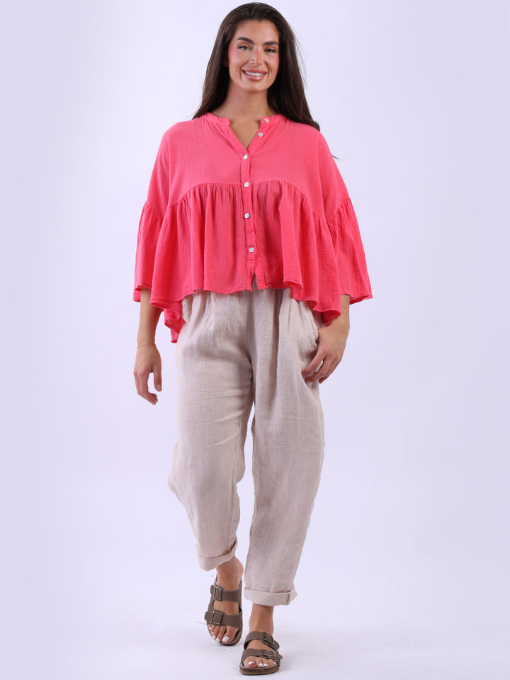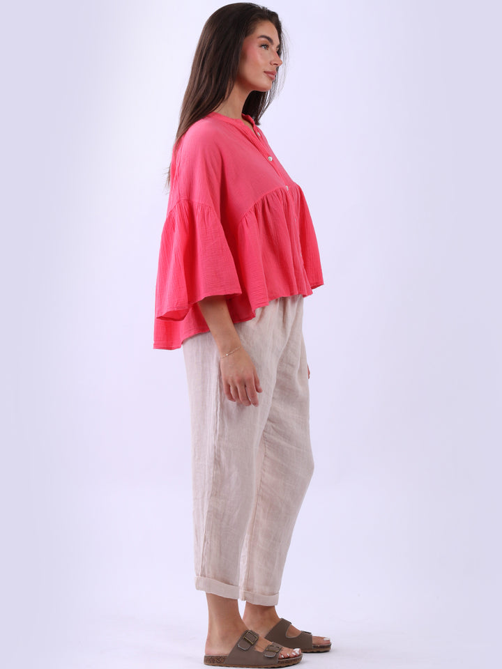 This plain collarless button down top from Redwholesale Fashion Boutique is truly ravishing with its delicate peplum design. The subtle ruffle detailing exudes a soft, feminine vibe, complementing its classy and polished look. Experience its versatility by pairing it with jeans or a skirt for various occasions.