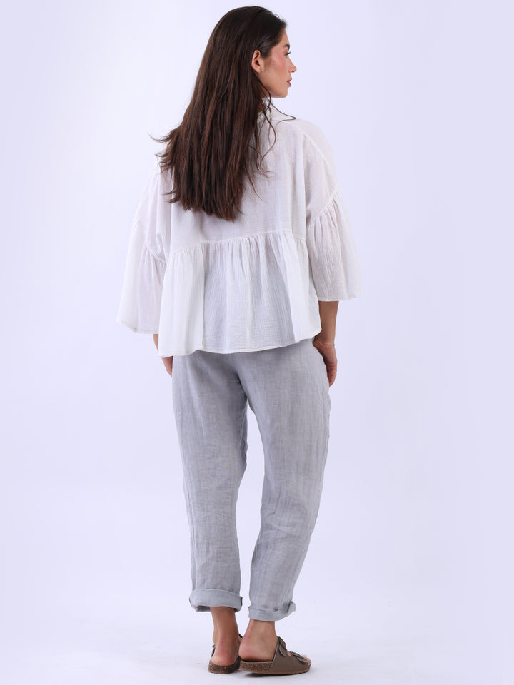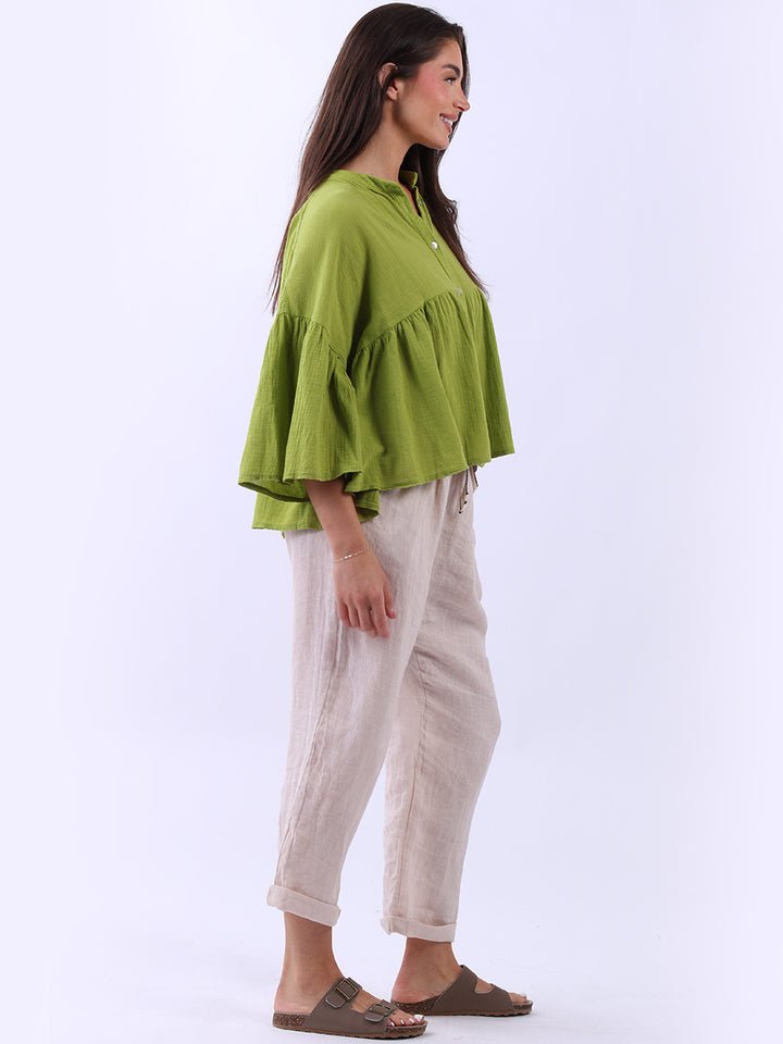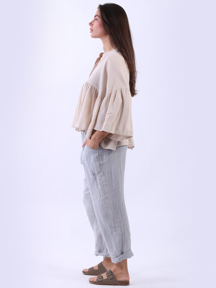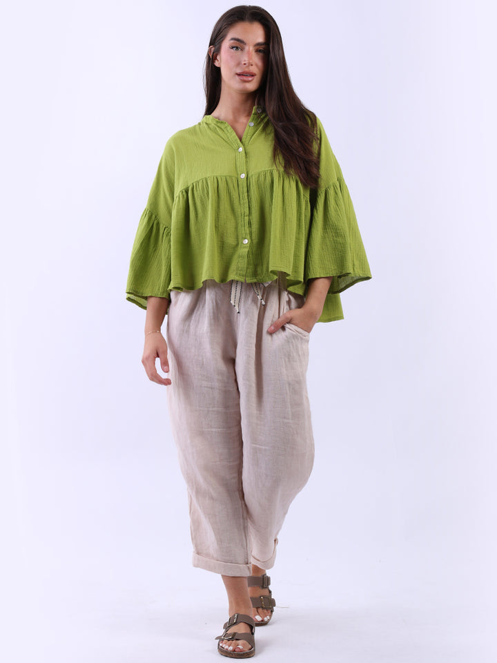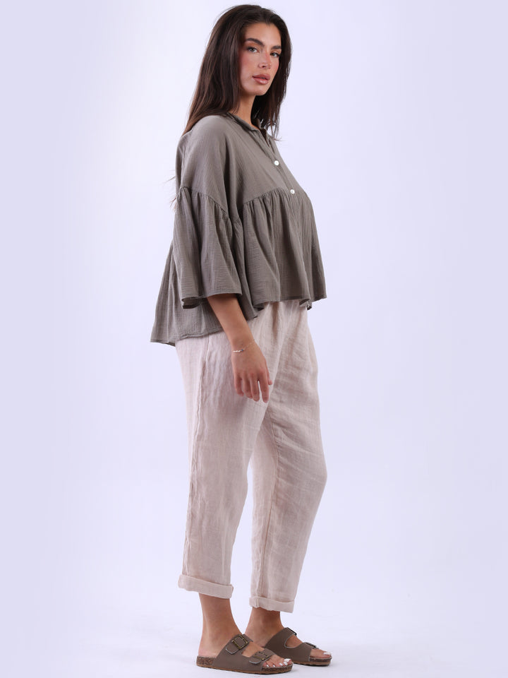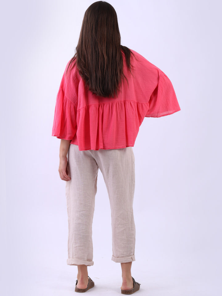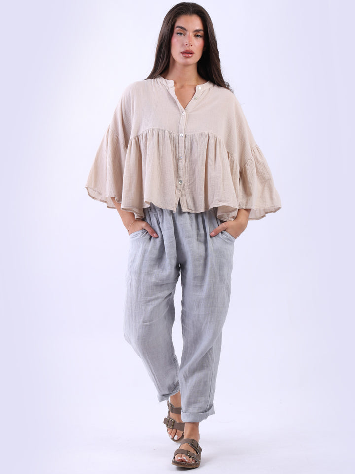 This plain collarless button down top from Redwholesale Fashion Boutique is truly ravishing with its delicate peplum design. The subtle ruffle detailing exudes a soft, feminine vibe, complementing its classy and polished look. Experience its versatility by pairing it with jeans or a skirt for various occasions.