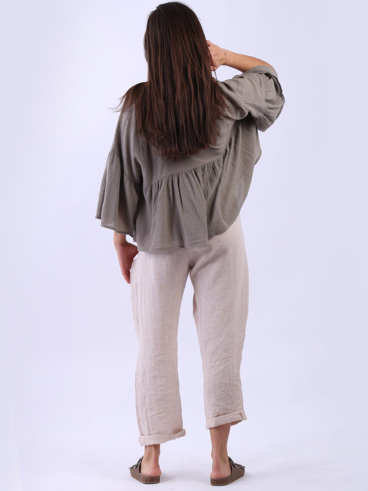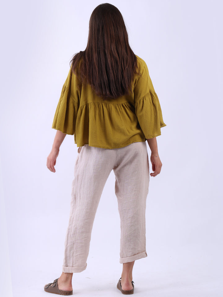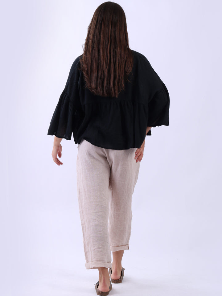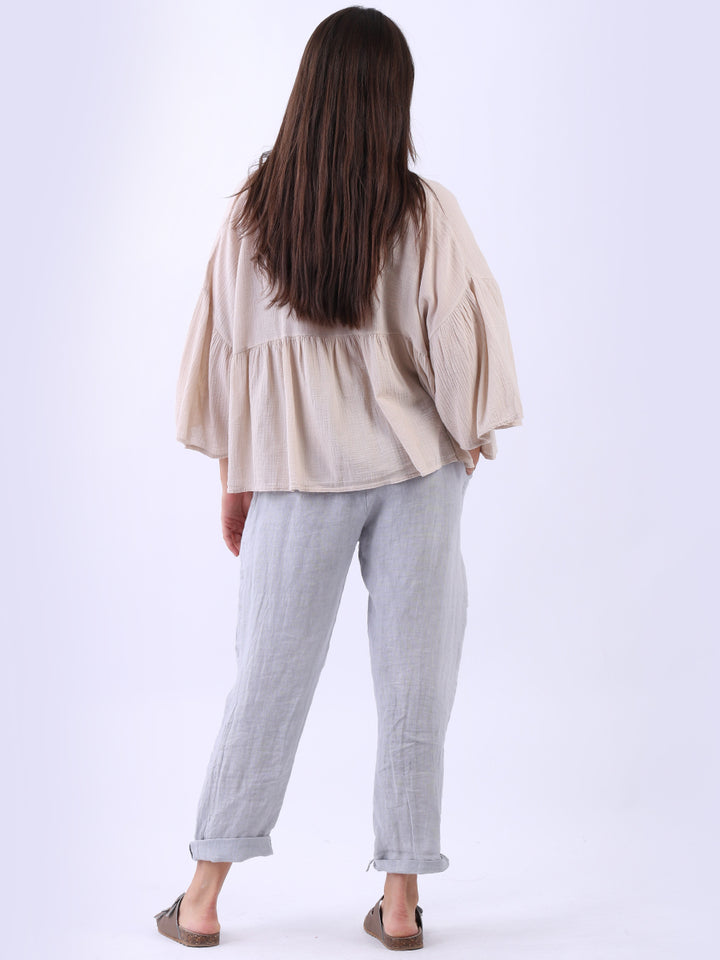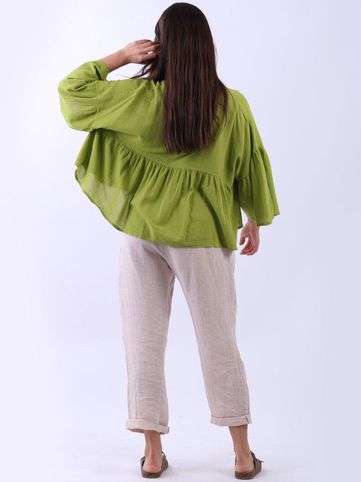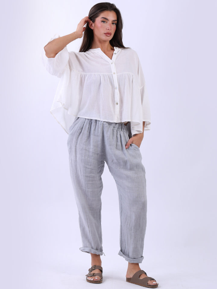 This plain collarless button down top from Redwholesale Fashion Boutique is truly ravishing with its delicate peplum design. The subtle ruffle detailing exudes a soft, feminine vibe, complementing its classy and polished look. Experience its versatility by pairing it with jeans or a skirt for various occasions.