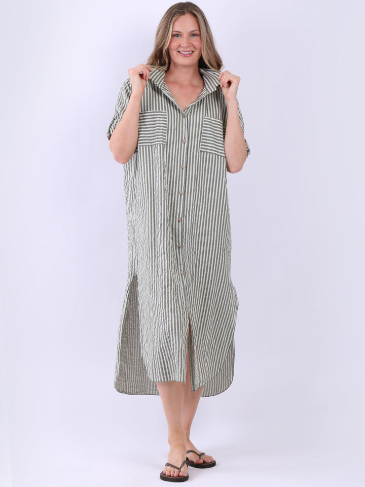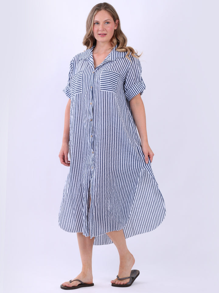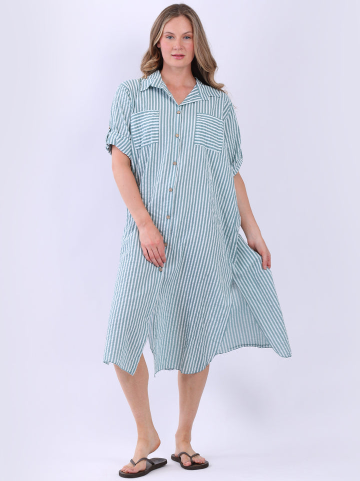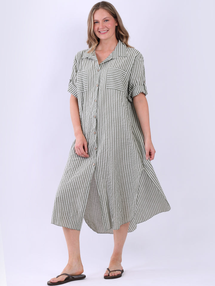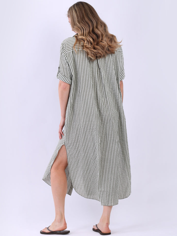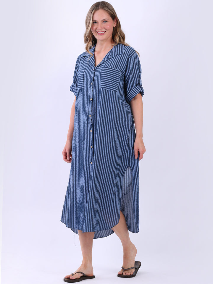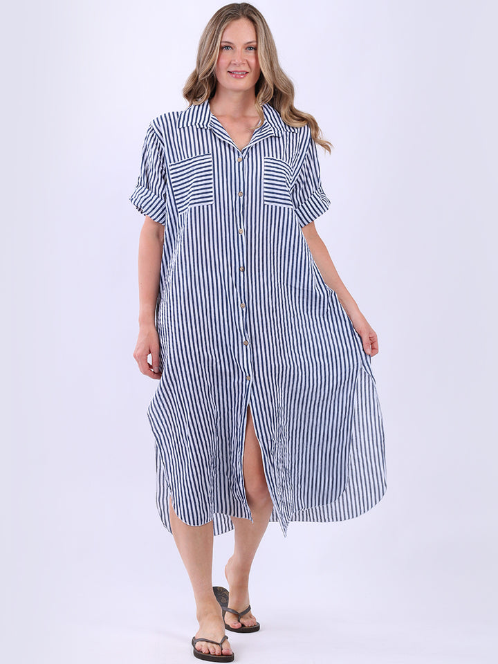 This casual lagenlook striped shirt dress in plus size is exclusively designed for warm weather. With a button down design and side slits, it offers a flattering silhouette, complementing the vertical stripes. The collared neck and short tabbed sleeves add a classic touch, while front pockets blend style with functionality.
