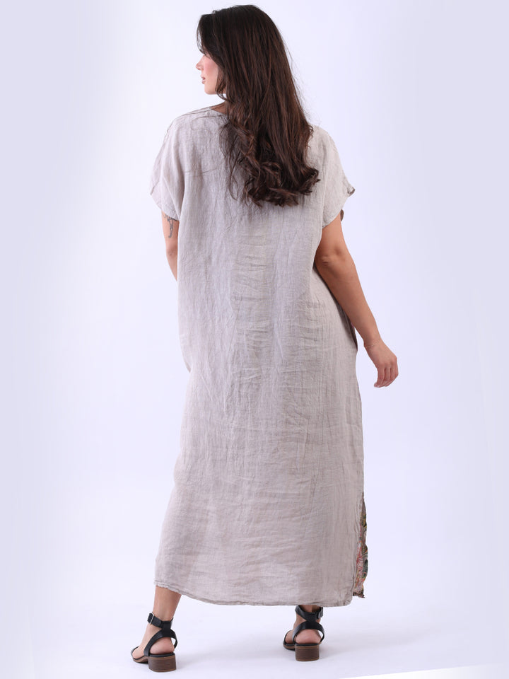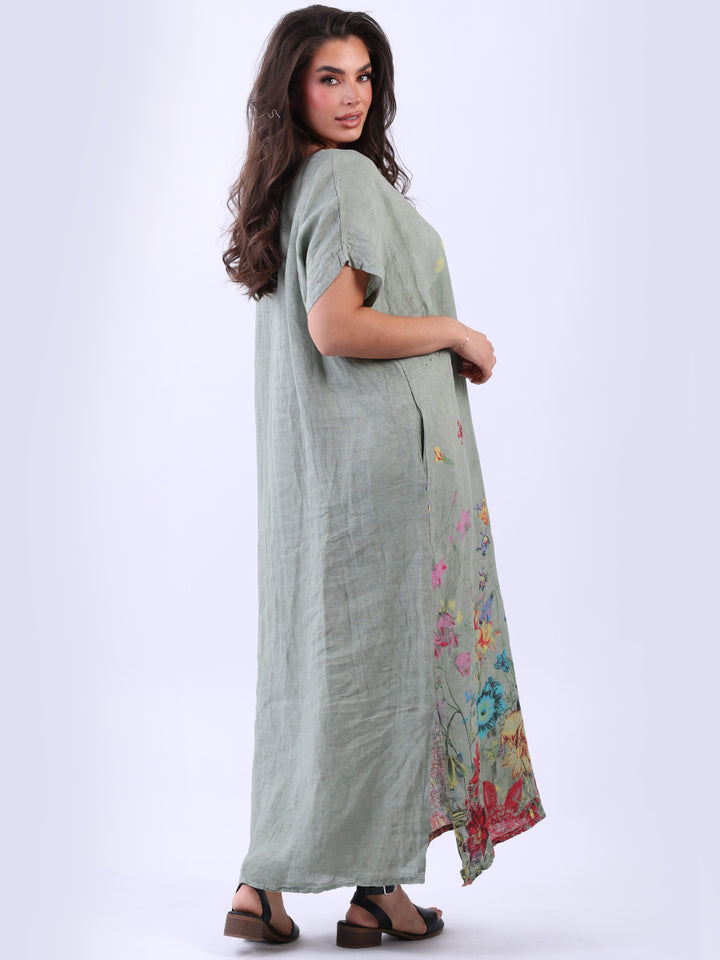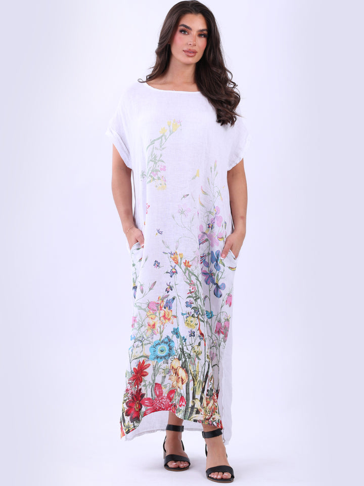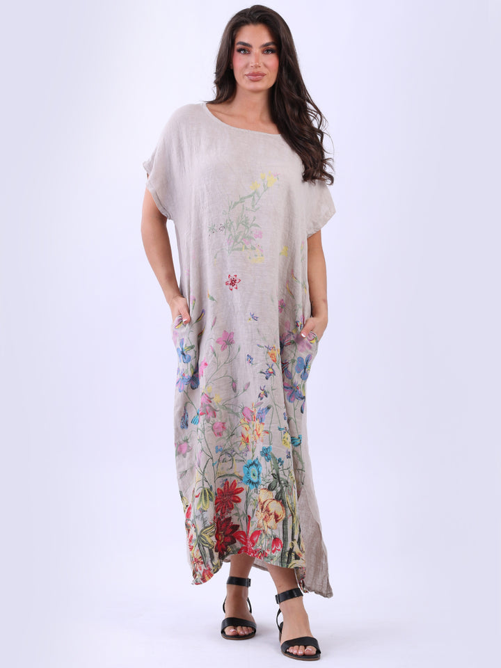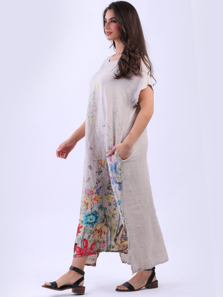 Style enthusiast ladies will love this Italian multi color garden print plus size dress with a solid base. It is lightweight and relaxing, thanks to its pure linen fabric and lagenlook fit. A simple round neckline and short sleeves make its printed hem the focal point while creating a balance. This nature inspired elegant dress is a go-to choice for a casual or semi-formal occasion.
