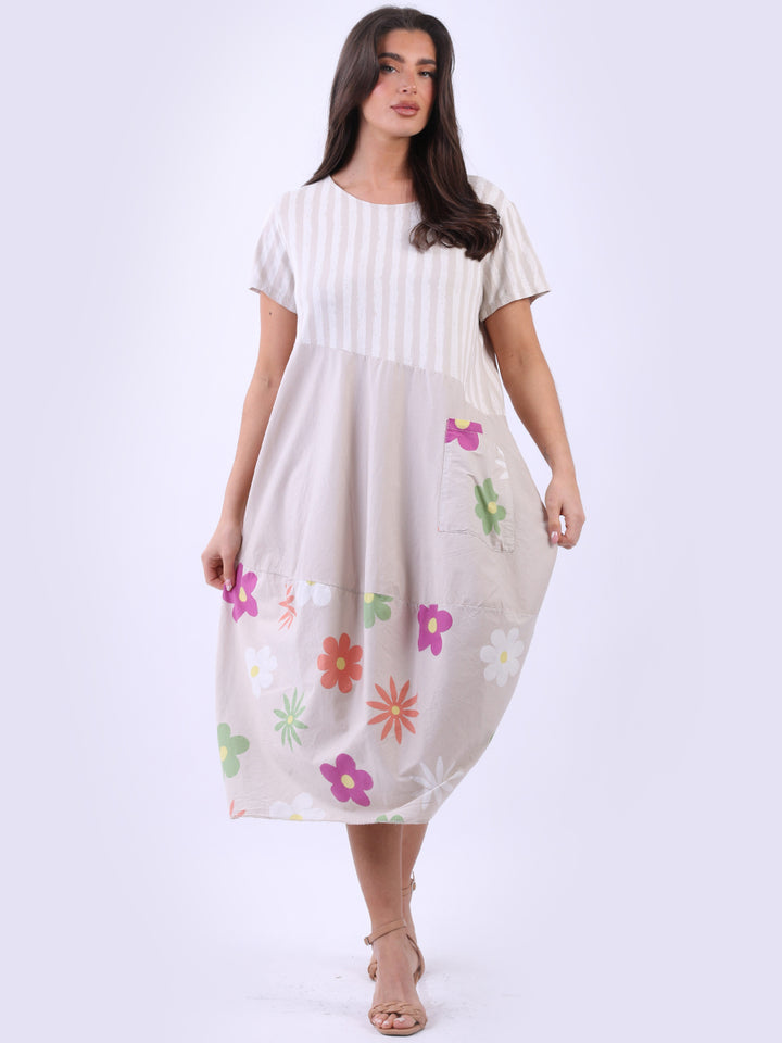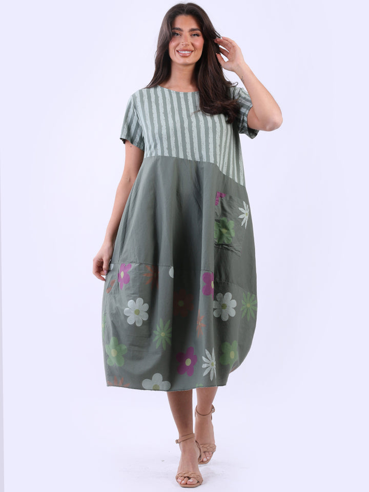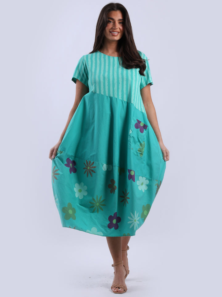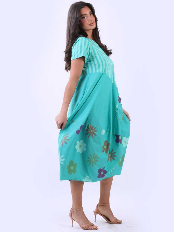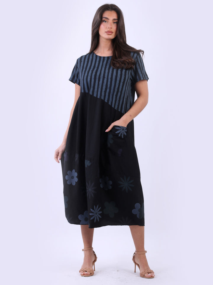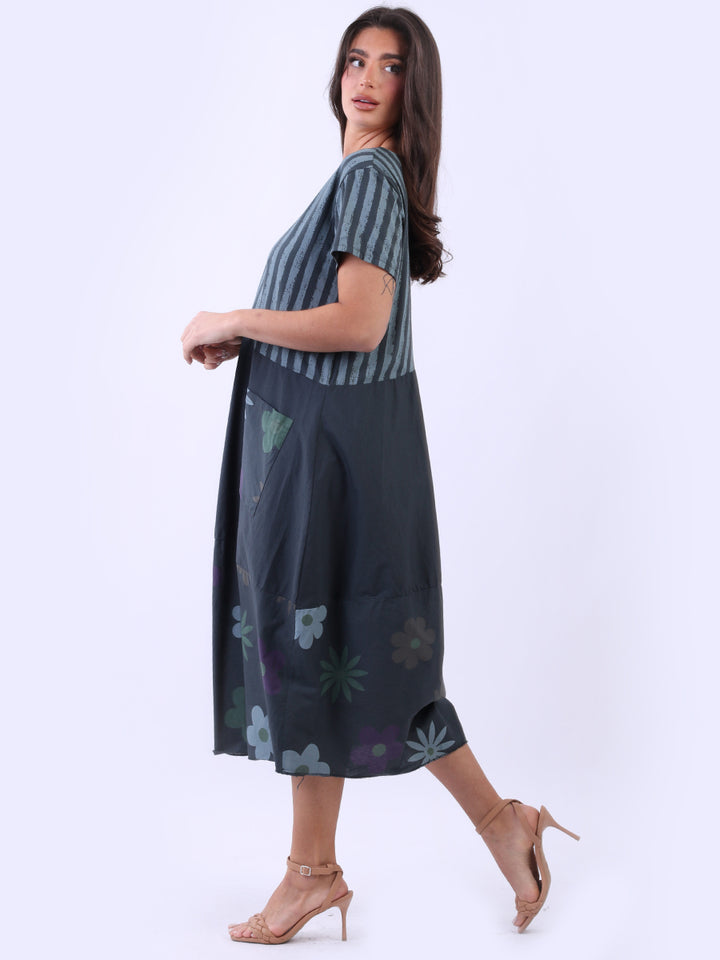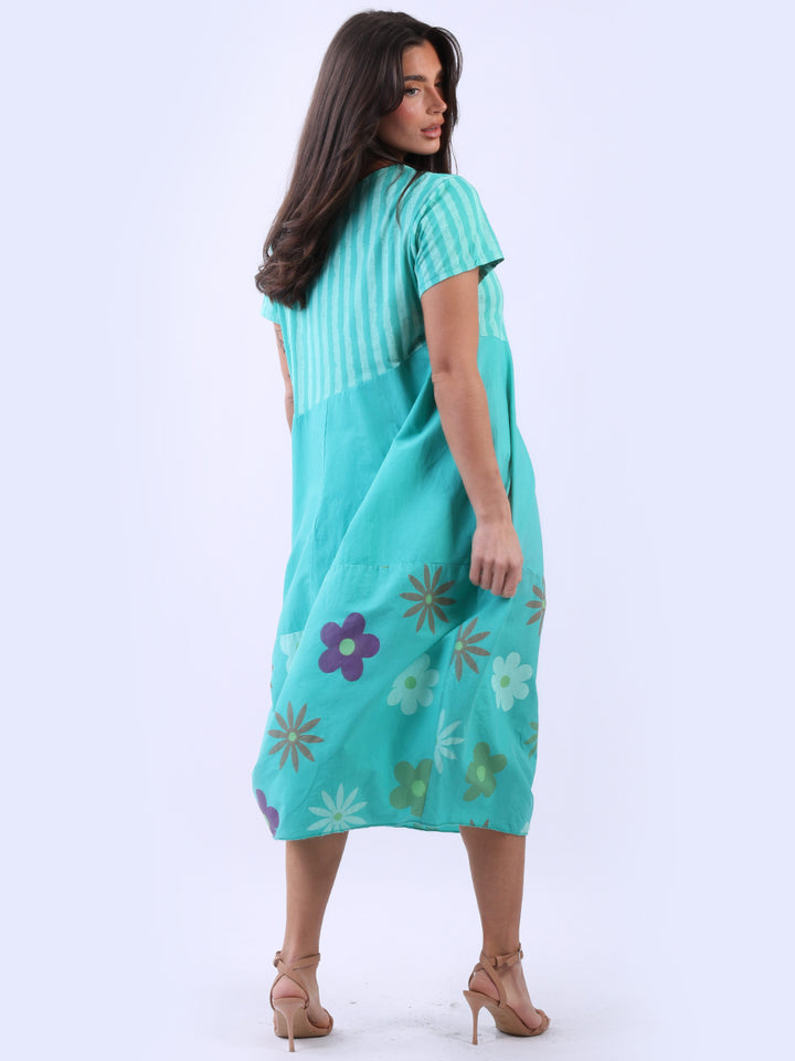Unique and one of a kind this is the ideal with timeless vintage vibes and modish floral and stripe print combo. Made in Italy with finest and high demand top quality cotton the dress has fine round neckline, baggy lagenlook front pocket with floral print and short sleeves that are ideal for any season. Team it up with capris and medium heels for mature skillful touch of finesse.