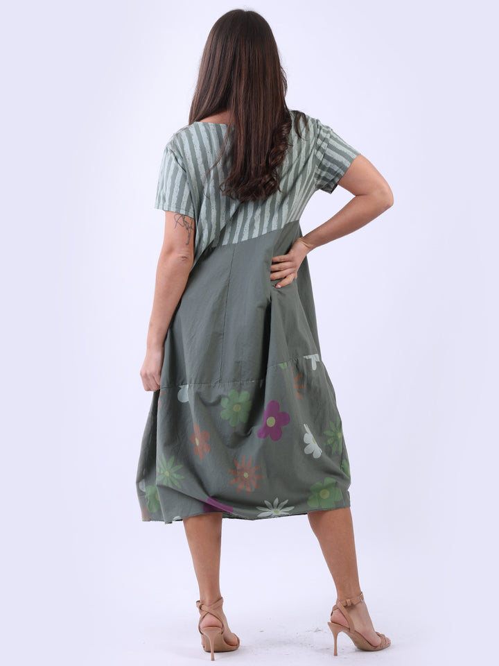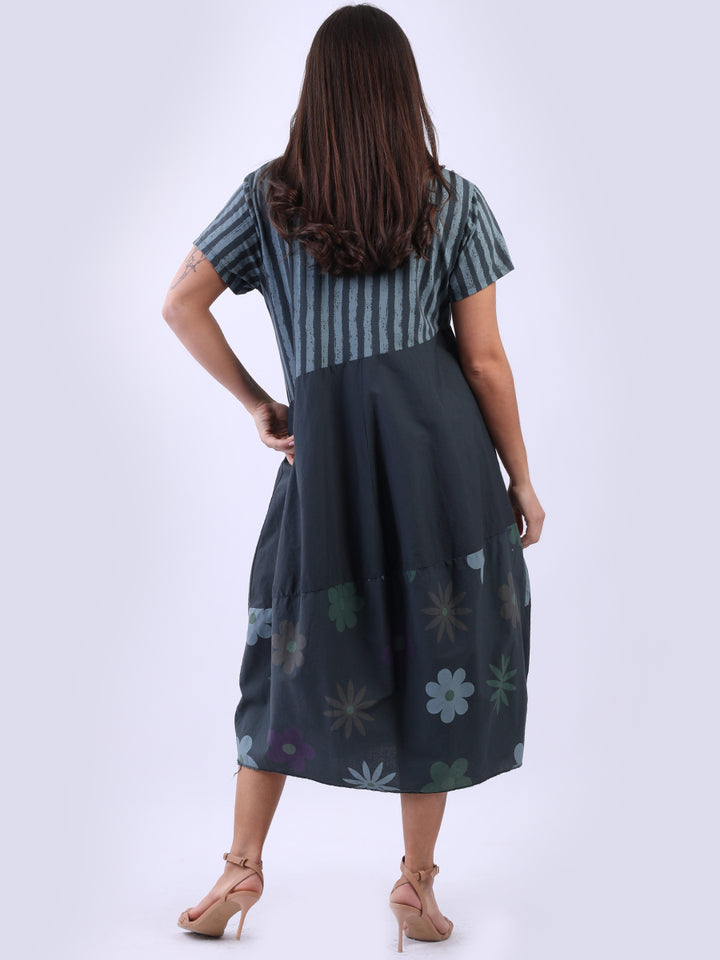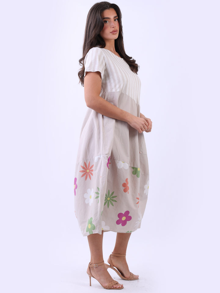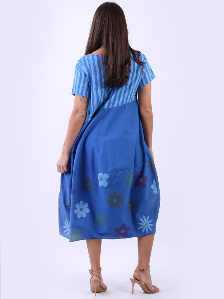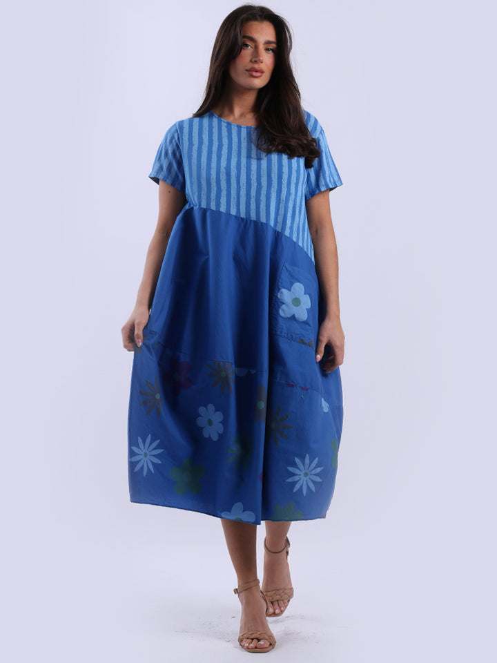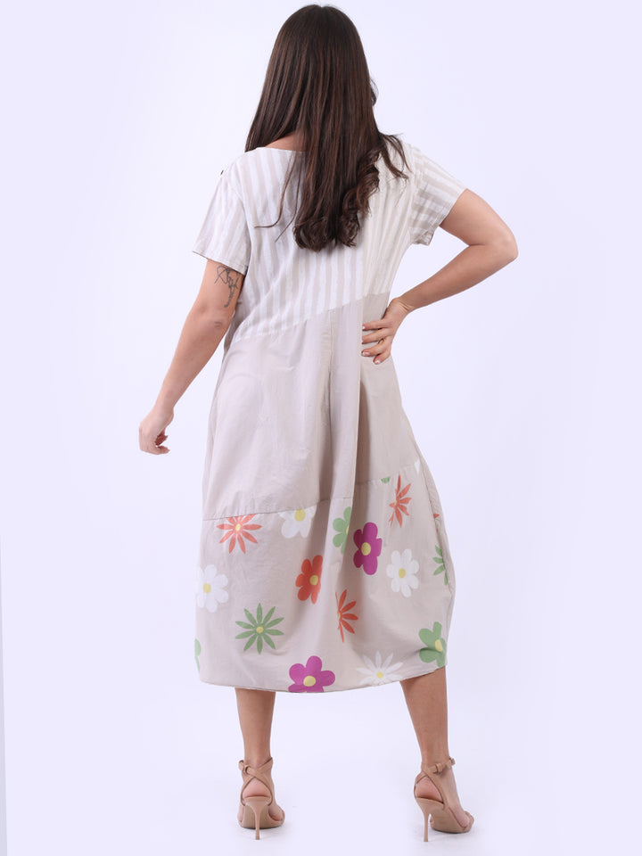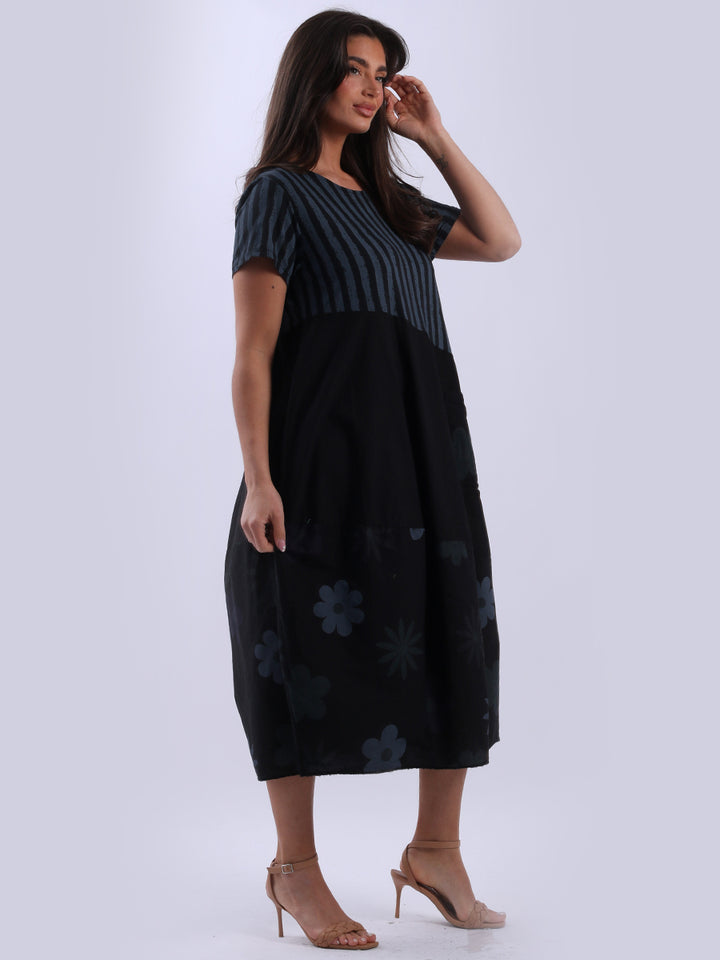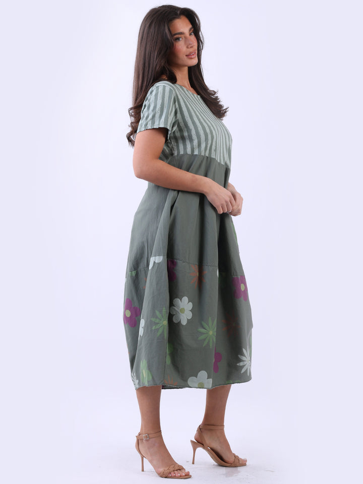 Unique and one of a kind this is the ideal with timeless vintage vibes and modish floral and stripe print combo. Made in Italy with finest and high demand top quality cotton the dress has fine round neckline, baggy lagenlook front pocket with floral print and short sleeves that are ideal for any season. Team it up with capris and medium heels for mature skillful touch of finesse.