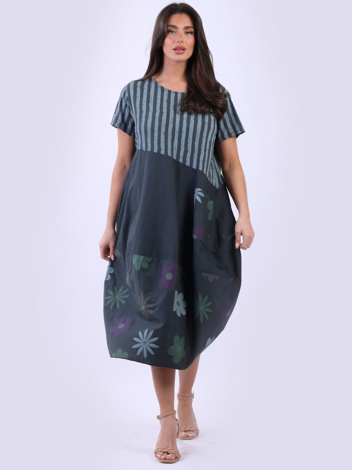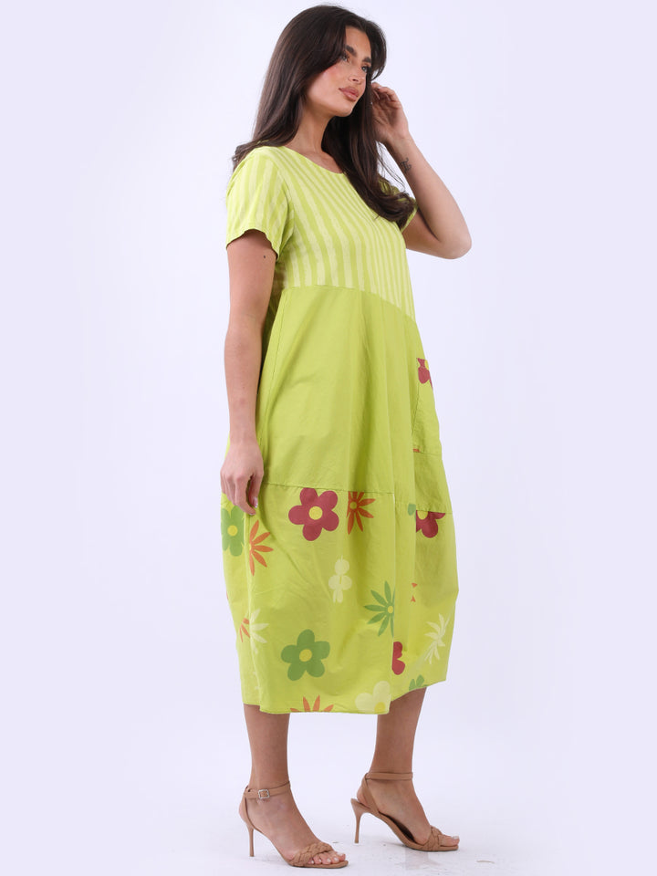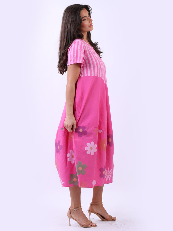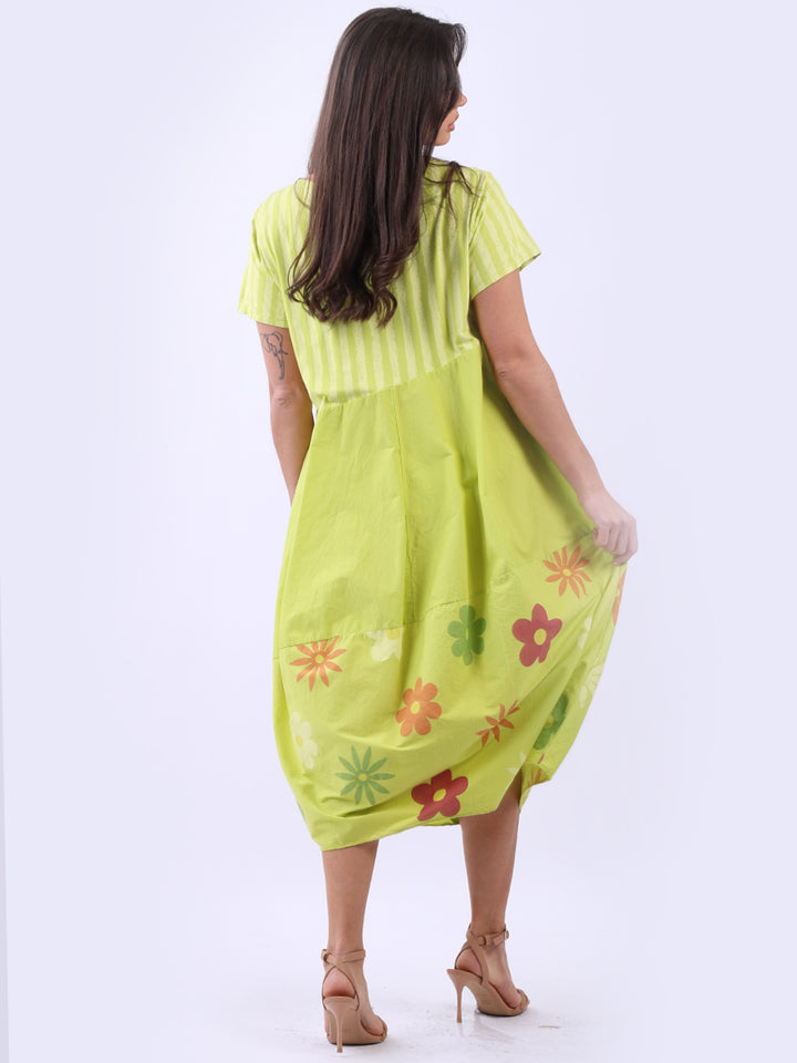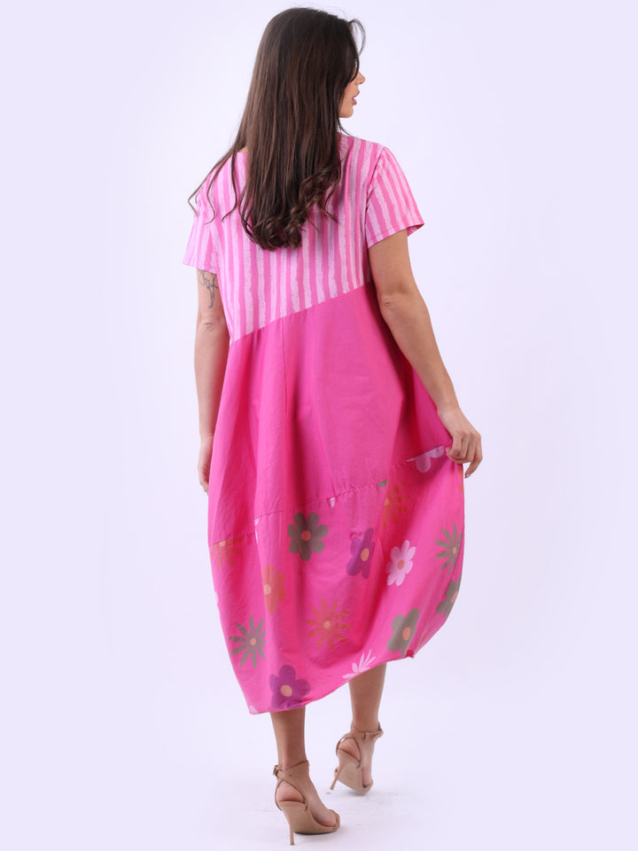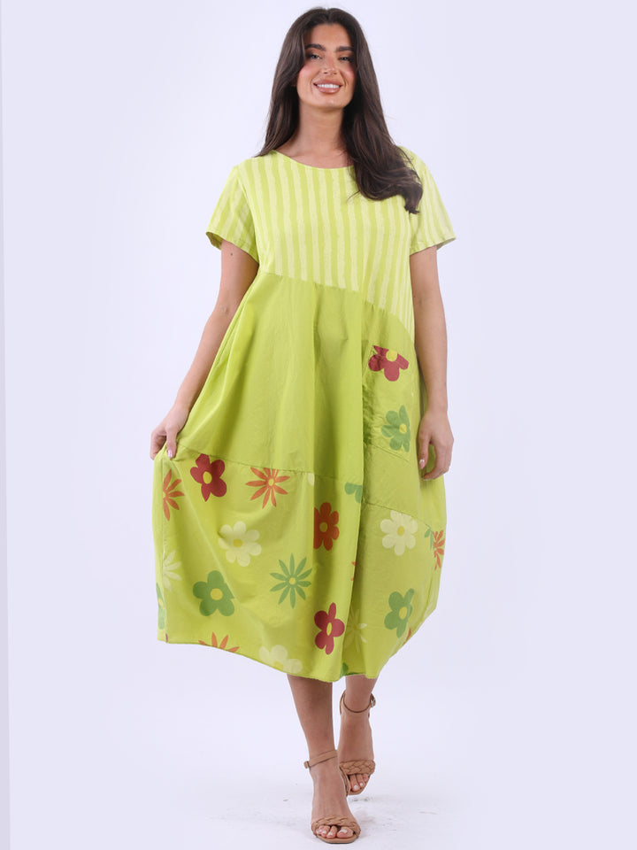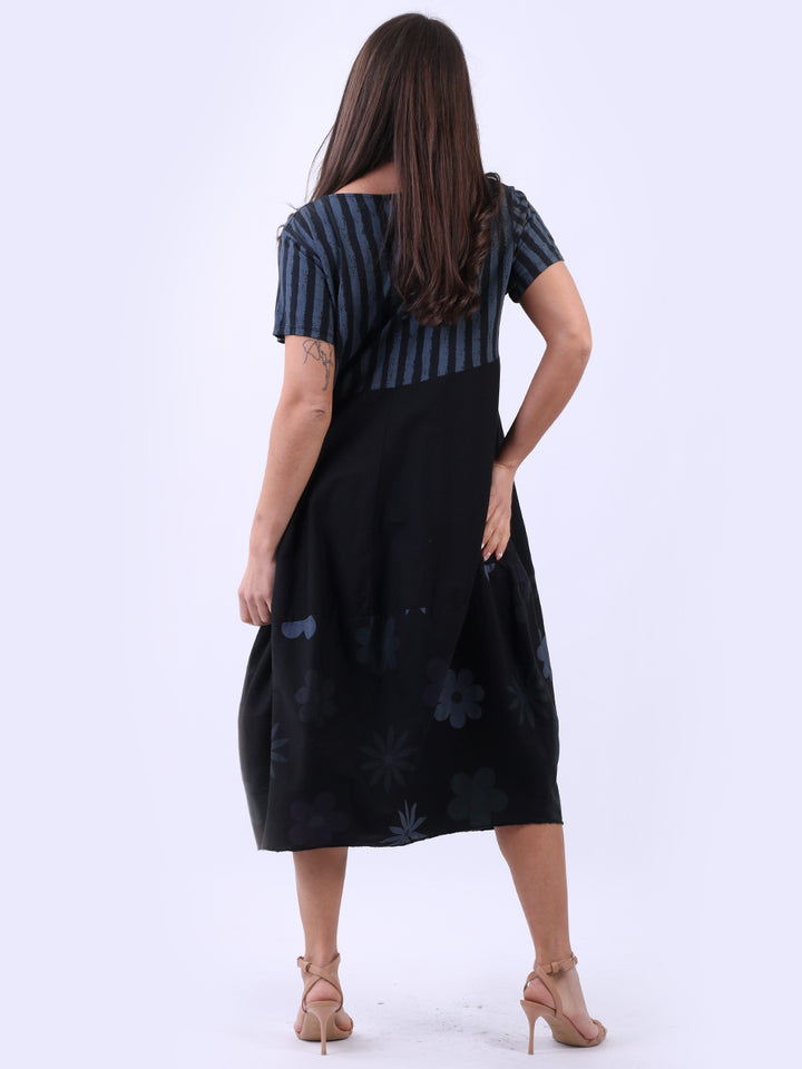 Unique and one of a kind this is the ideal with timeless vintage vibes and modish floral and stripe print combo. Made in Italy with finest and high demand top quality cotton the dress has fine round neckline, baggy lagenlook front pocket with floral print and short sleeves that are ideal for any season. Team it up with capris and medium heels for mature skillful touch of finesse.