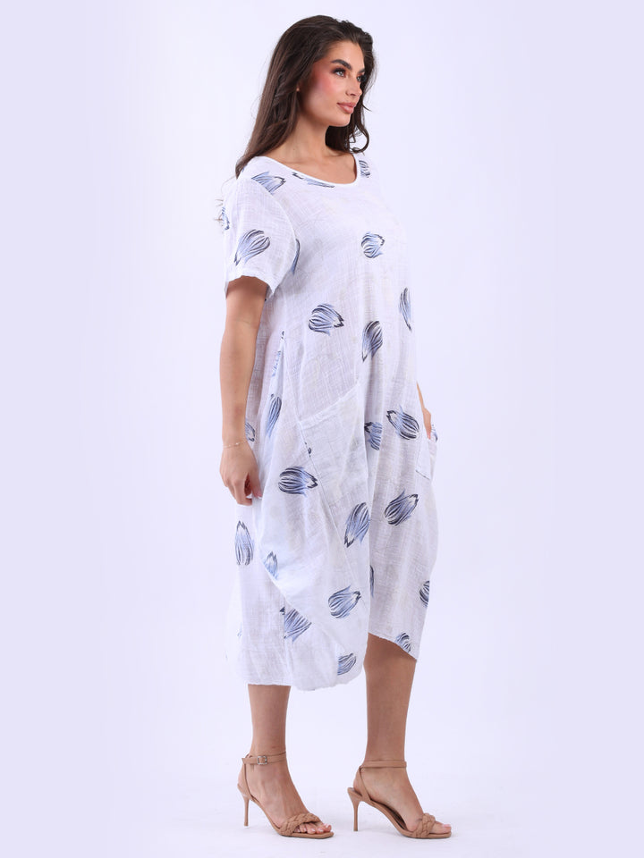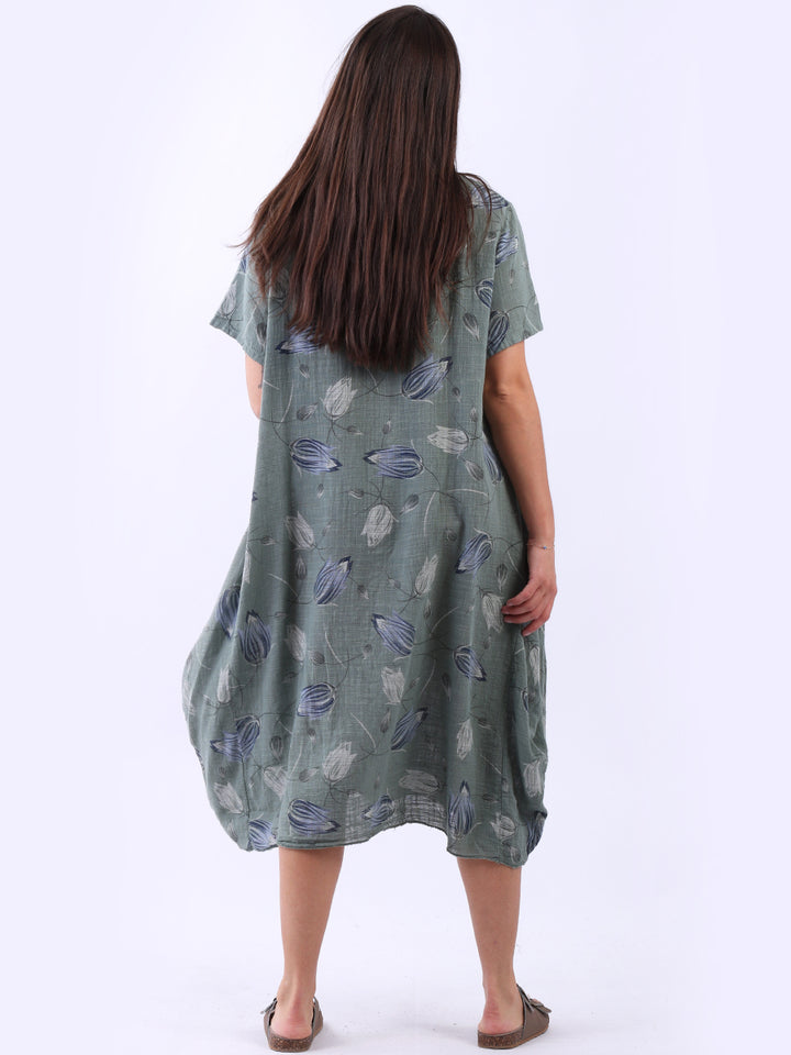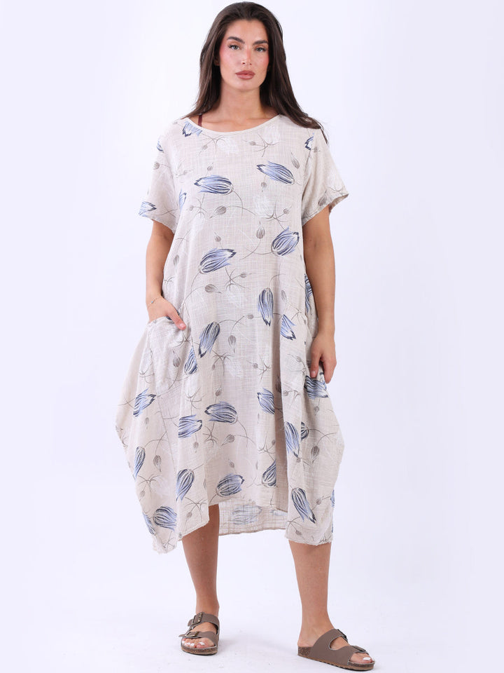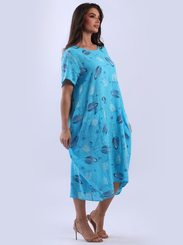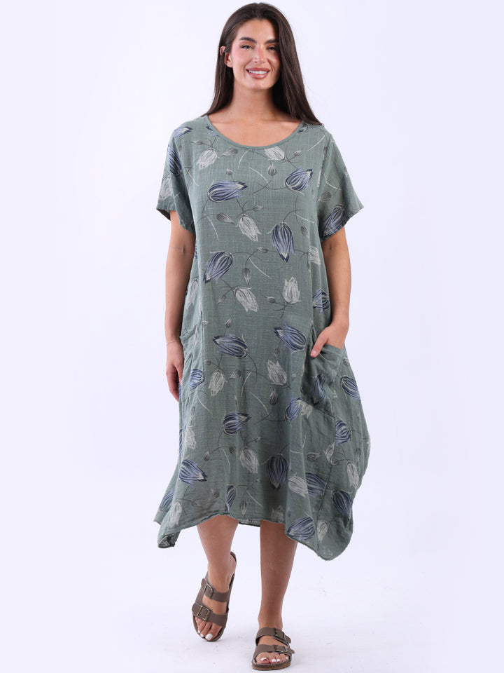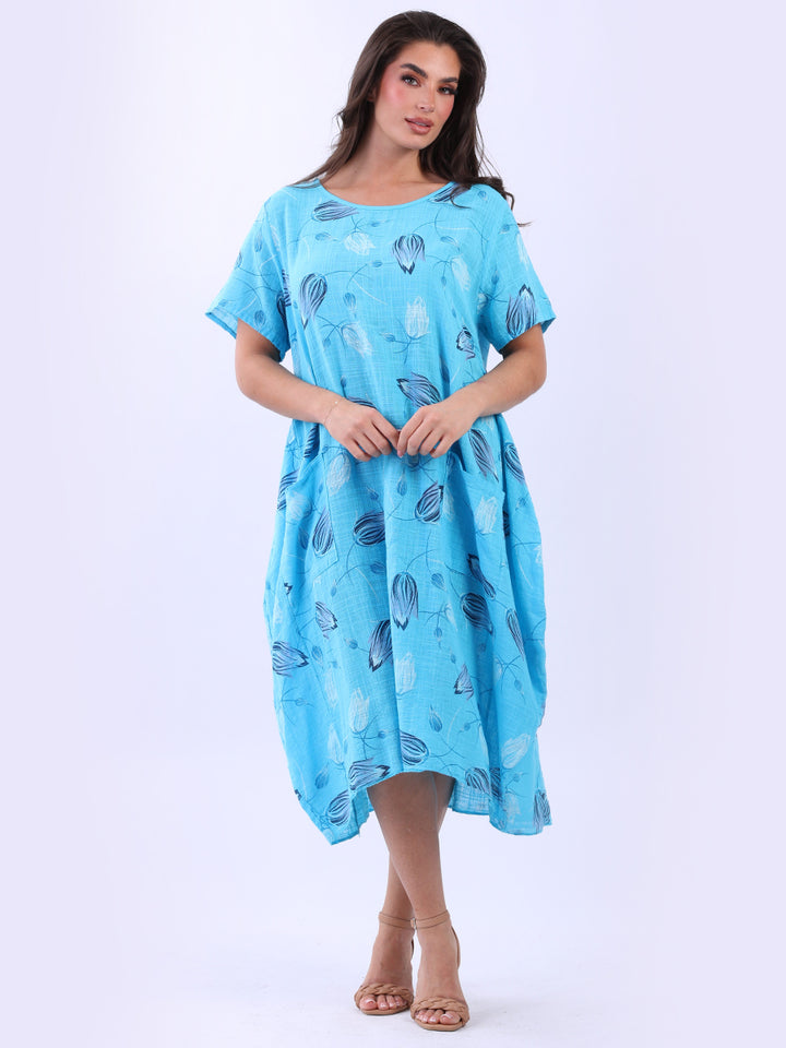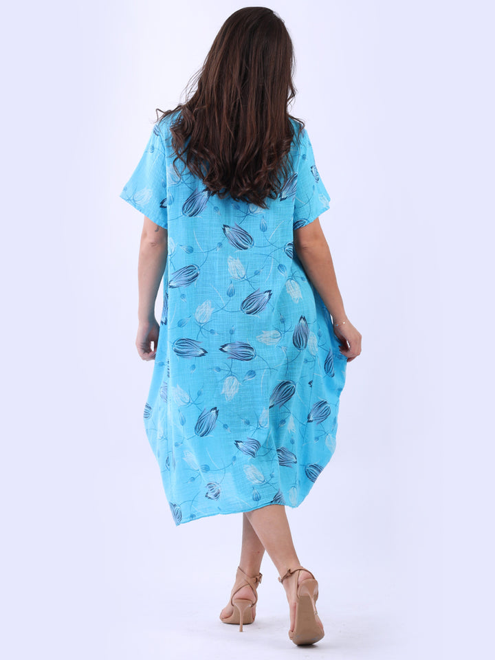 Step into summer with style! Redwholesale is proudly presenting this elegant dress with an eye-catching tulip print. Its soft cotton fabric, short sleeves, front pockets, and round neckline exude a timeless grace while ensuring a breezy, light feel. A true example of Italian fashion, this lagenlook midi dress is perfect for a brunch or casual day out.