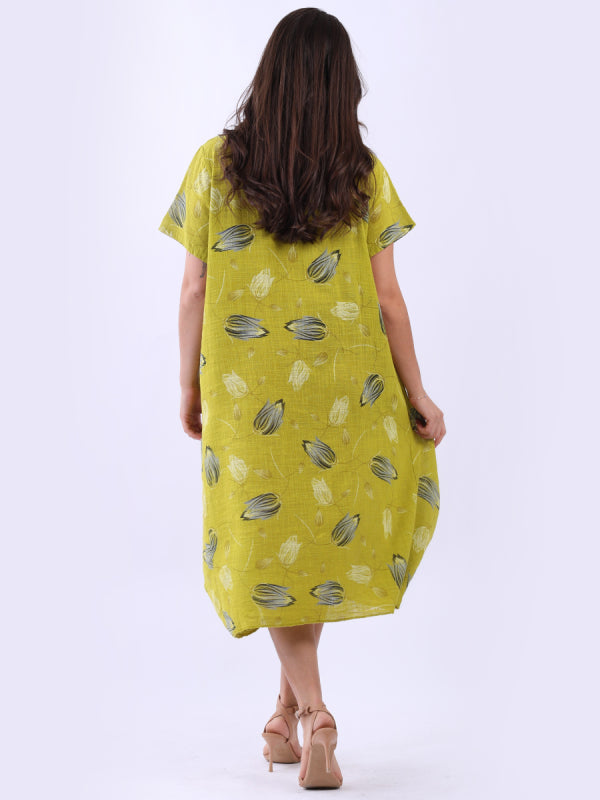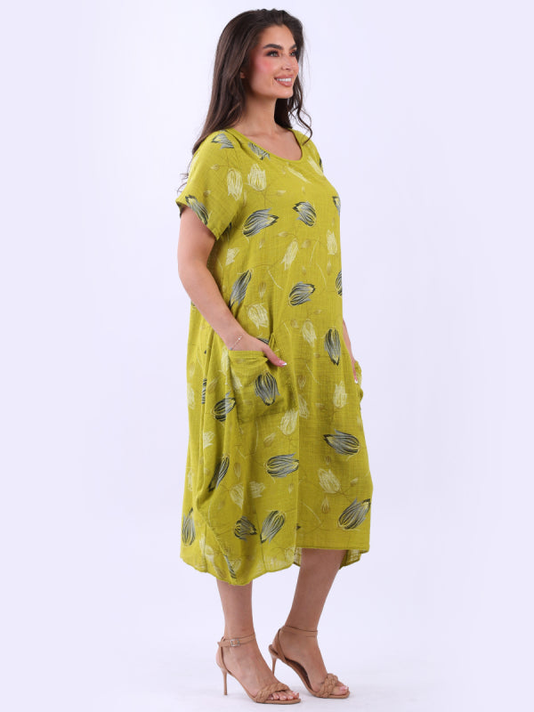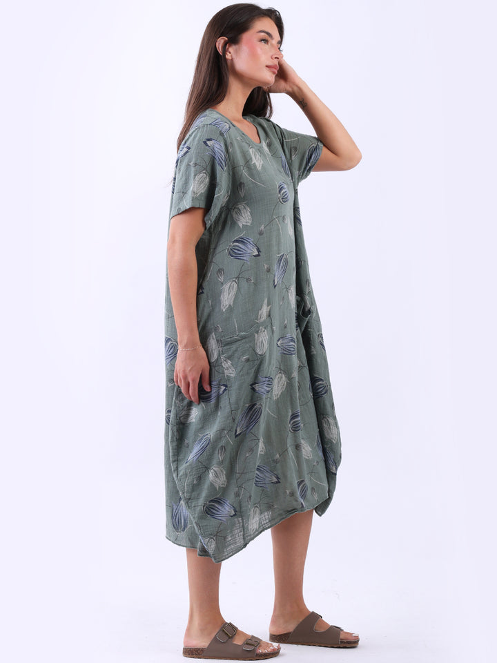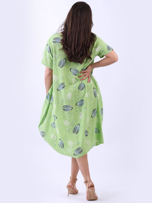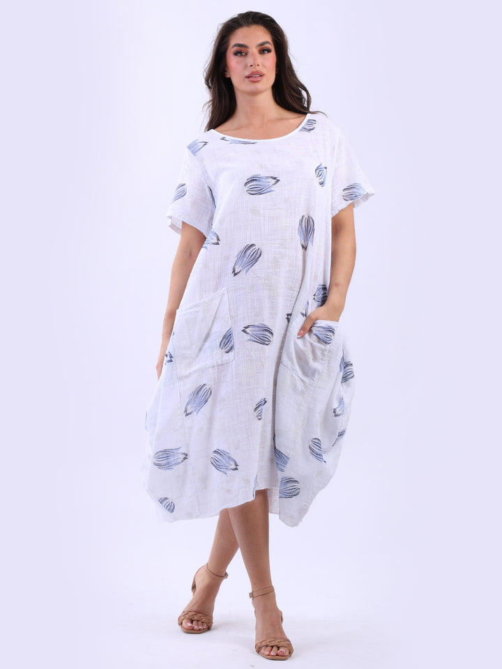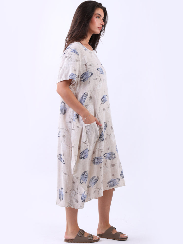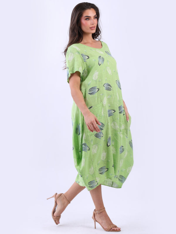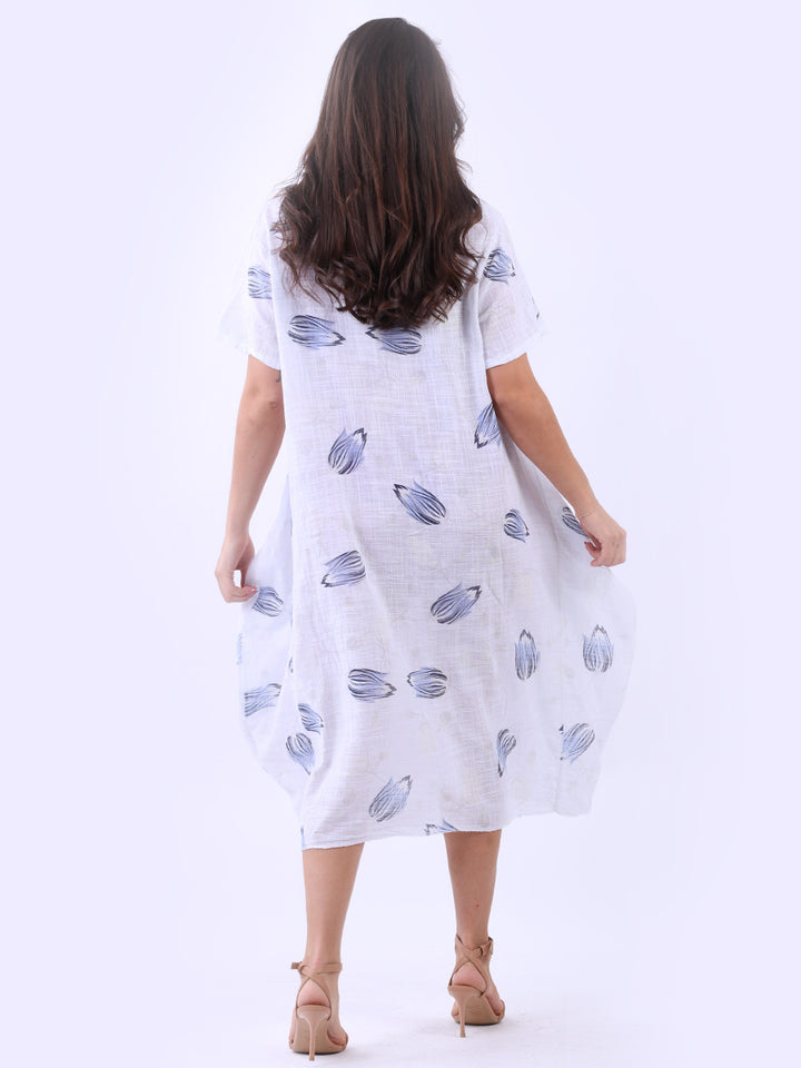 Step into summer with style! Redwholesale is proudly presenting this elegant dress with an eye-catching tulip print. Its soft cotton fabric, short sleeves, front pockets, and round neckline exude a timeless grace while ensuring a breezy, light feel. A true example of Italian fashion, this lagenlook midi dress is perfect for a brunch or casual day out.