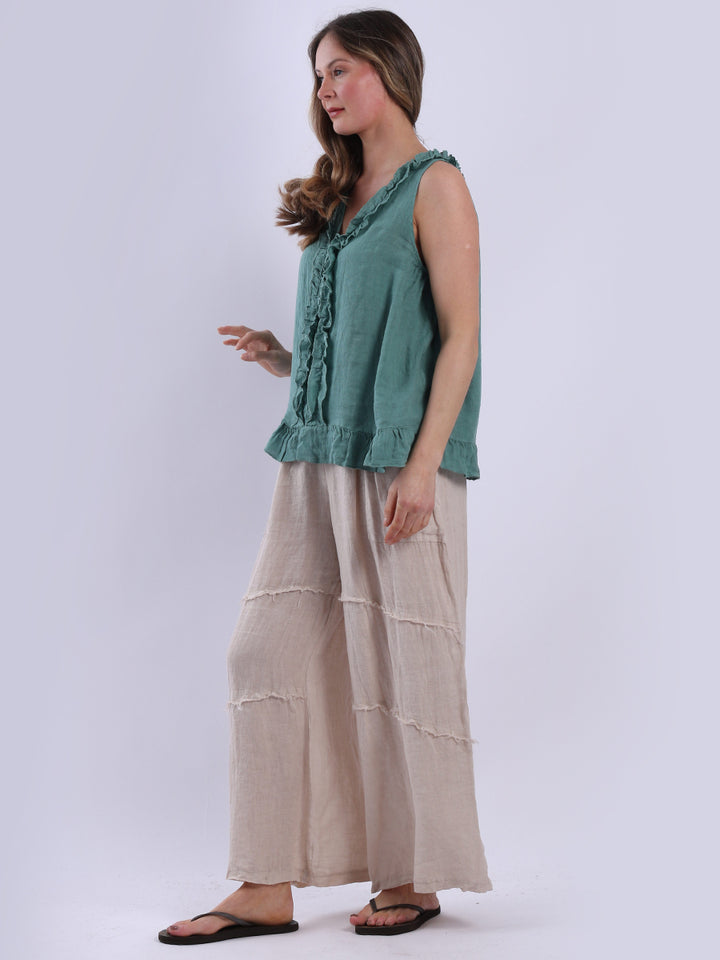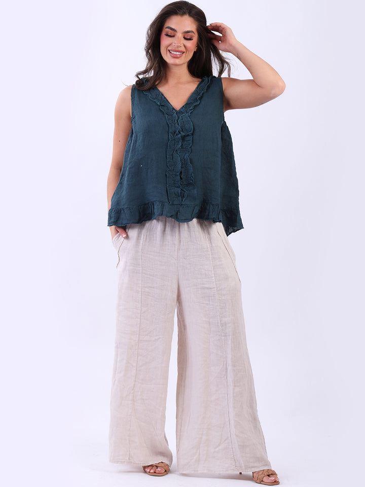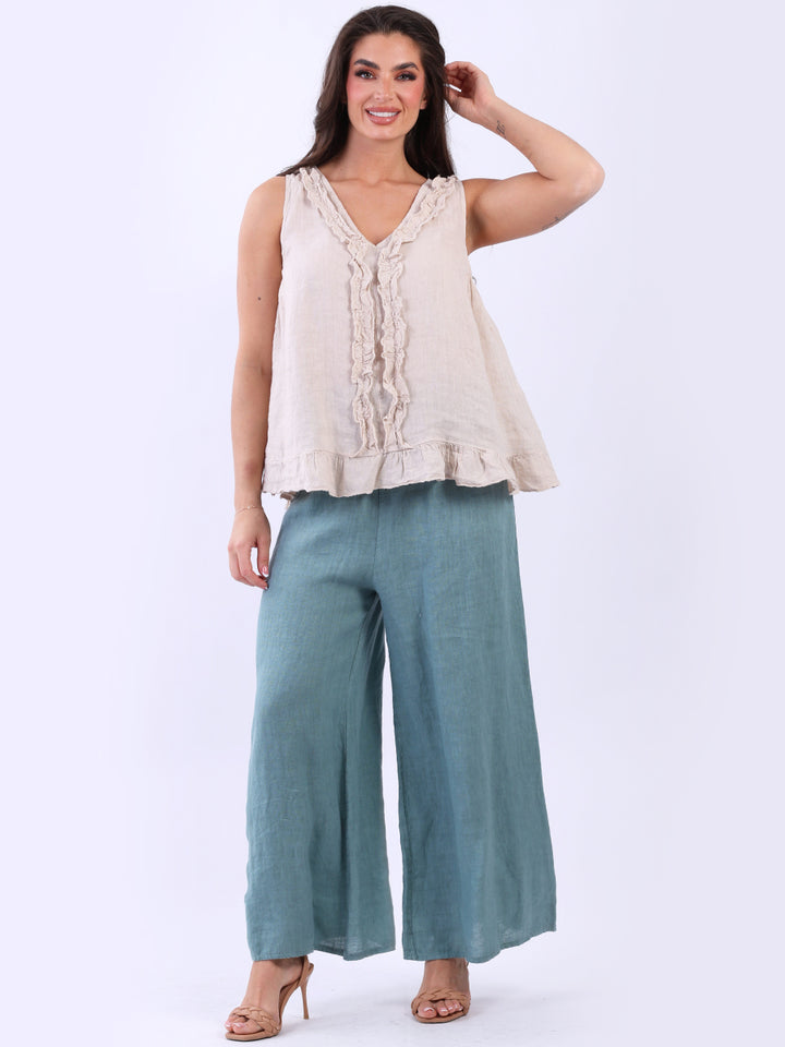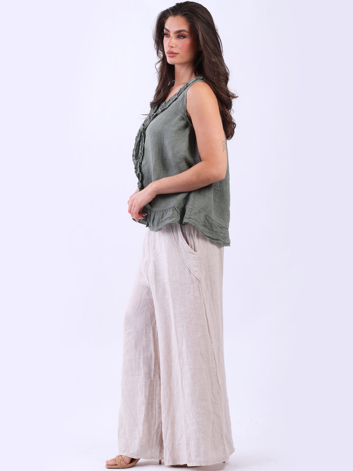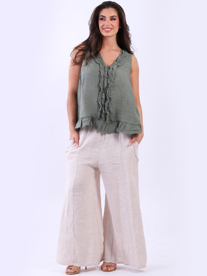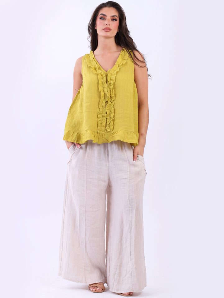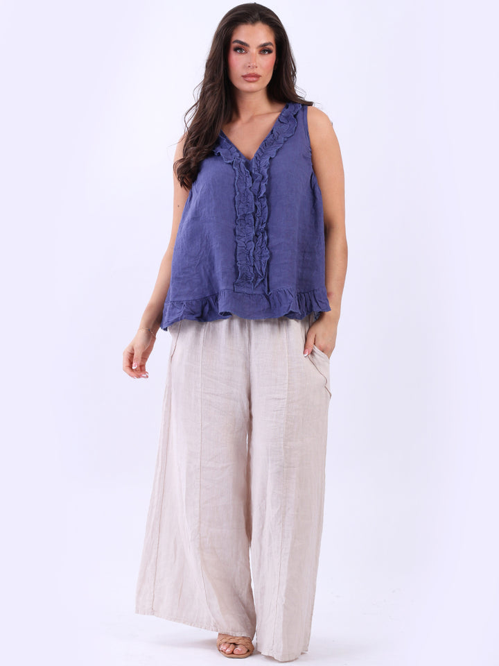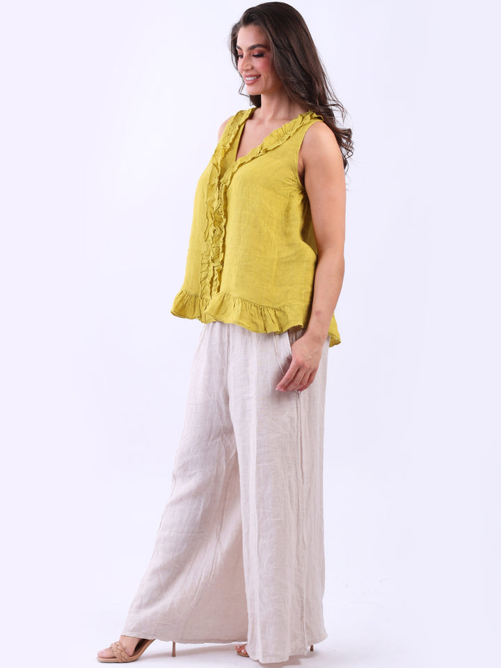 Experience the charm of Italian casual fashion with this tank crop top, crafted from soft linen fabric. Featuring a V-neckline adorned with ruffled trim around it, continuing down the front boasts femininity and elegance. The loose fit makes it comfortable and flowy, creating cool aesthetics for a warm summer. Pair it with plain pants to make a stylish look.