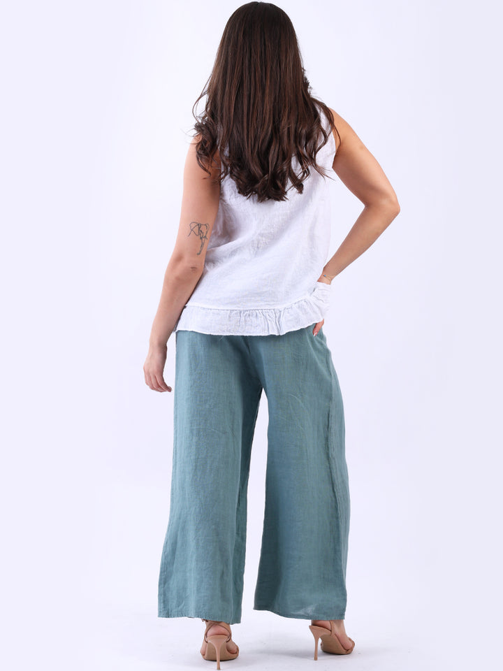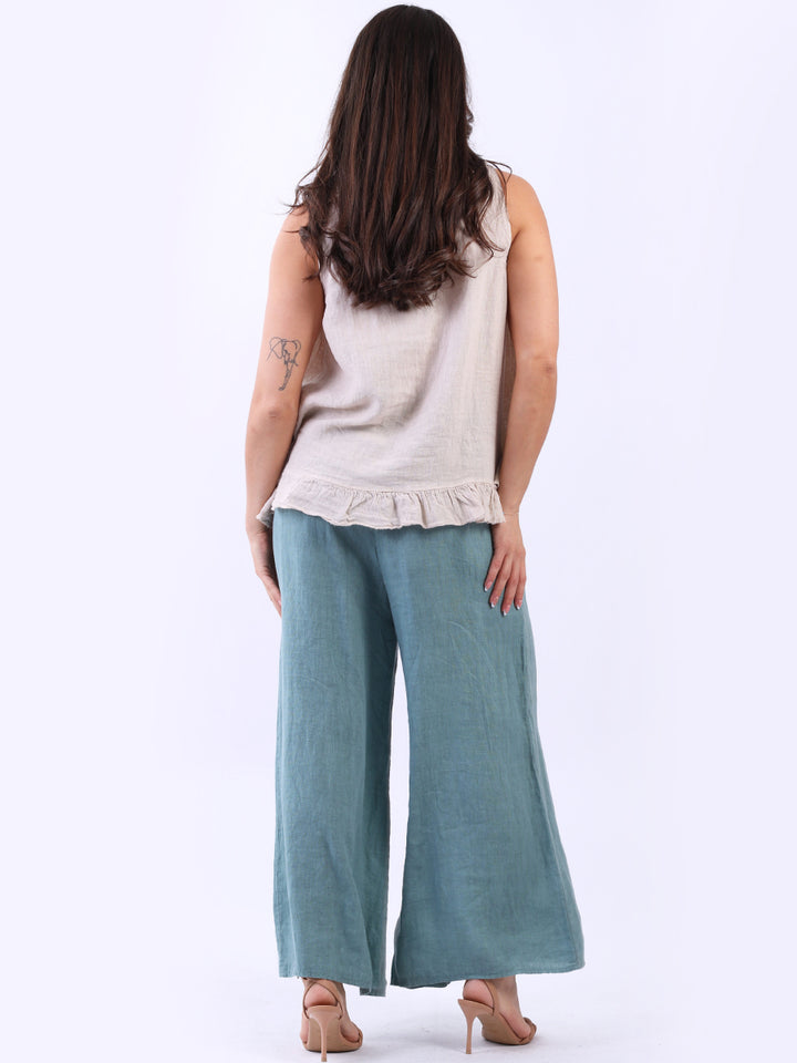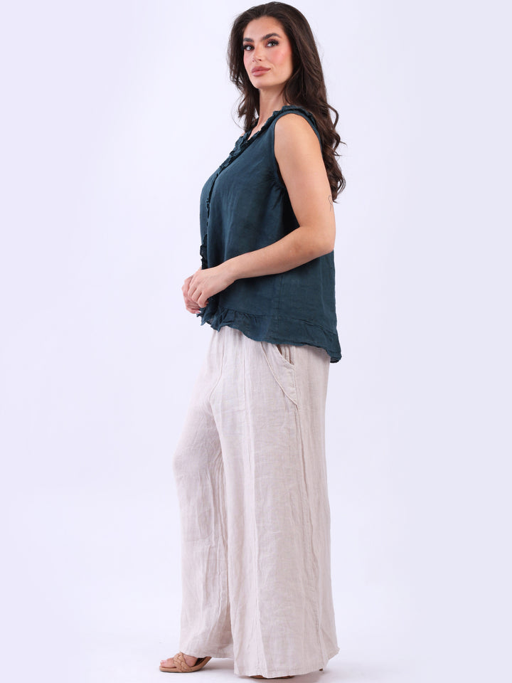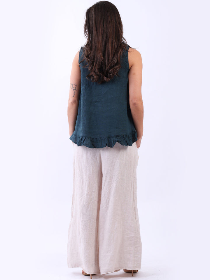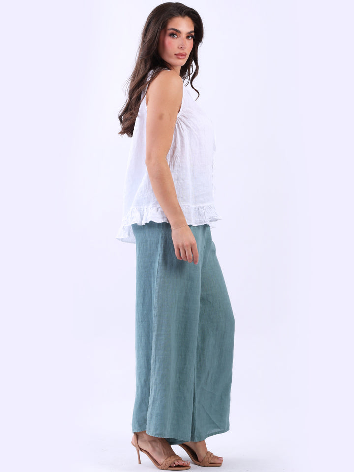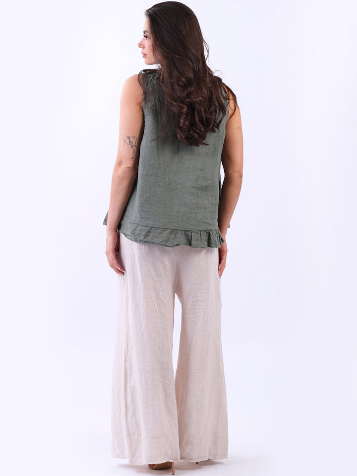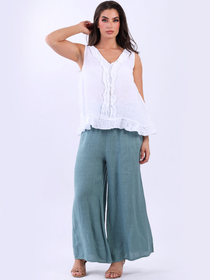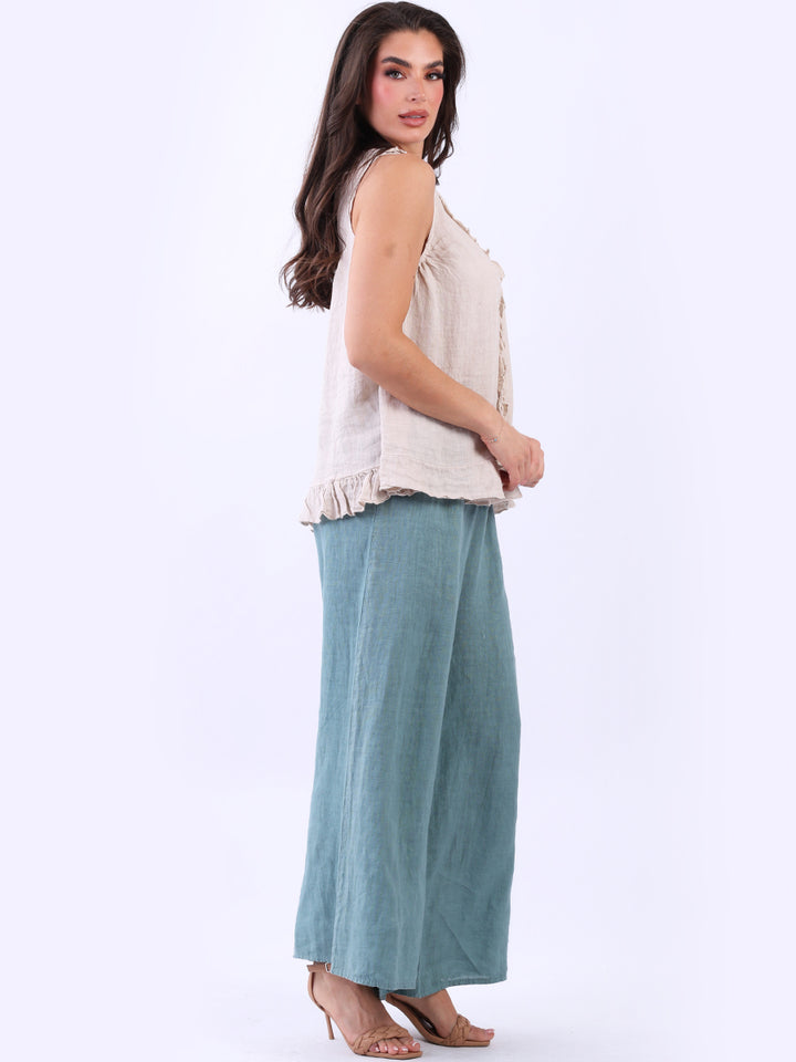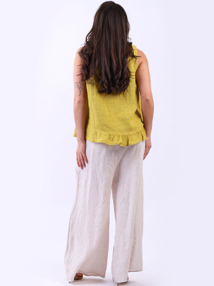 Experience the charm of Italian casual fashion with this tank crop top, crafted from soft linen fabric. Featuring a V-neckline adorned with ruffled trim around it, continuing down the front boasts femininity and elegance. The loose fit makes it comfortable and flowy, creating cool aesthetics for a warm summer. Pair it with plain pants to make a stylish look.