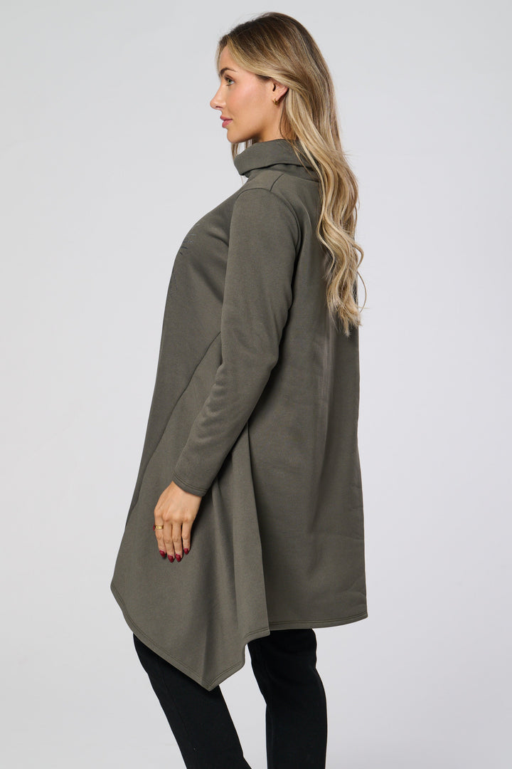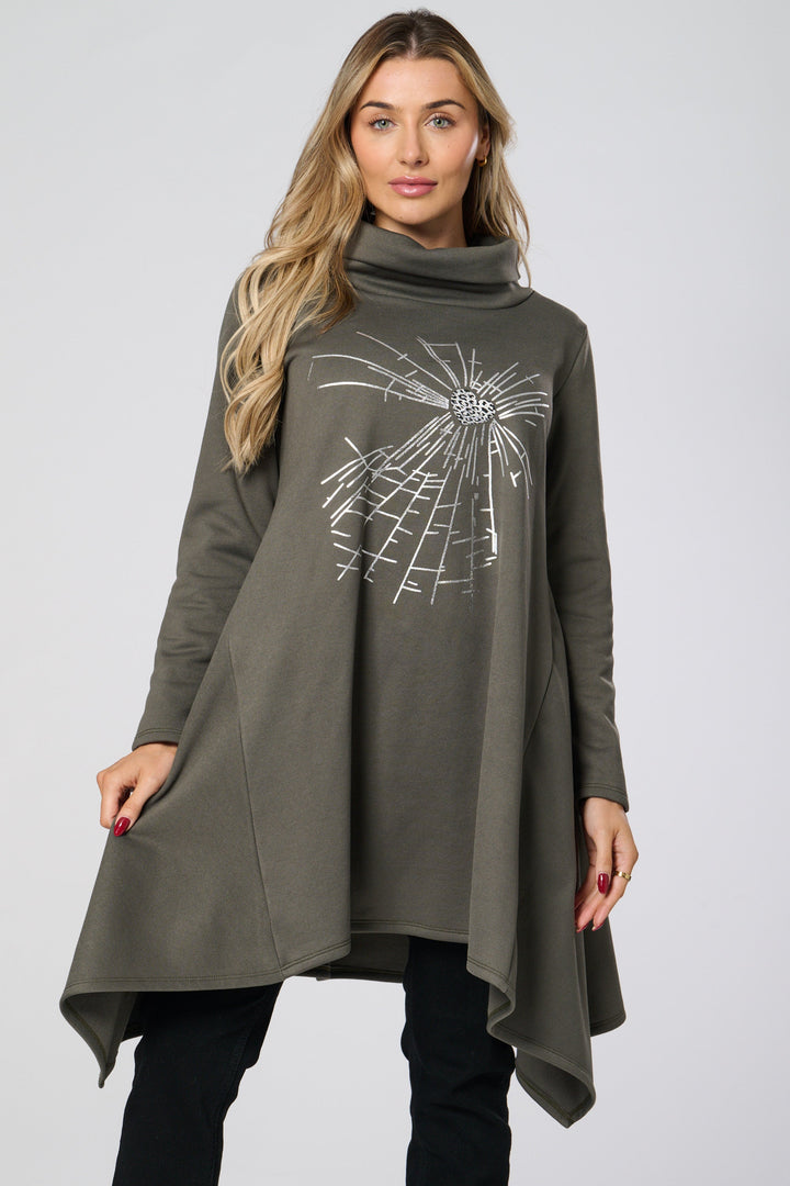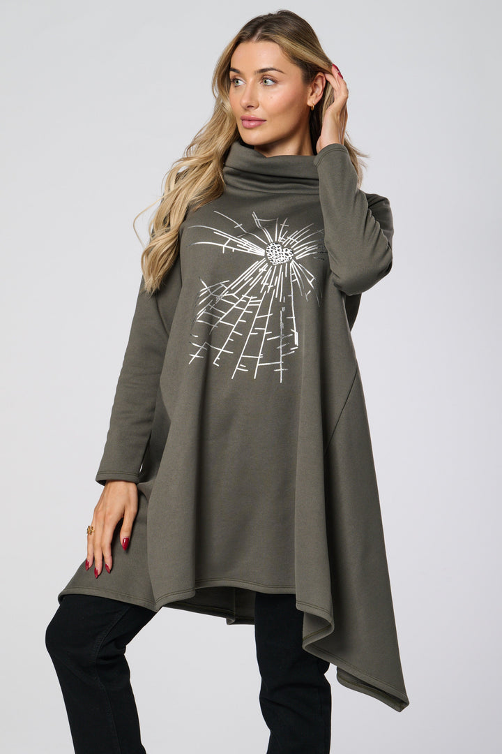 Cowl neck tunic top featuring silver embellished detail, full length sleeves and elliptical hemline.