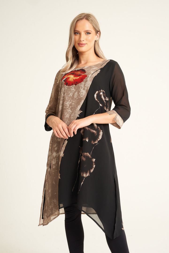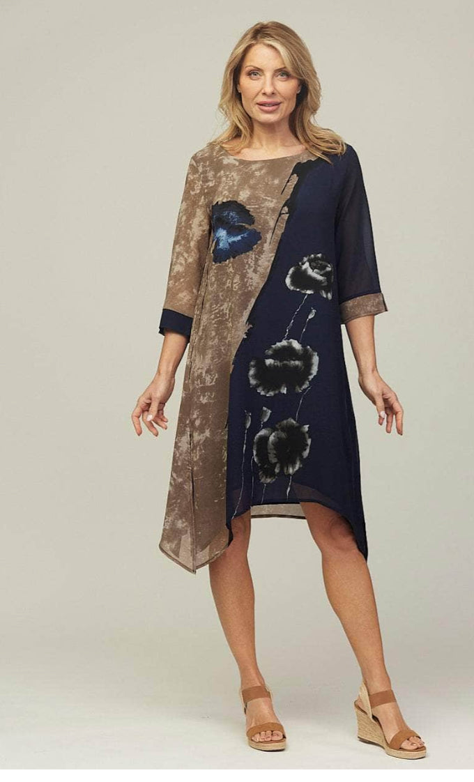 Diagonal floral print dress with side slit design and three quarter sleeves featuring striking contrasting cuff detail.
