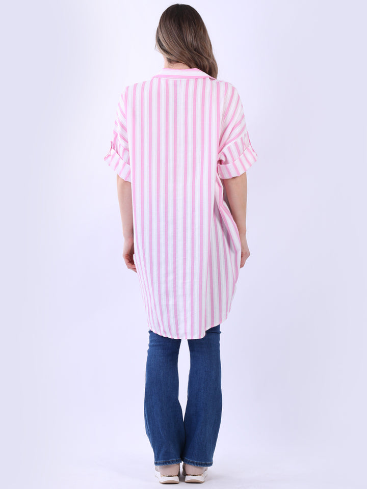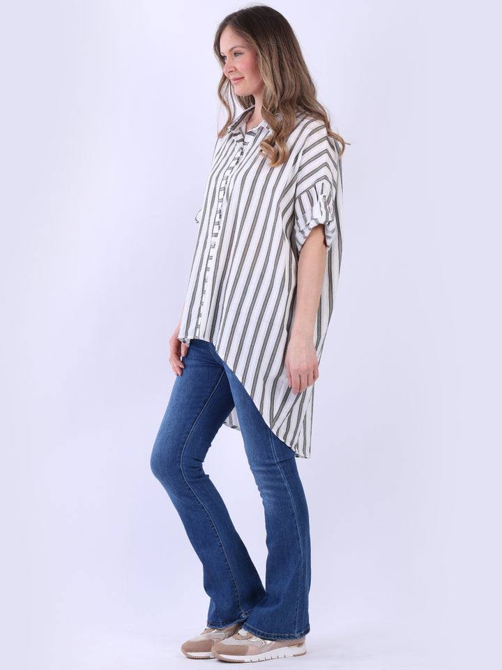 An ageless formal classic with simple beauty. On a sunny summer day, this Italian cotton shirt feels like a cool breeze. The neat stripes and dipped hem add to its charm. Designed for hectic days, it is lightweight, breathable, and oversized. A perfect piece to bring a laid-back yet polished touch to any woman's summer wardrobe.