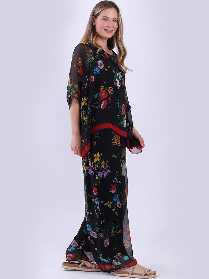 Attractive and charismatic for elegant women wearers, this 2 layered floral silk tunic top is a dream come true. It is made in Italy and features batwing sleeves that create a dramatic effect with its lightweight flowy fabric. Dress it with matching wide-leg trousers for an unforgettable evening look.