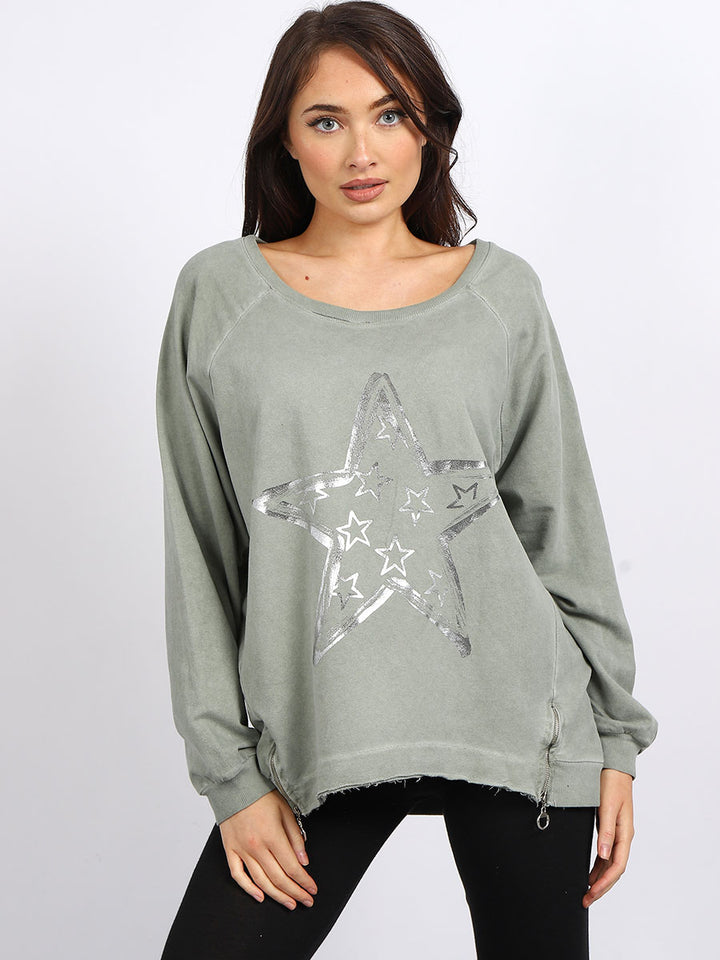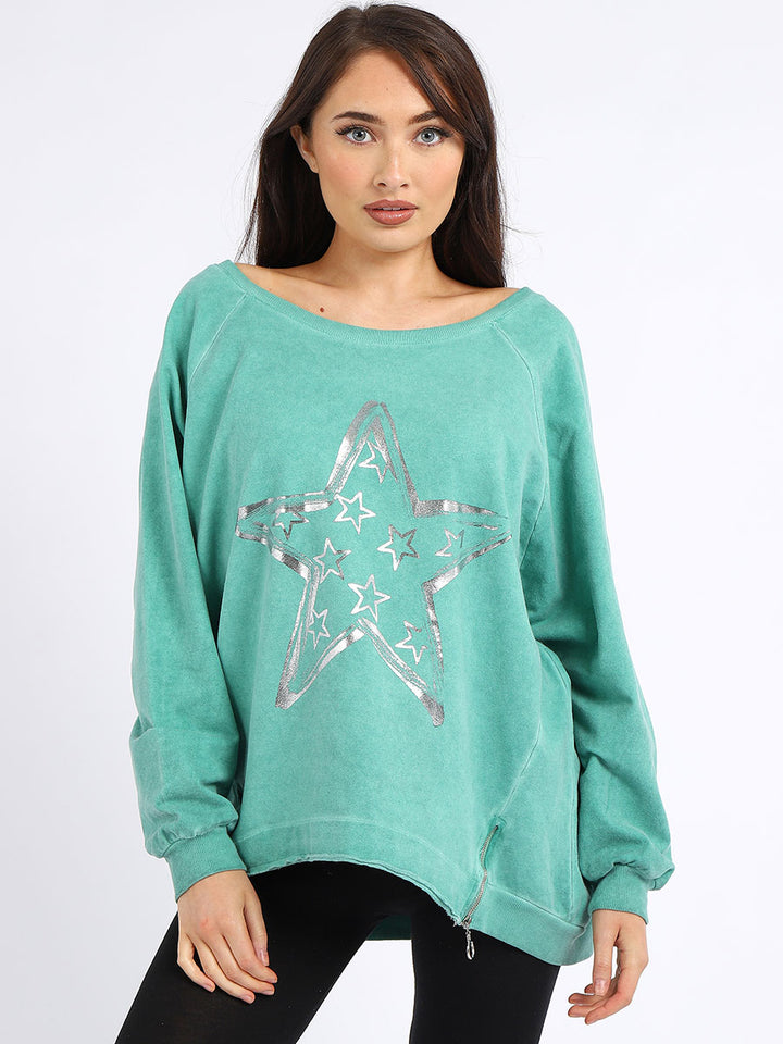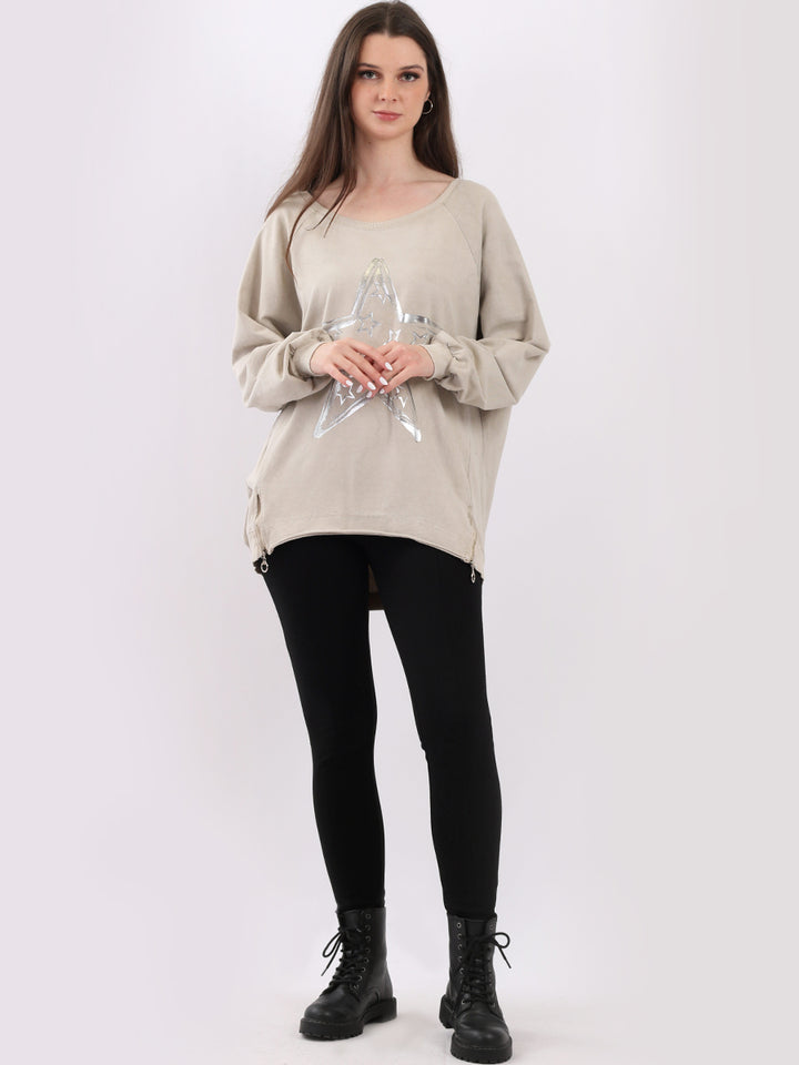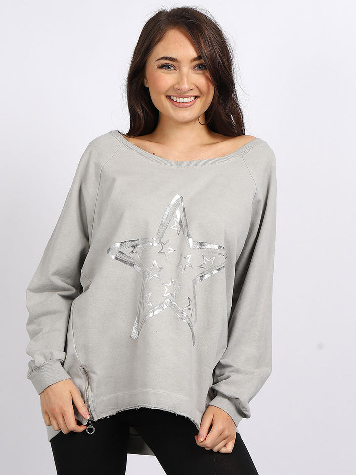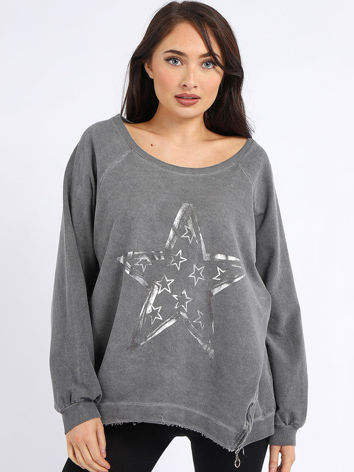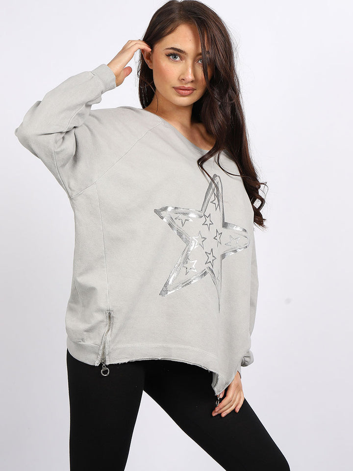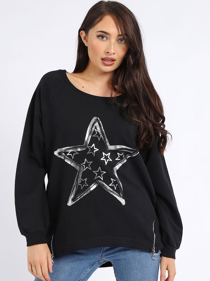 A perfect addition to the women wearer wardrobe for seasonal changes with Italian made quality and Redwholesale’s design. Perfect cut and fit this full sleeves top is made from a soft and stretchy material to fit women wearers perfectly. Wide round neckline, star print on the front and baggy plus size fit makes it a right choice every time.