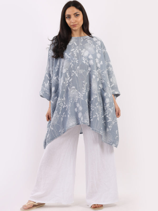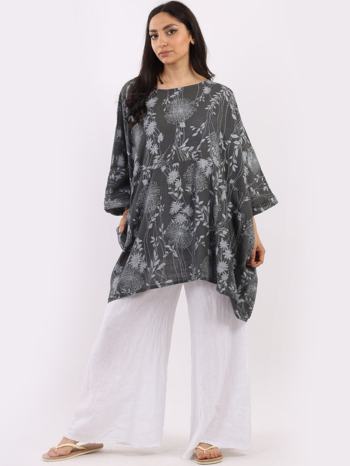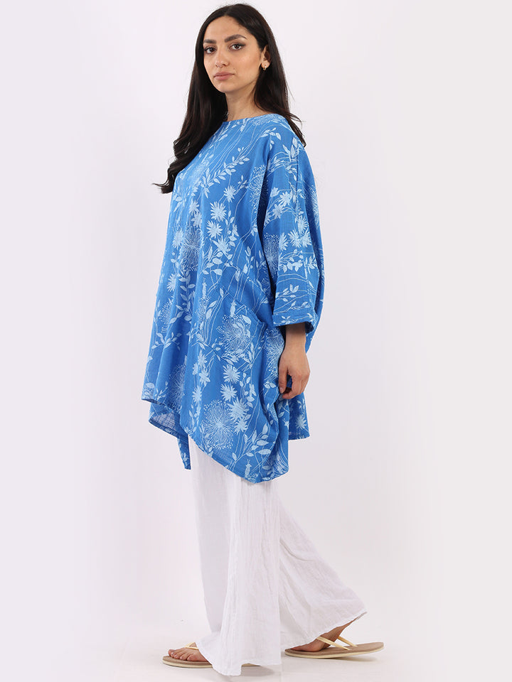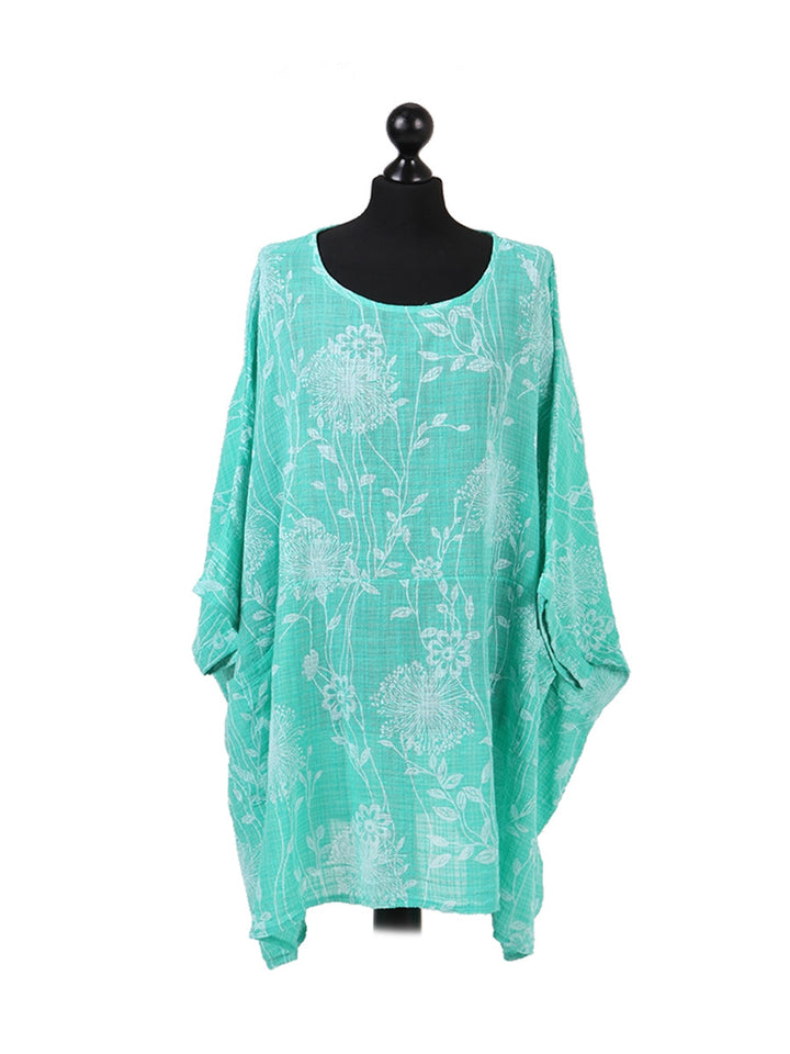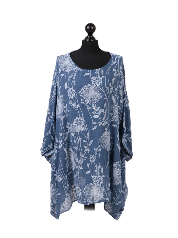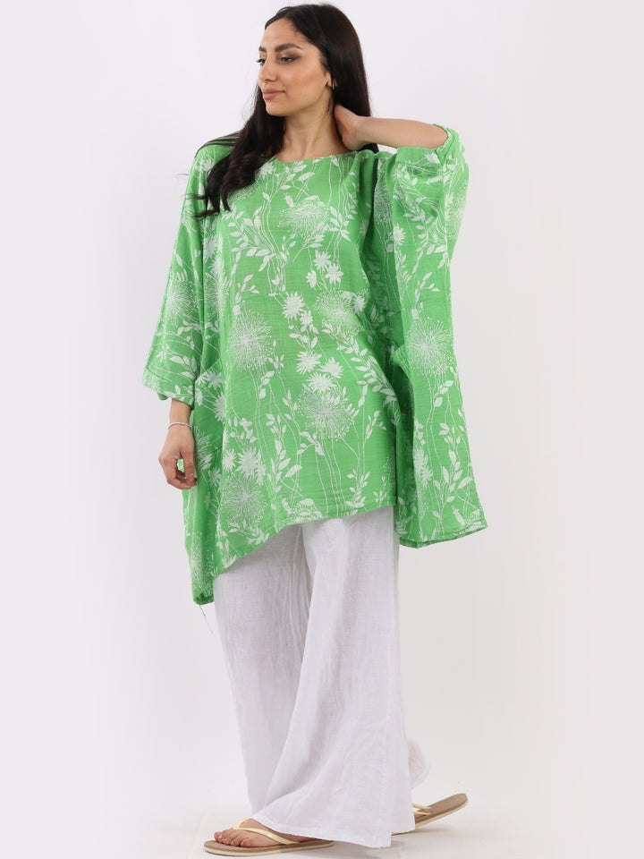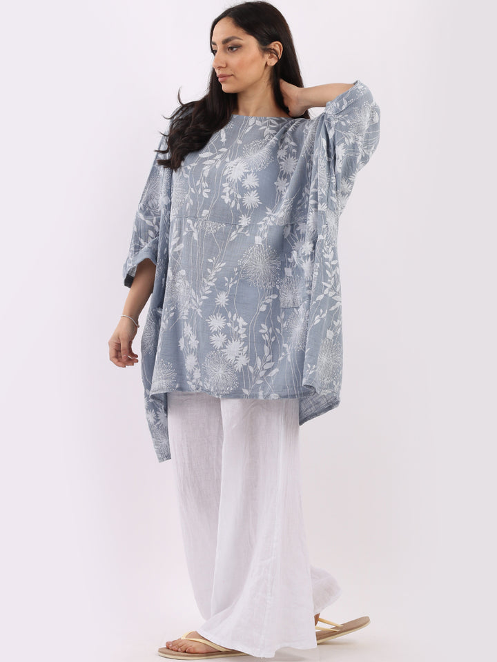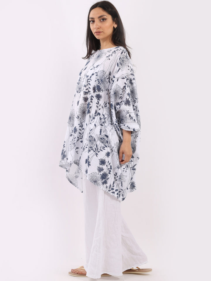 A carefree summer blowing dandelions away is a fantasy that stays young forever! Inspired by childhood fantasies and fun days fashion boutique crafted floral print with vine style tropical leaves in backdrop with oversized dandelions up front. Made in cotton and stitched in Italy the top is batwing style with drappy sides and hem perfect for curvy bodies and seek alike, comfort round neckline and tunic hem makes it unique and adorable. Dress it with white capris and sandals with ankle straps and make a mark of beauty