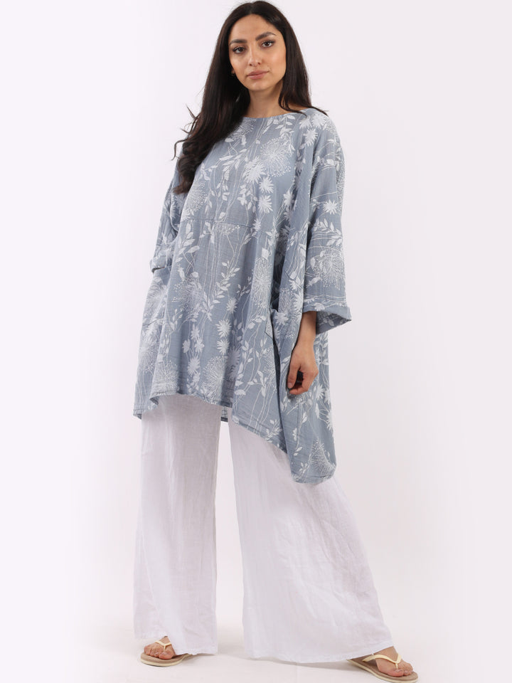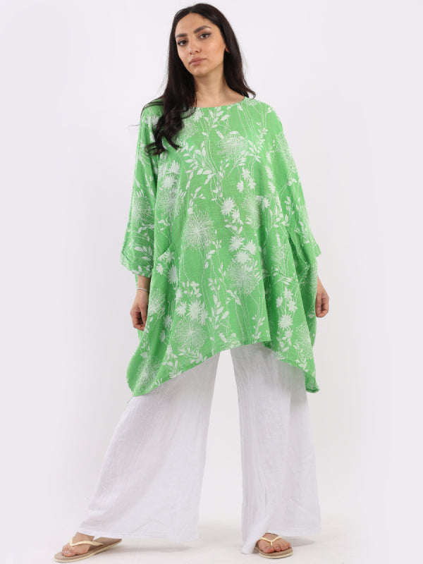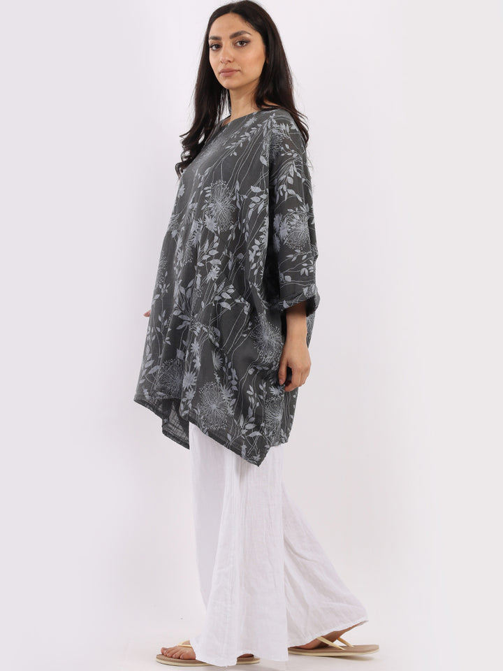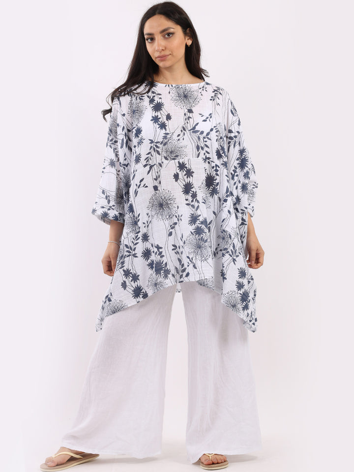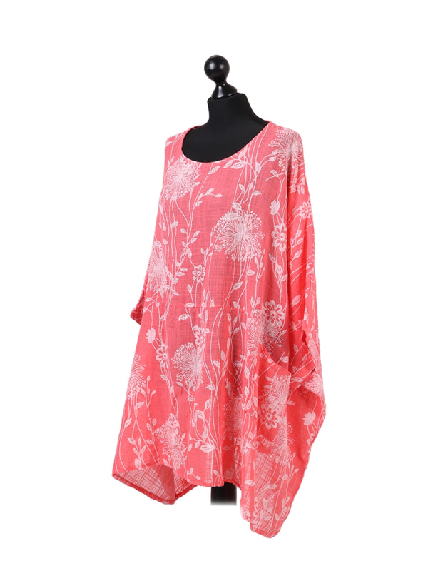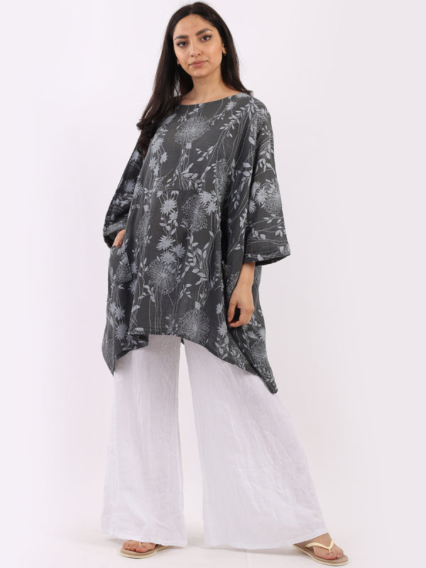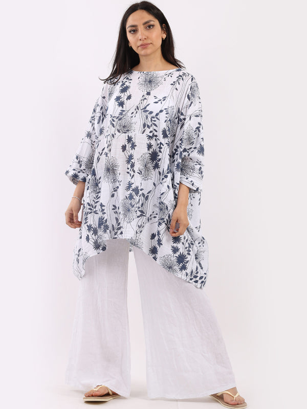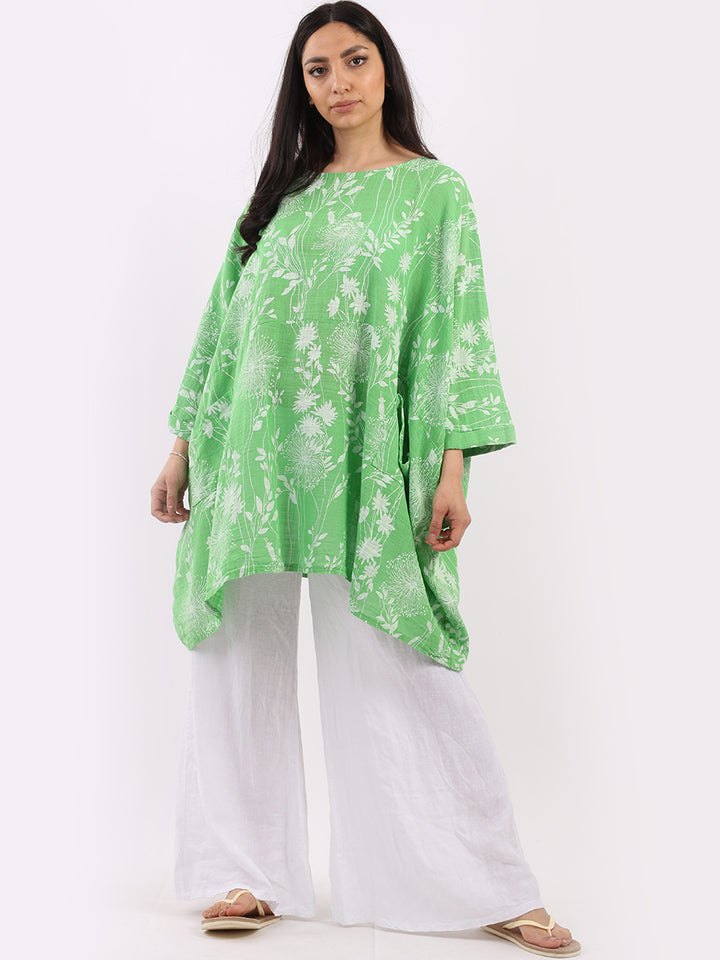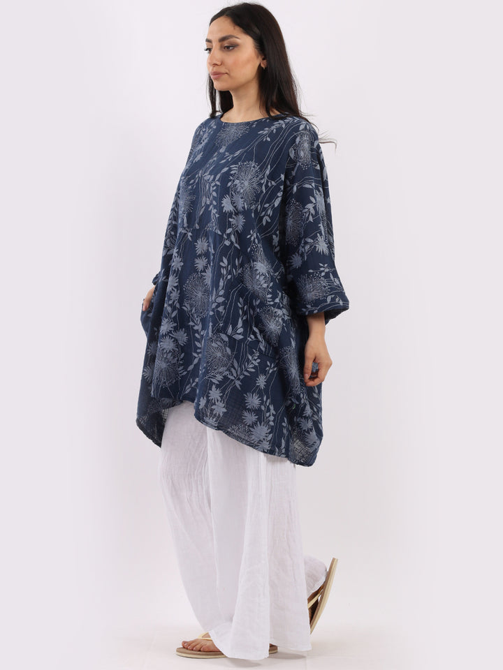 A carefree summer blowing dandelions away is a fantasy that stays young forever! Inspired by childhood fantasies and fun days fashion boutique crafted floral print with vine style tropical leaves in backdrop with oversized dandelions up front. Made in cotton and stitched in Italy the top is batwing style with drappy sides and hem perfect for curvy bodies and seek alike, comfort round neckline and tunic hem makes it unique and adorable. Dress it with white capris and sandals with ankle straps and make a mark of beauty