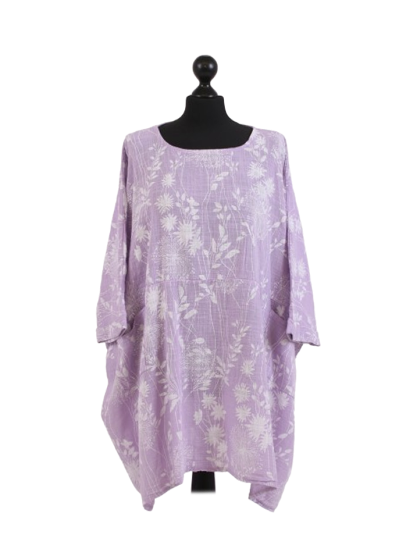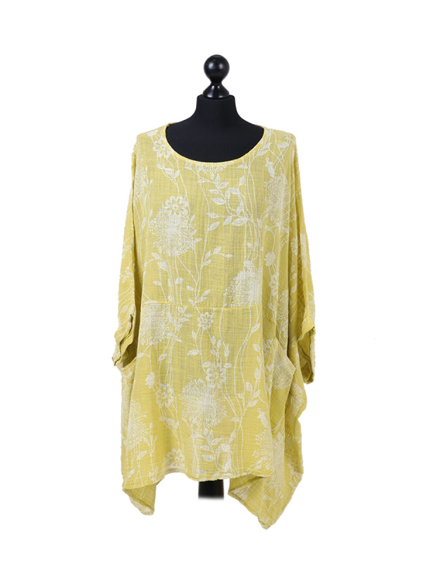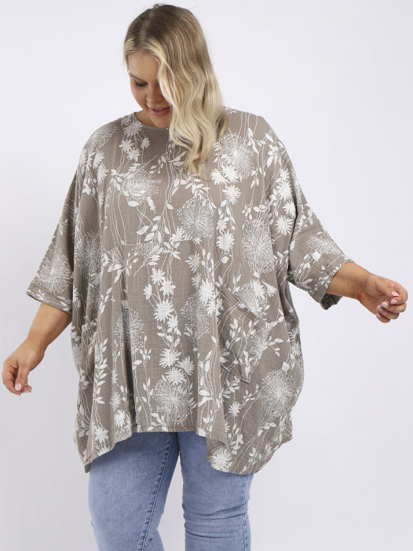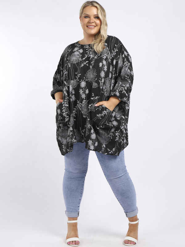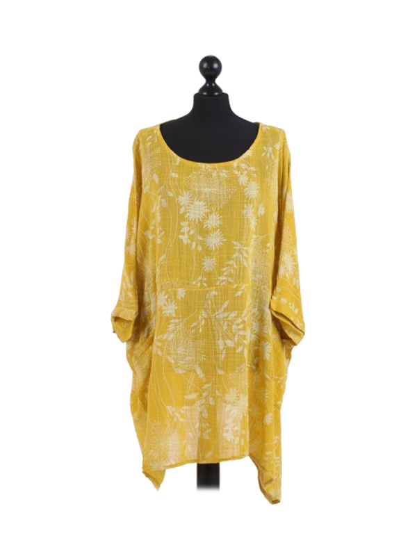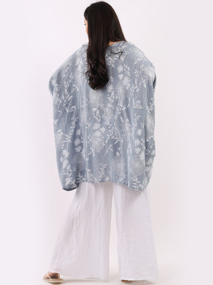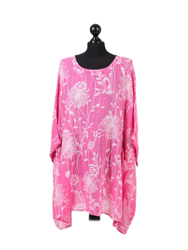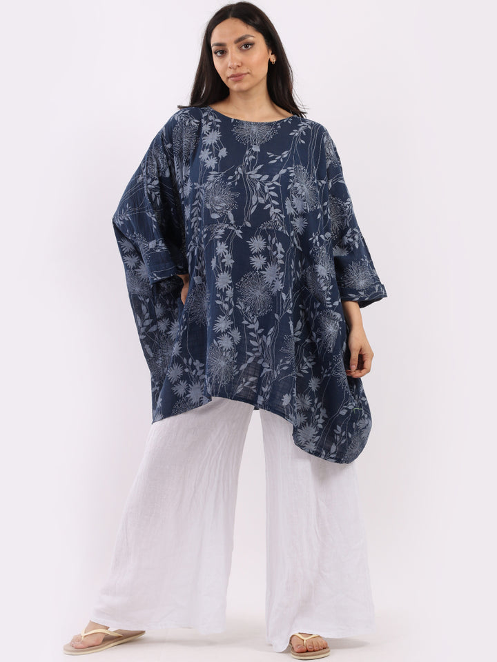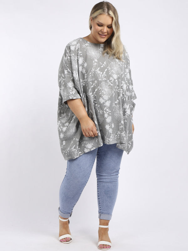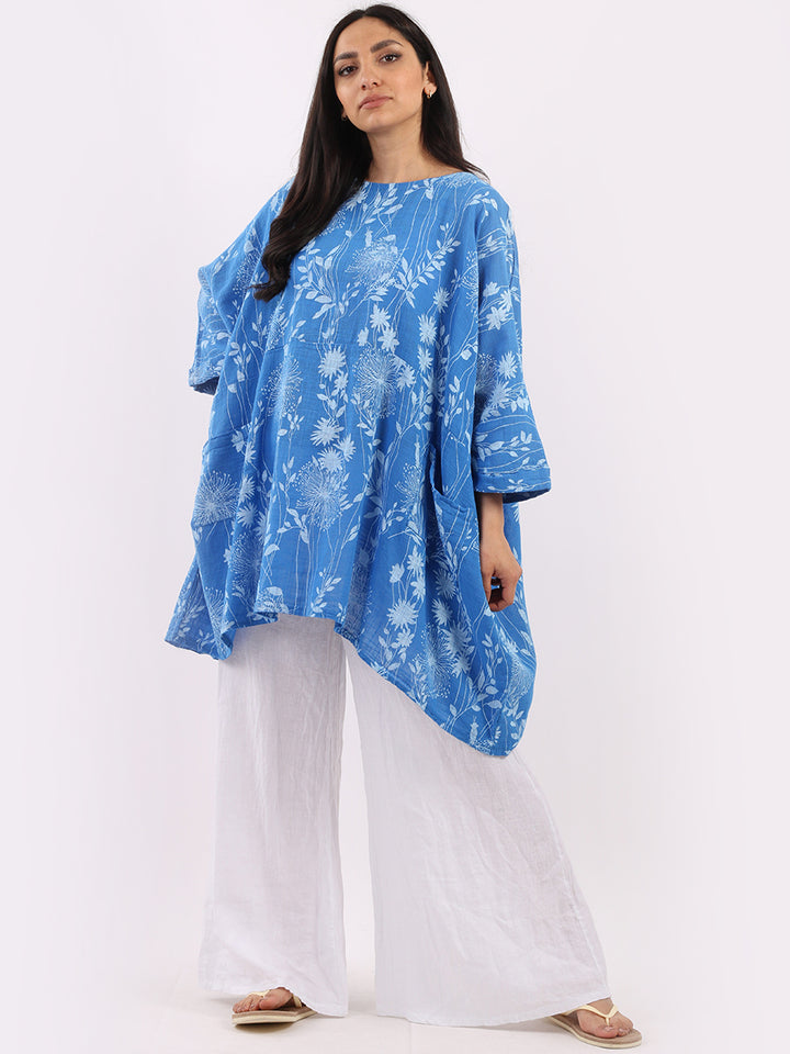 A carefree summer blowing dandelions away is a fantasy that stays young forever! Inspired by childhood fantasies and fun days fashion boutique crafted floral print with vine style tropical leaves in backdrop with oversized dandelions up front. Made in cotton and stitched in Italy the top is batwing style with drappy sides and hem perfect for curvy bodies and seek alike, comfort round neckline and tunic hem makes it unique and adorable. Dress it with white capris and sandals with ankle straps and make a mark of beauty