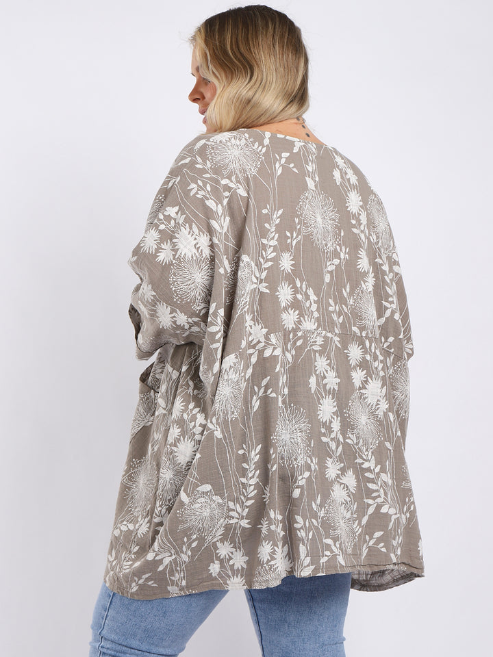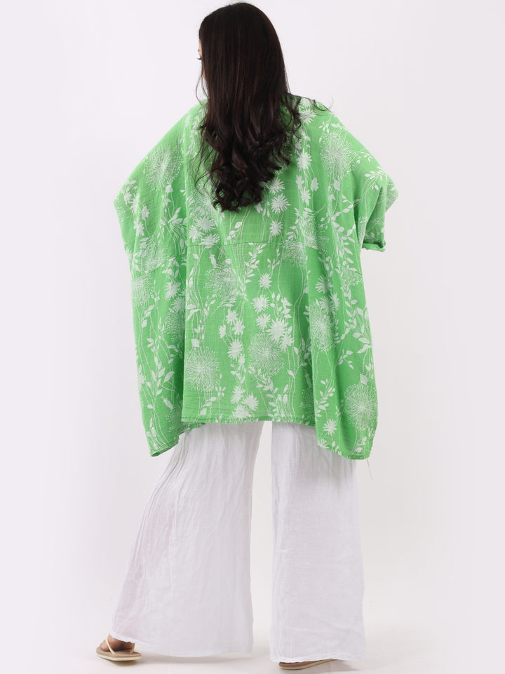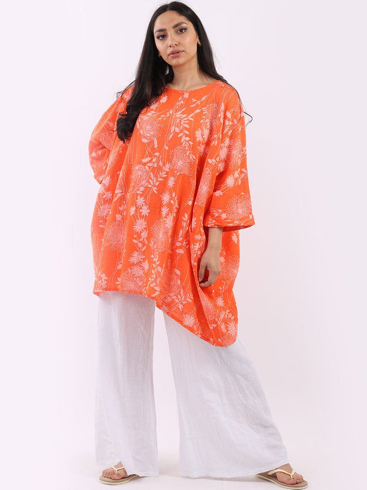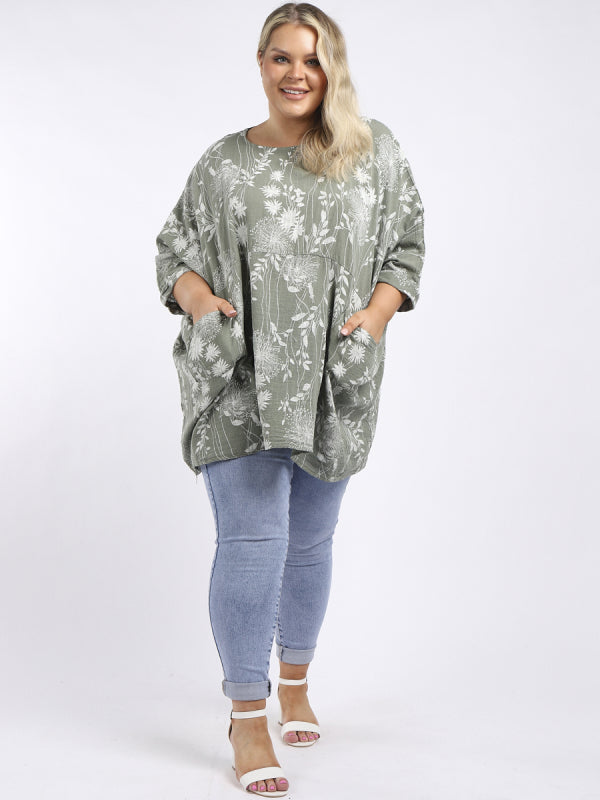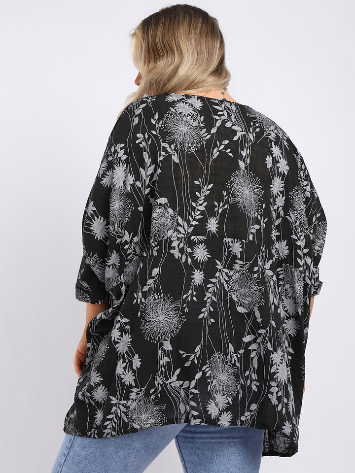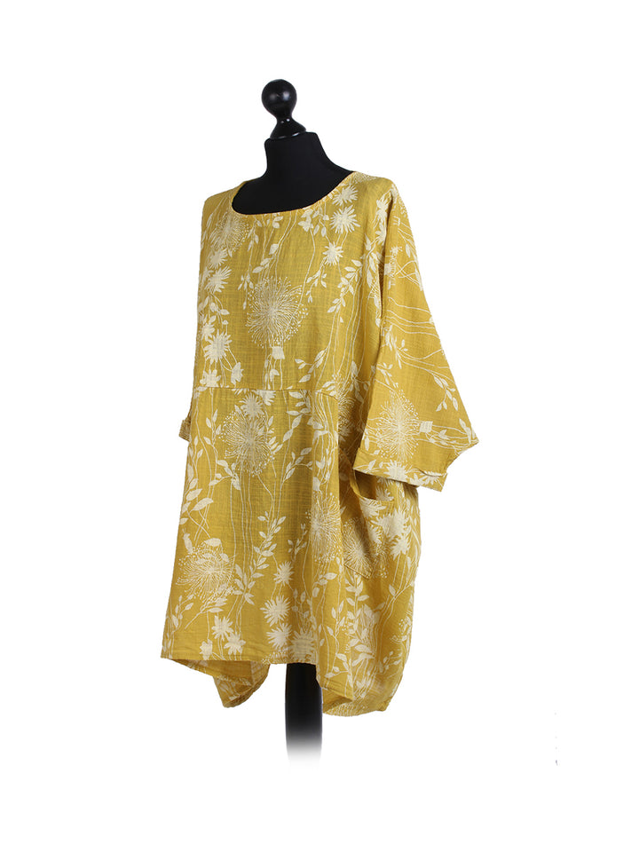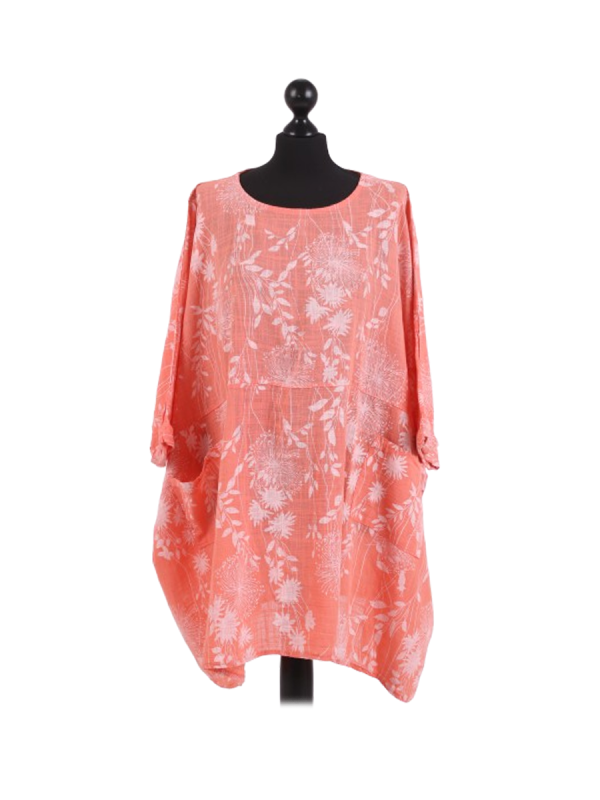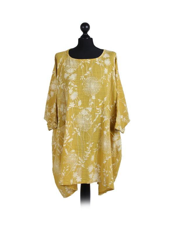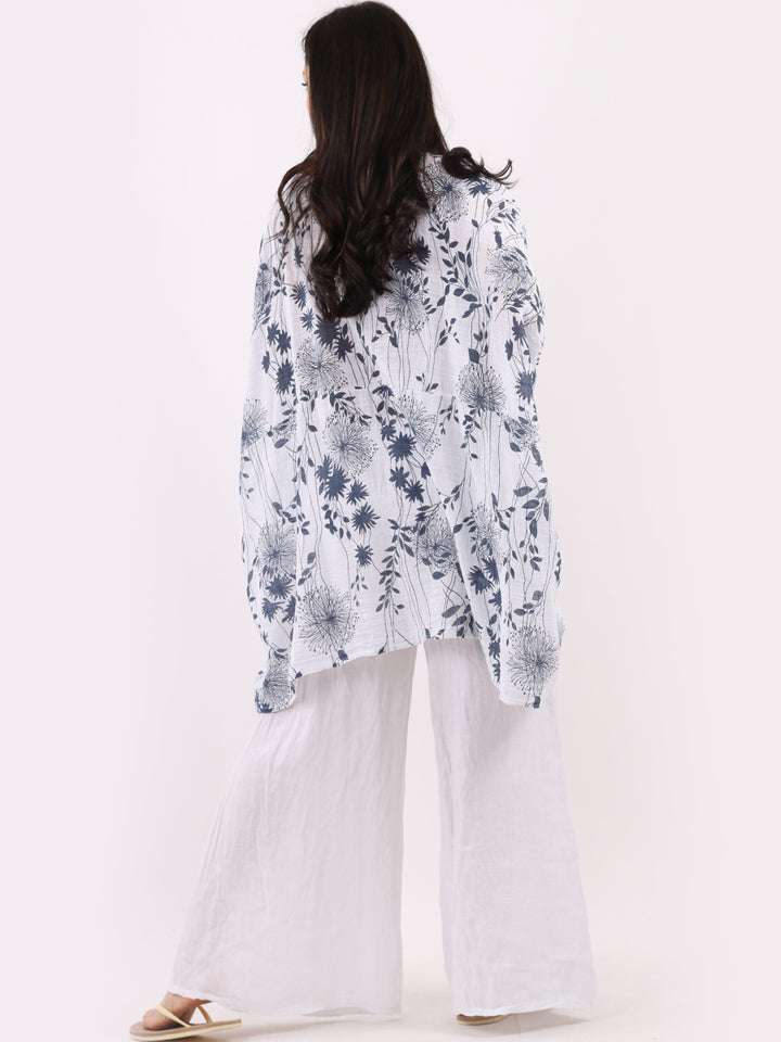 A carefree summer blowing dandelions away is a fantasy that stays young forever! Inspired by childhood fantasies and fun days fashion boutique crafted floral print with vine style tropical leaves in backdrop with oversized dandelions up front. Made in cotton and stitched in Italy the top is batwing style with drappy sides and hem perfect for curvy bodies and seek alike, comfort round neckline and tunic hem makes it unique and adorable. Dress it with white capris and sandals with ankle straps and make a mark of beauty
