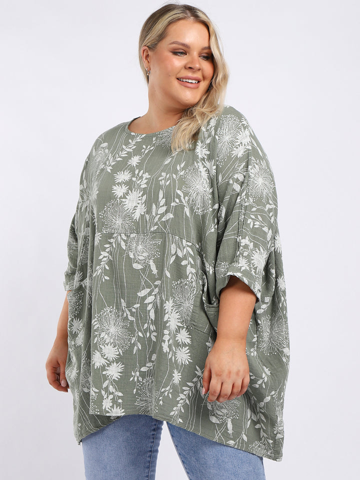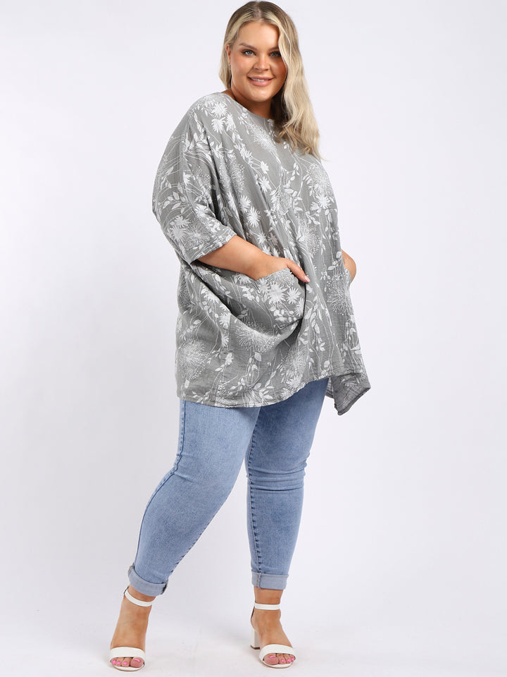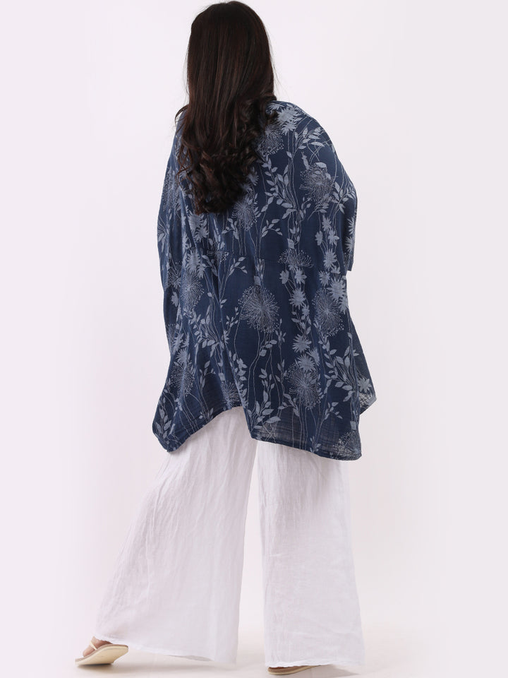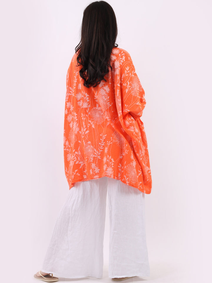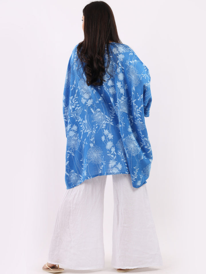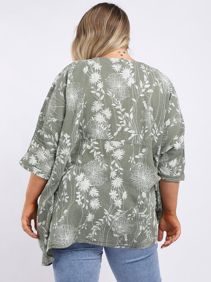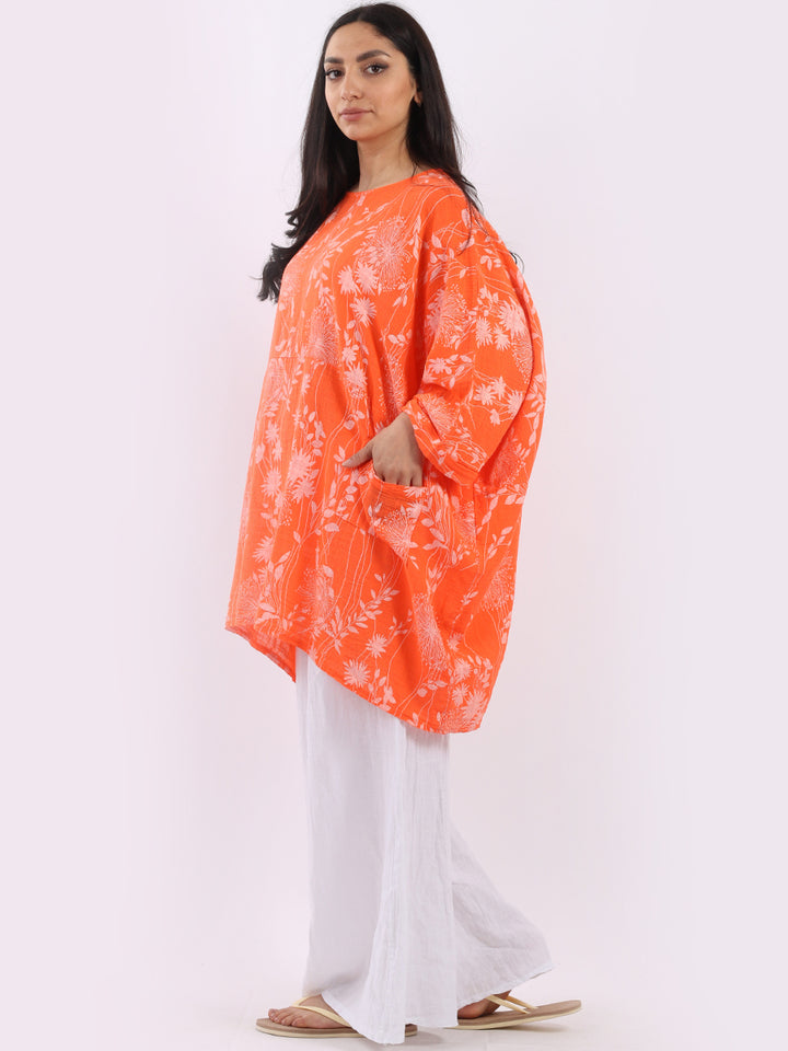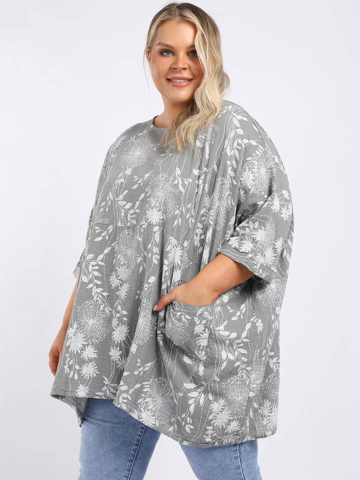 A carefree summer blowing dandelions away is a fantasy that stays young forever! Inspired by childhood fantasies and fun days fashion boutique crafted floral print with vine style tropical leaves in backdrop with oversized dandelions up front. Made in cotton and stitched in Italy the top is batwing style with drappy sides and hem perfect for curvy bodies and seek alike, comfort round neckline and tunic hem makes it unique and adorable. Dress it with white capris and sandals with ankle straps and make a mark of beauty